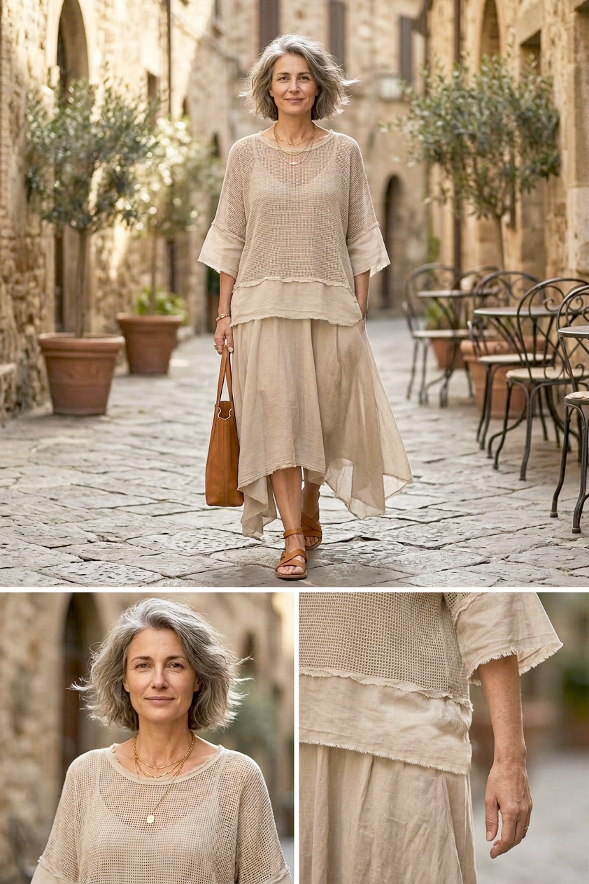 The lightweight fabric and thoughtful design make it an ideal choice for warmer weather, while the layered approach allows for year-round styling possibilities.