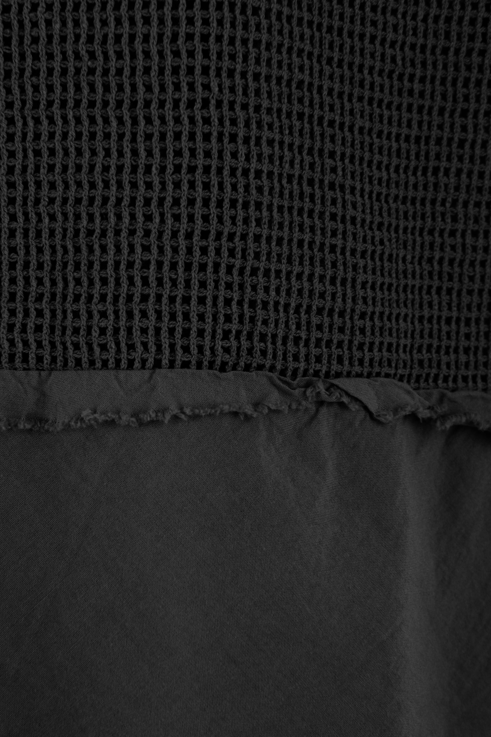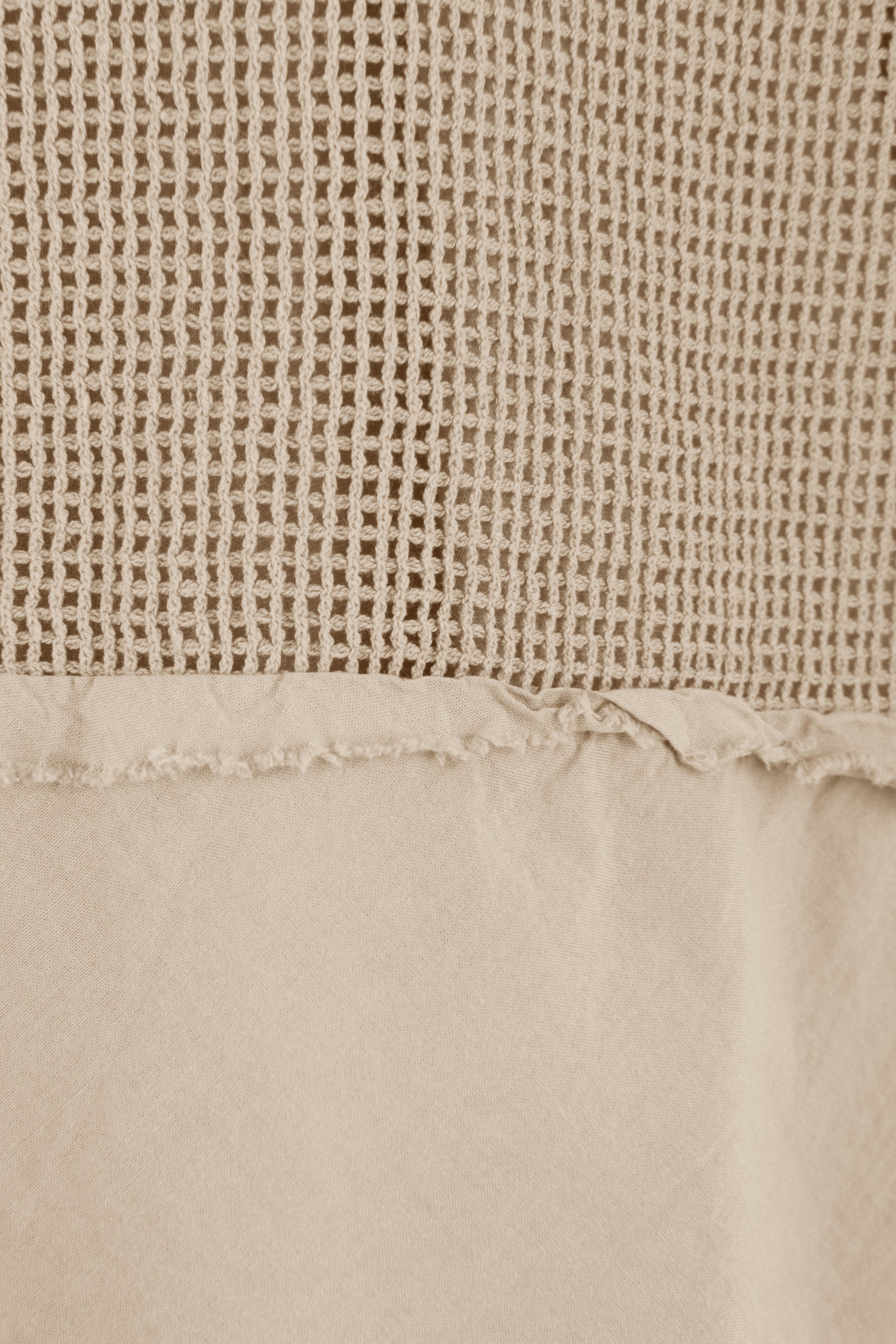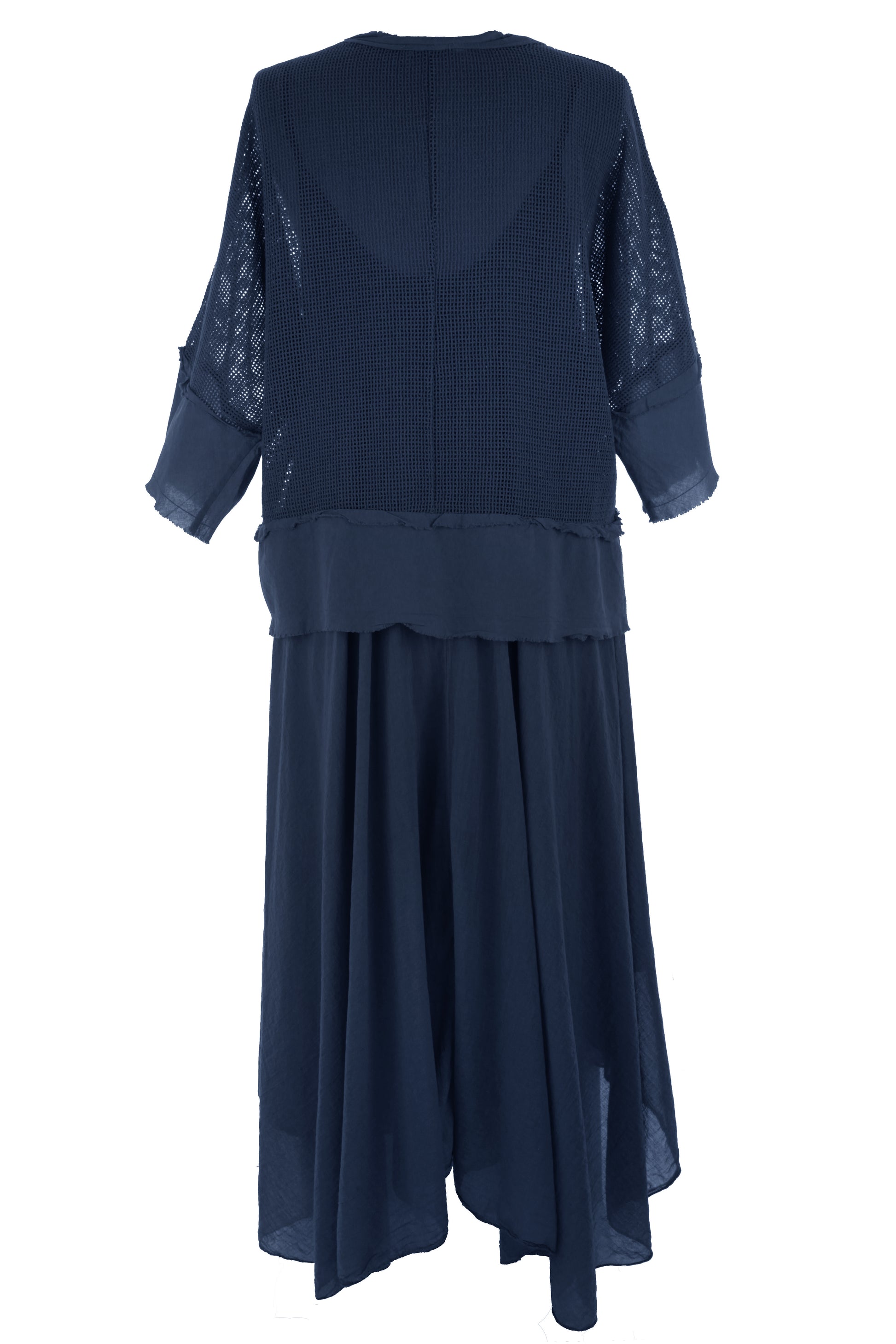 The set features a relaxed-fit mesh shrug top with frayed detailing along the hem and cuffs and a flowing, layered midi dress that creates an elegant silhouette.