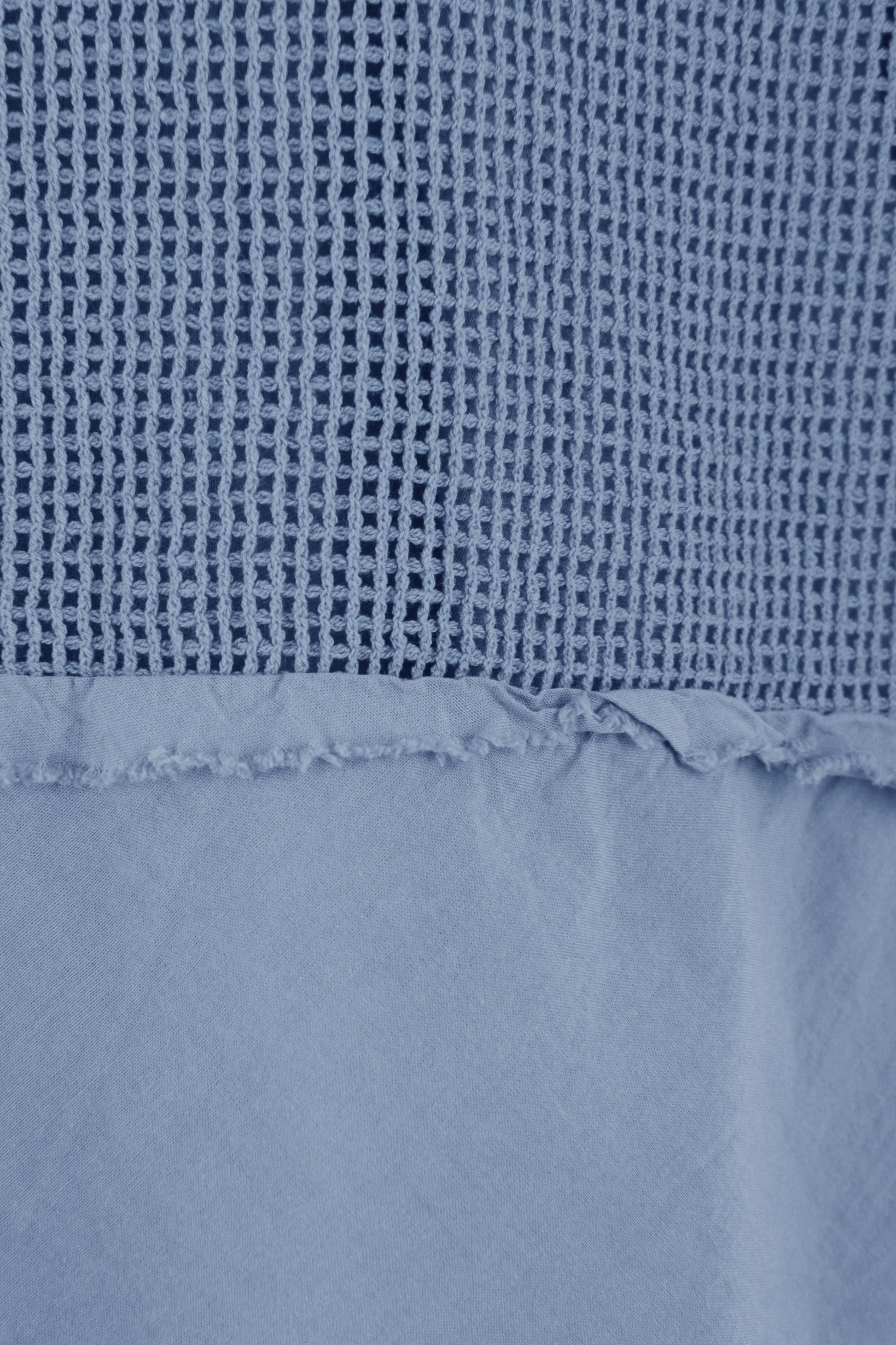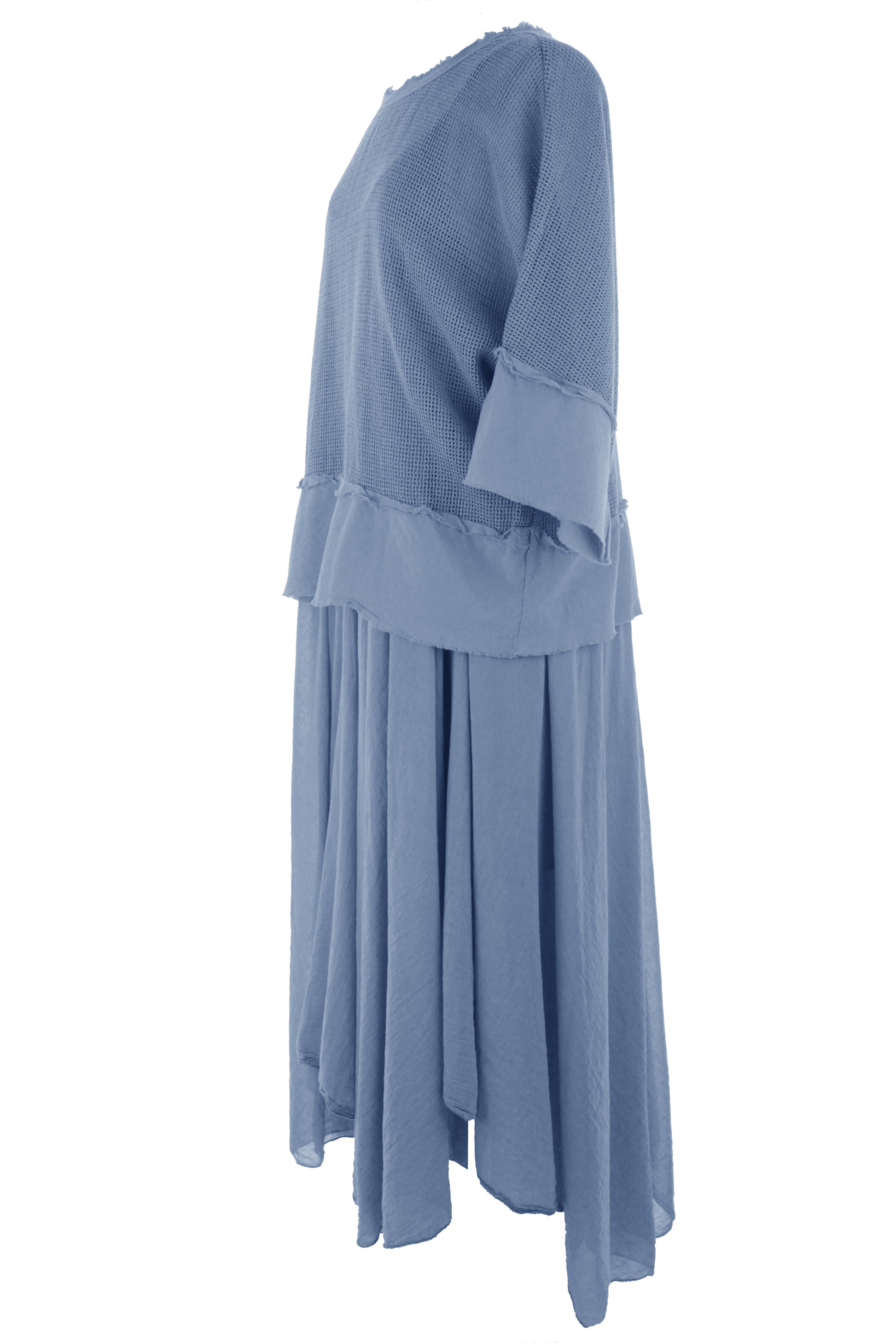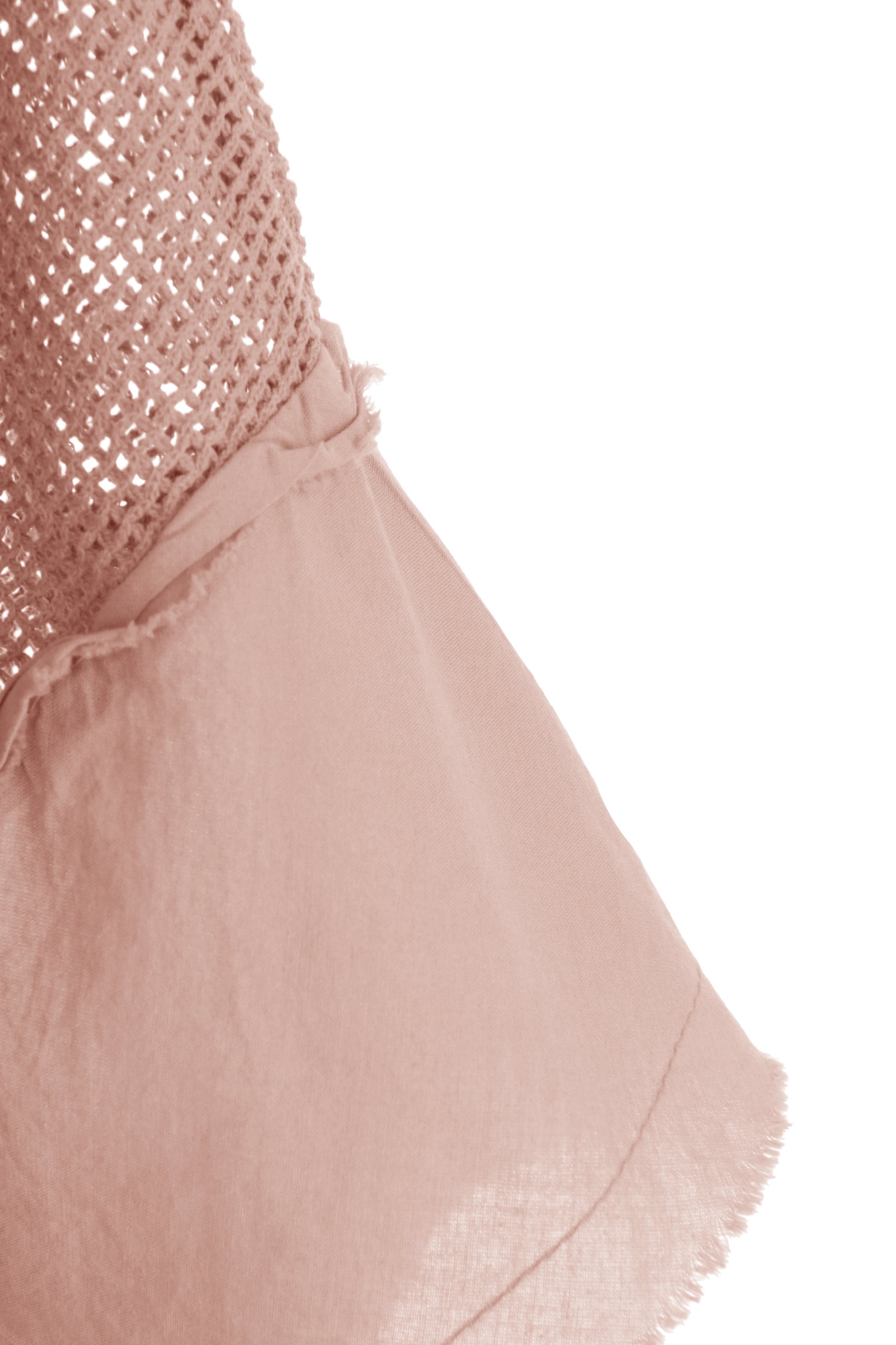 The set features a relaxed-fit mesh shrug top with frayed detailing along the hem and cuffs and a flowing, layered midi dress that creates an elegant silhouette.