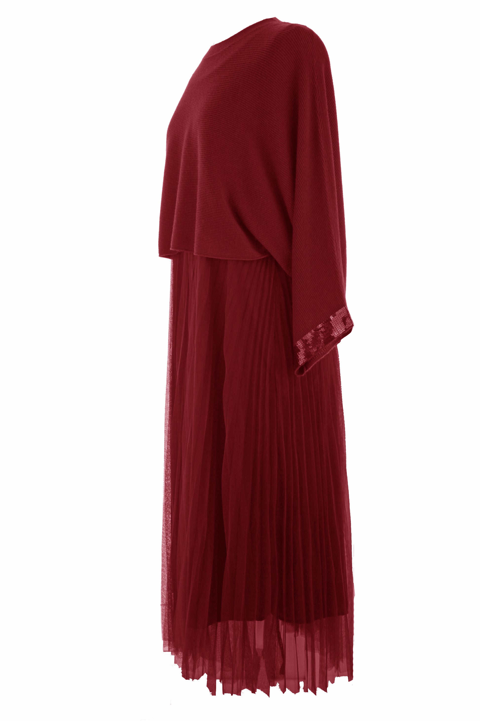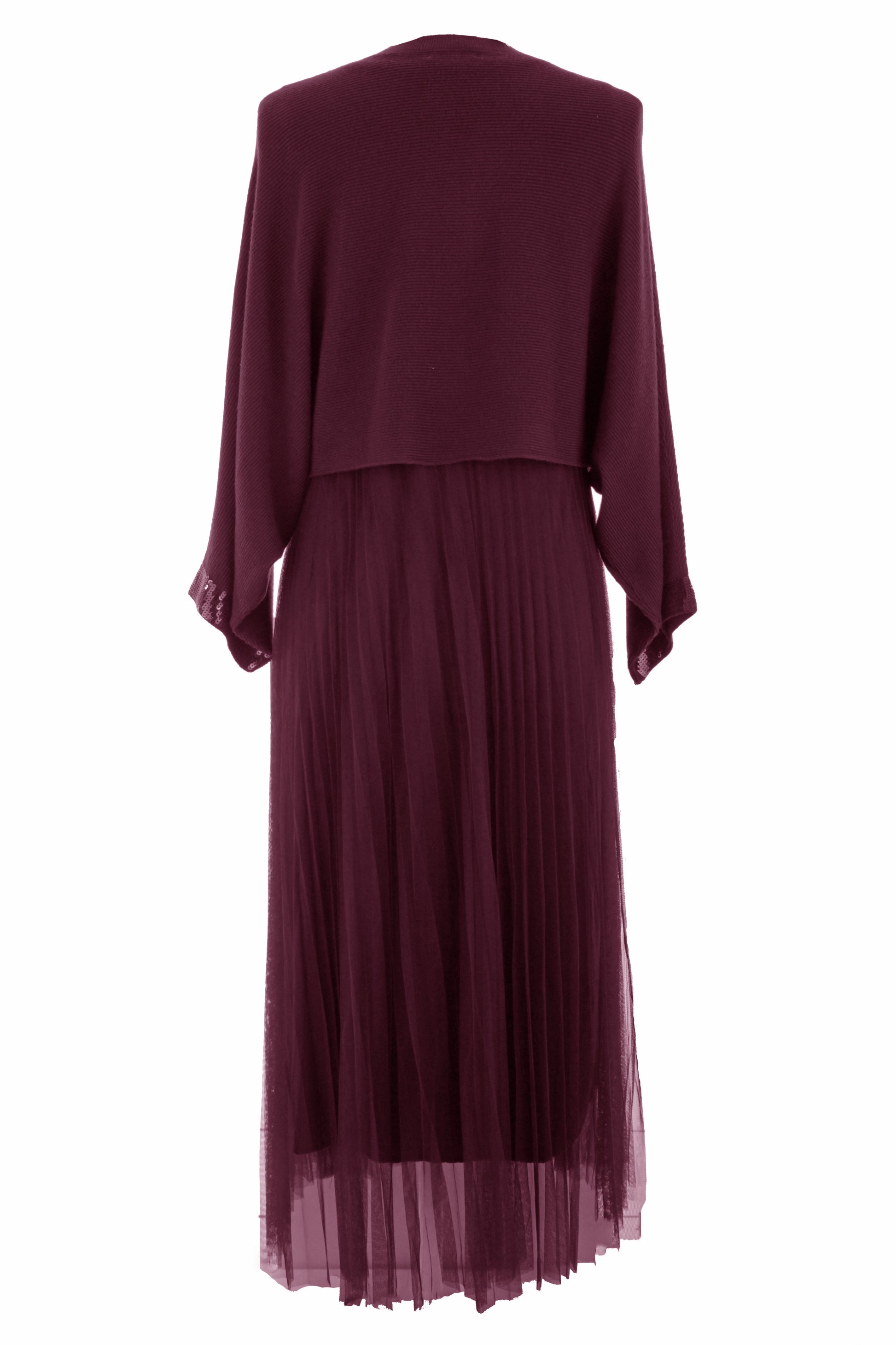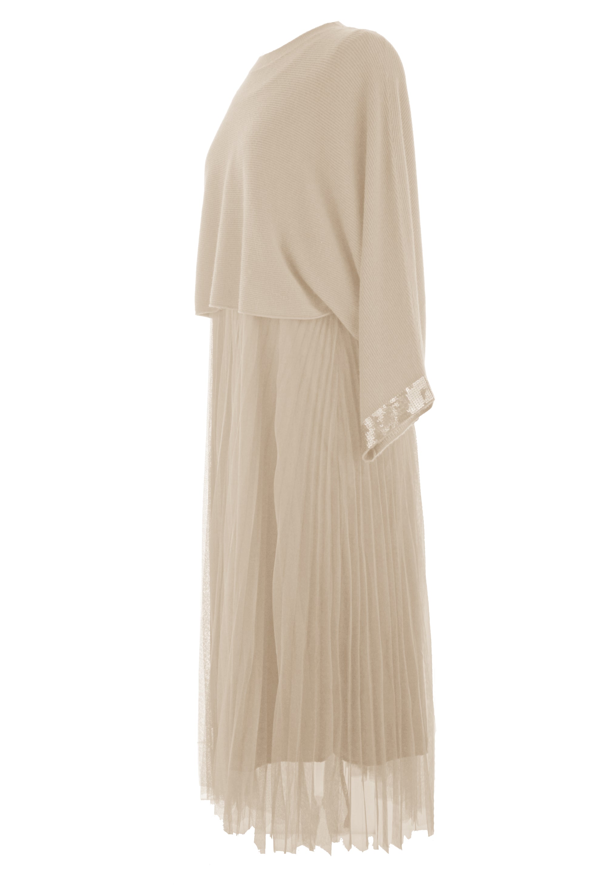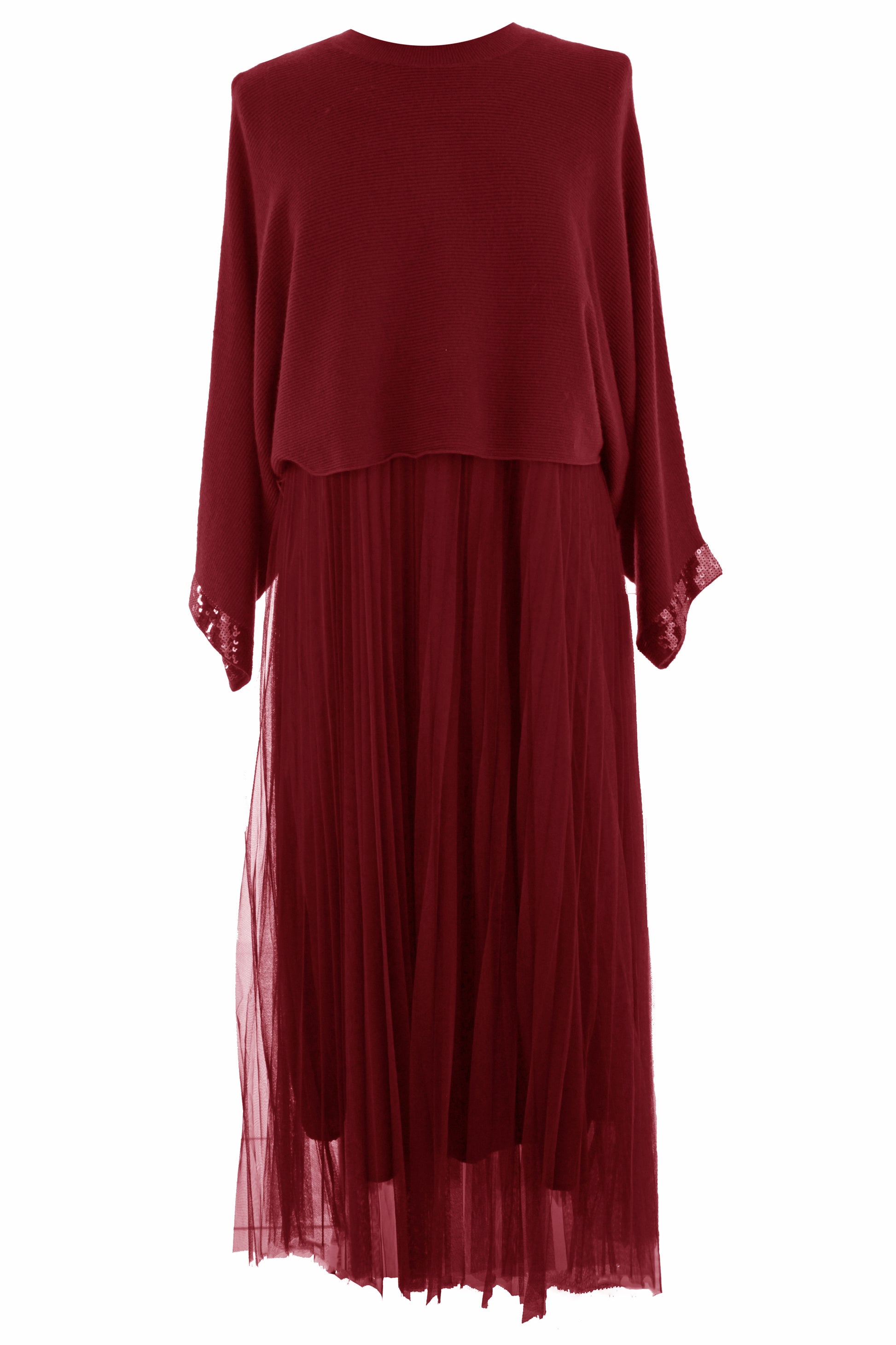 The layered construction pairs the comfortable knit top with a separate sleeveless slip lining with lower half has a romantic tulle mesh skirt, creating a stunning silhouette that effortlessly transitions from day to evening wear.