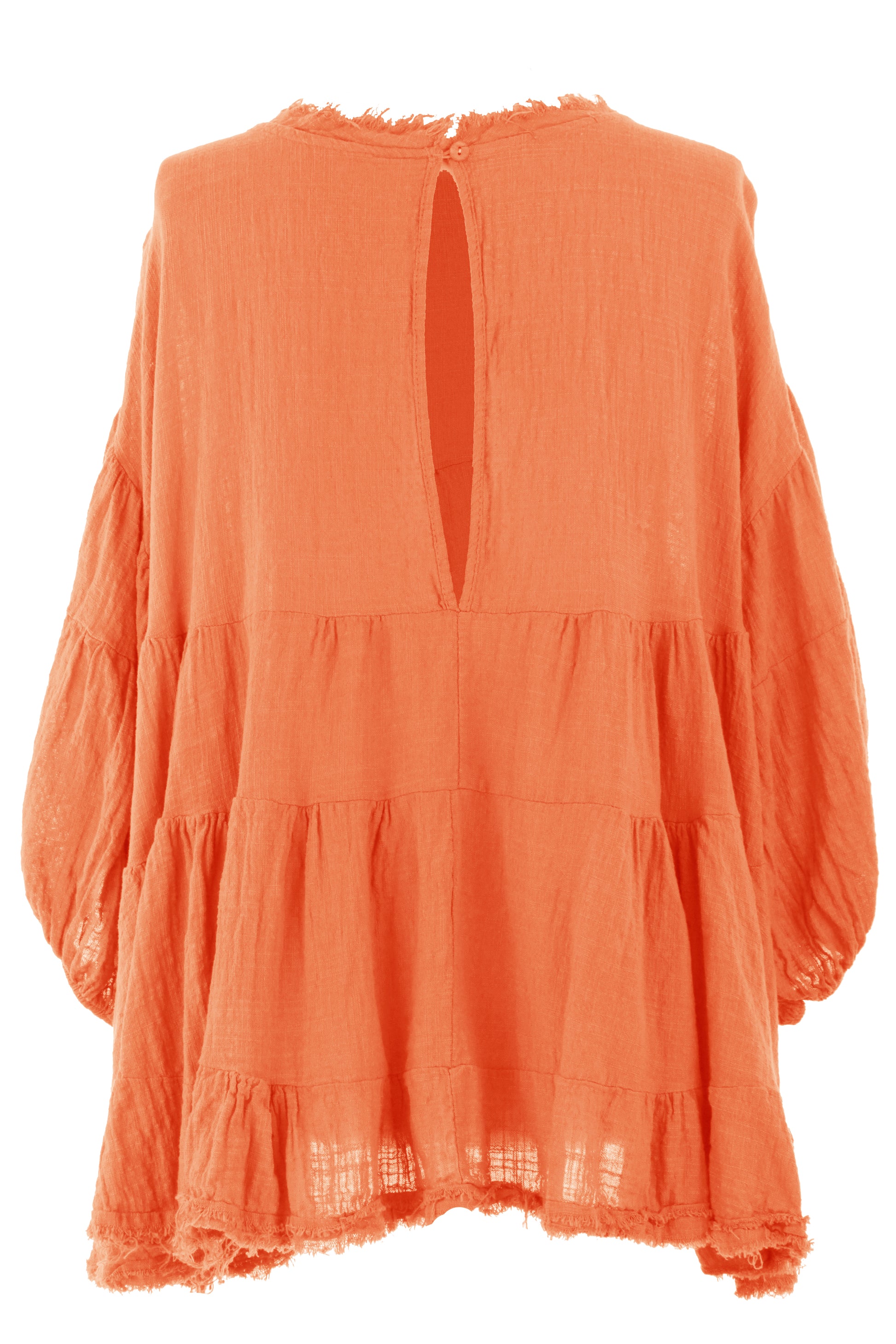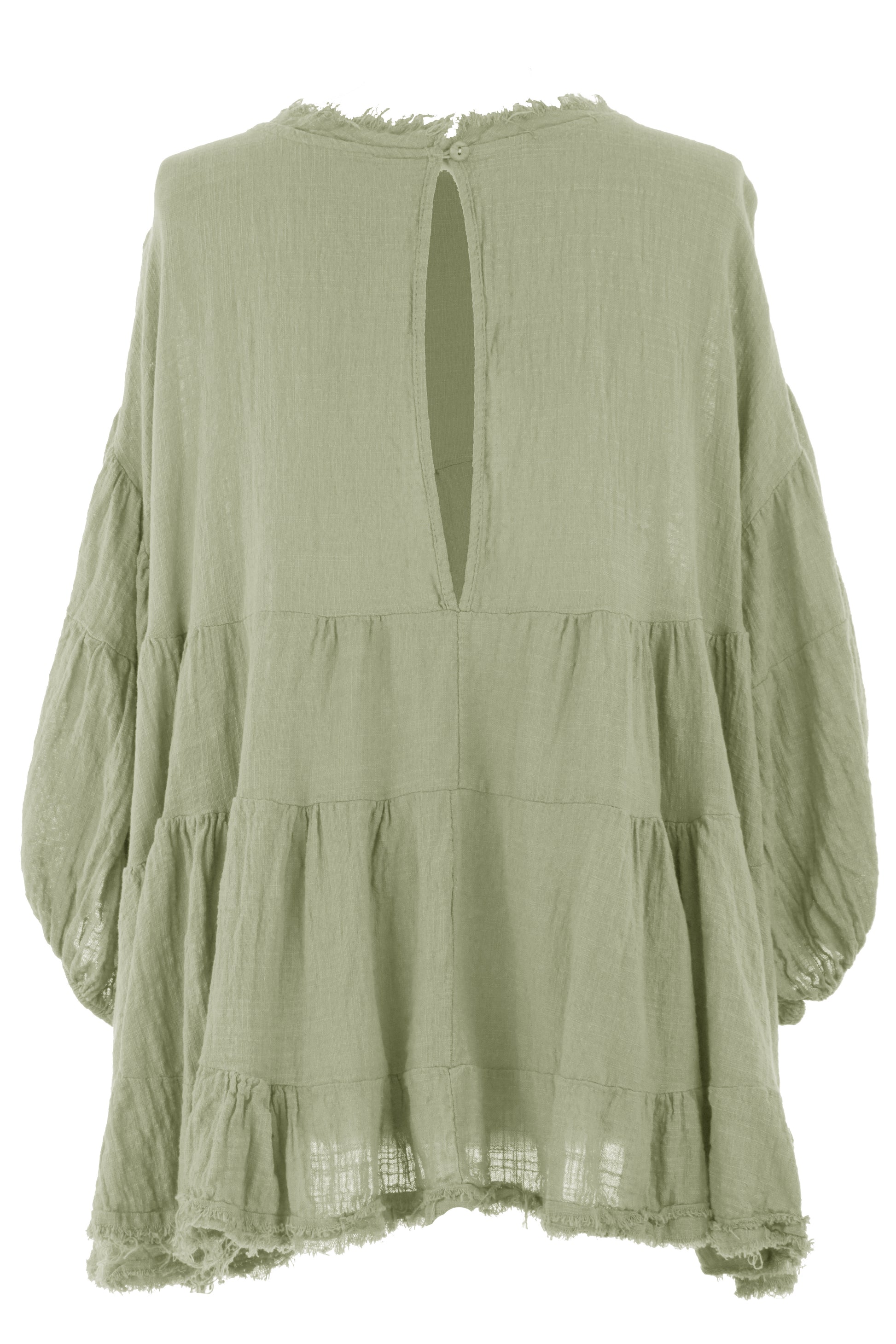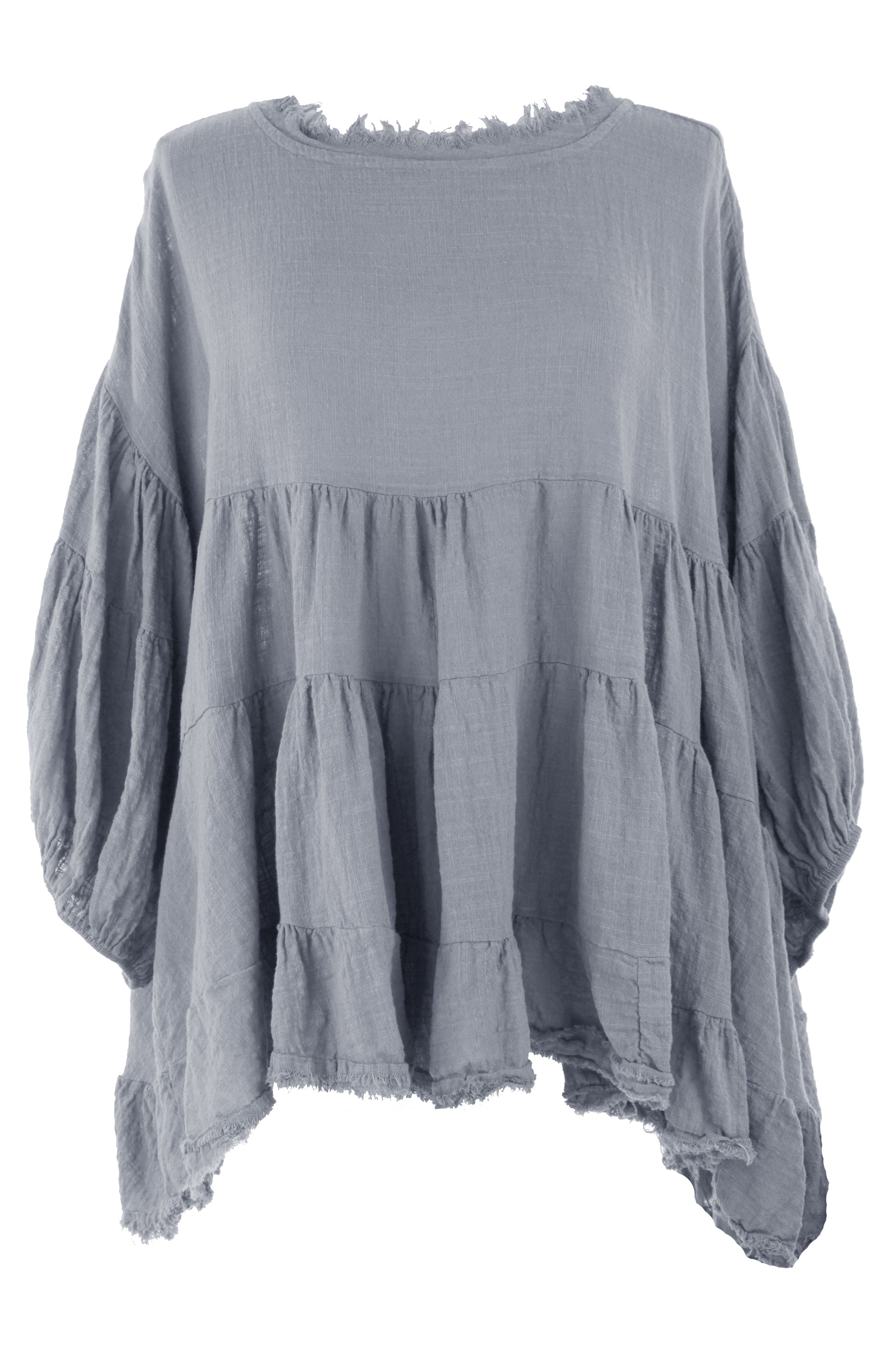 - Crafted from pure cotton material, this tiered top is designed in a loose oversized fit, it features 3/4 balloon sleeves, raw edge scoop neck with keyhole button closure at back and finished with raw edge hemline.