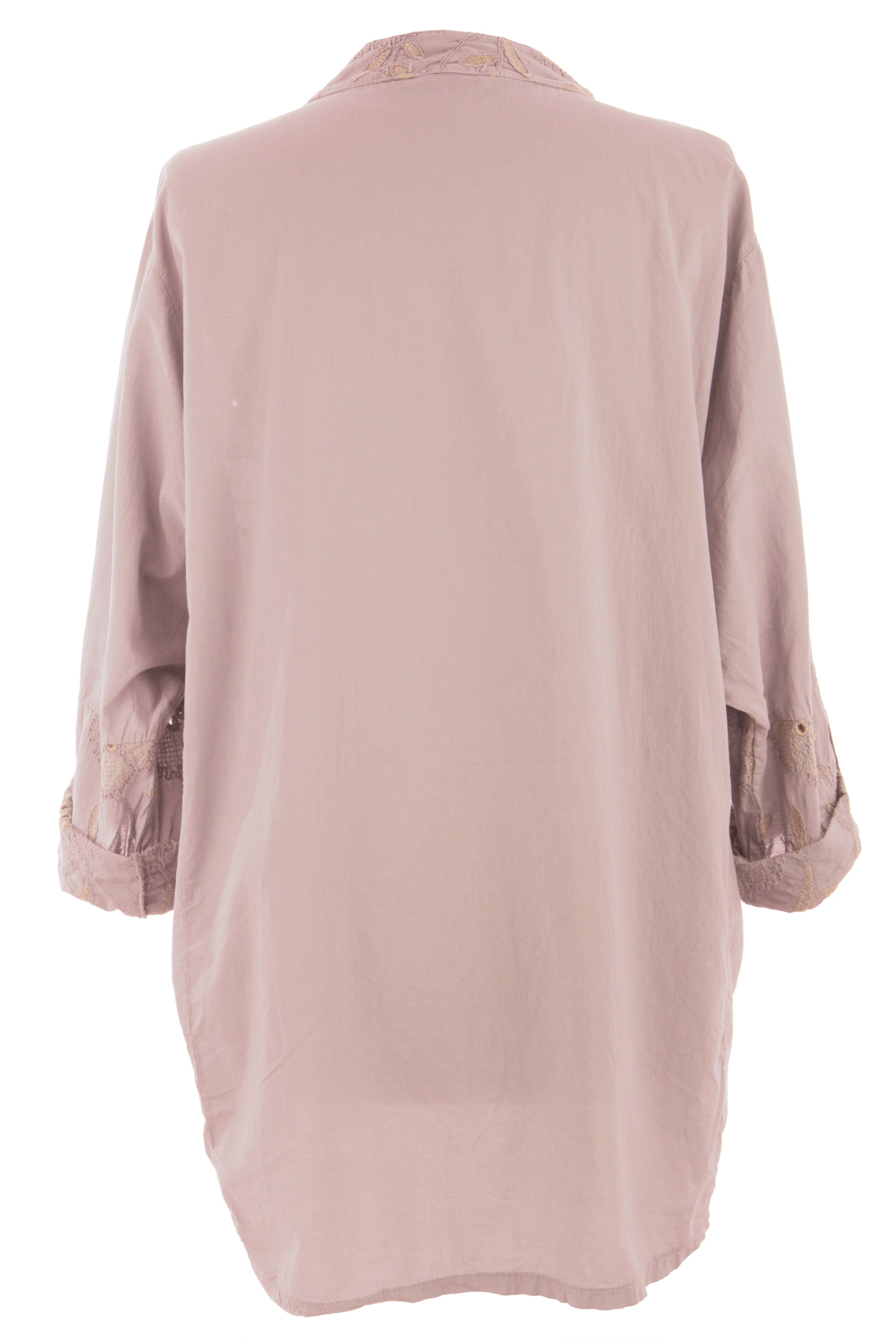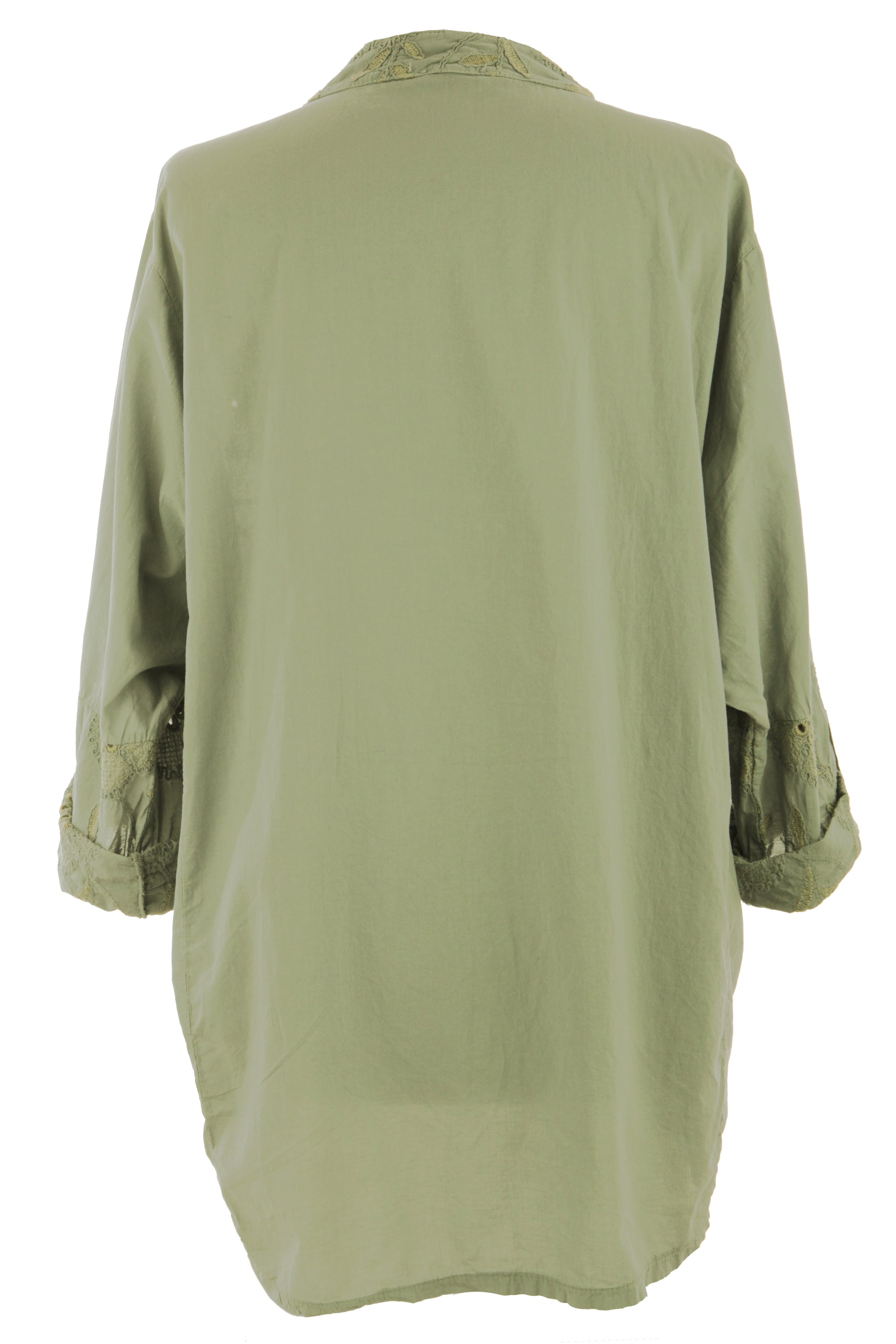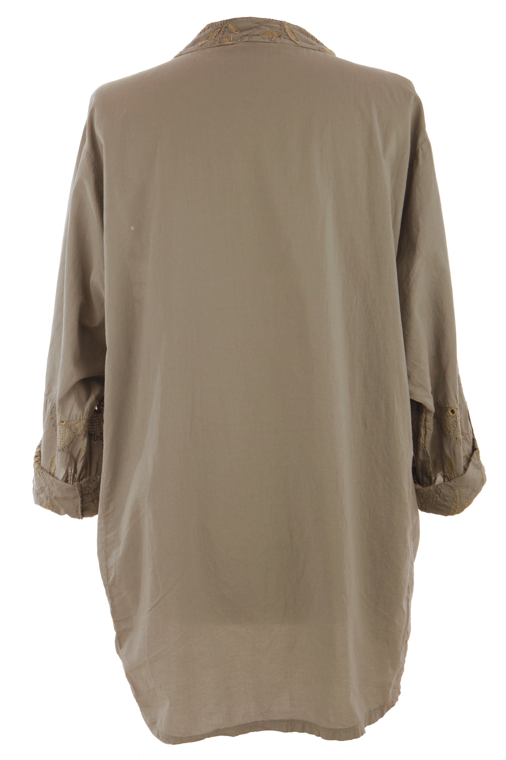 This versatile piece showcases a sophisticated band collar with a flattering V-neckline, complemented by fashionable batwing long sleeves that can be rolled up for added style versatility and asymmetric hi-low hemline.