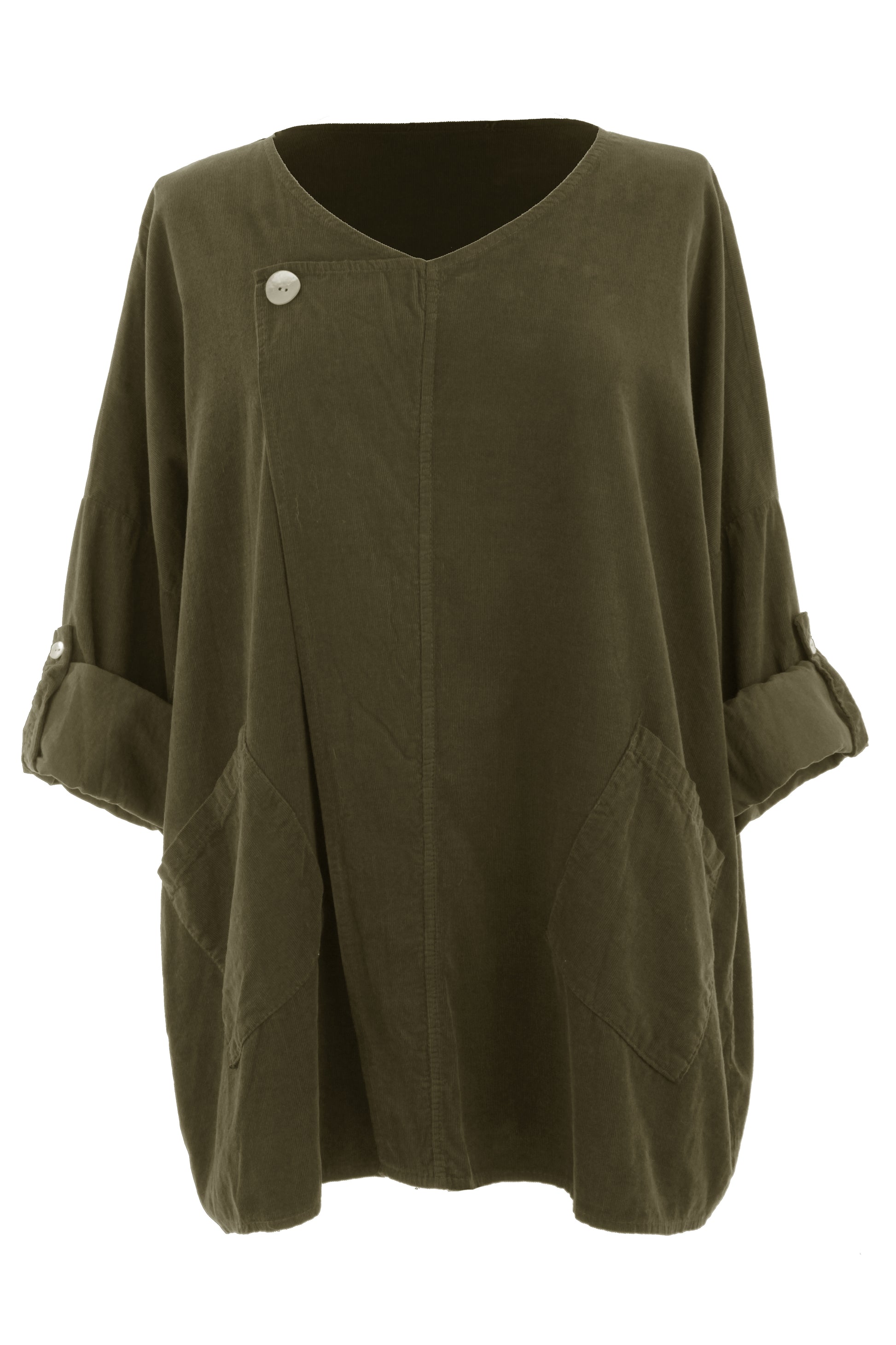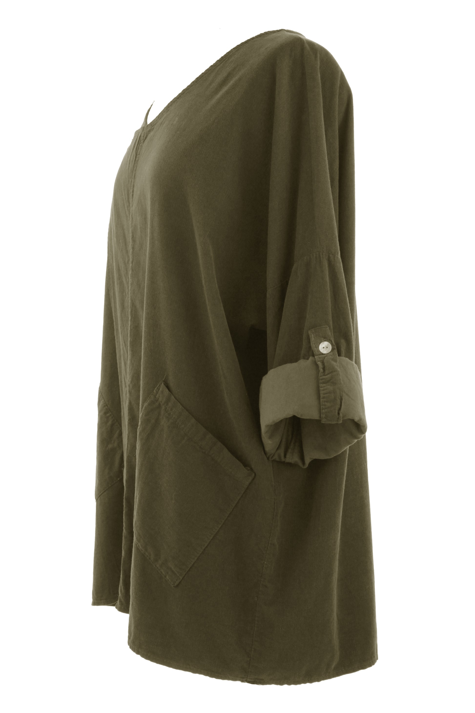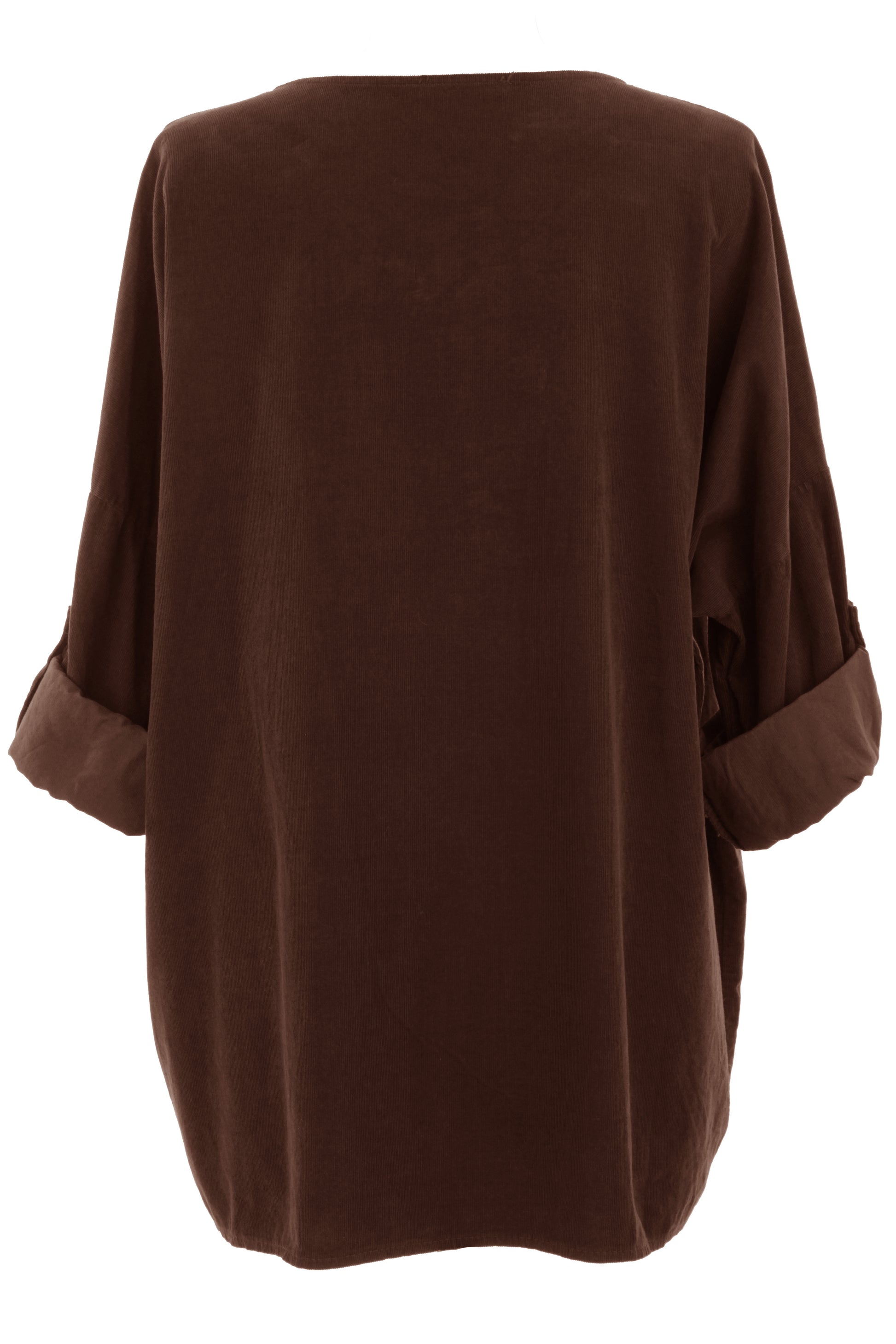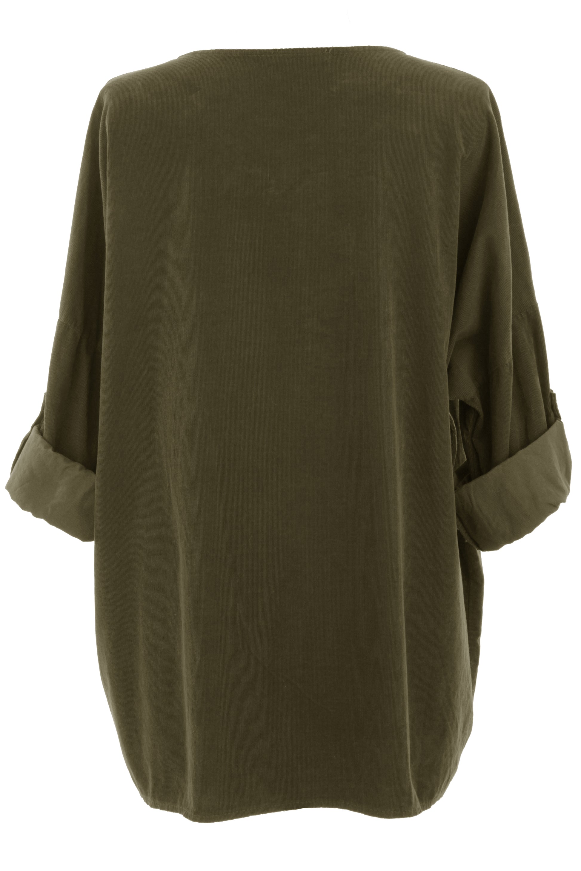 Crafted from soft and durable corduroy fabric, this top features a flattering V-neckline and turn-up button batwing long sleeves for versatile styling.