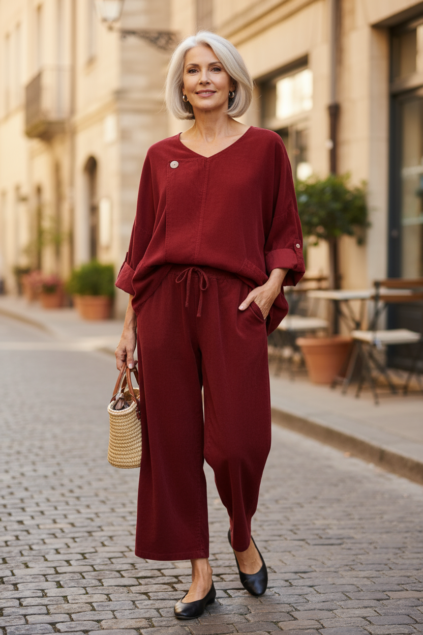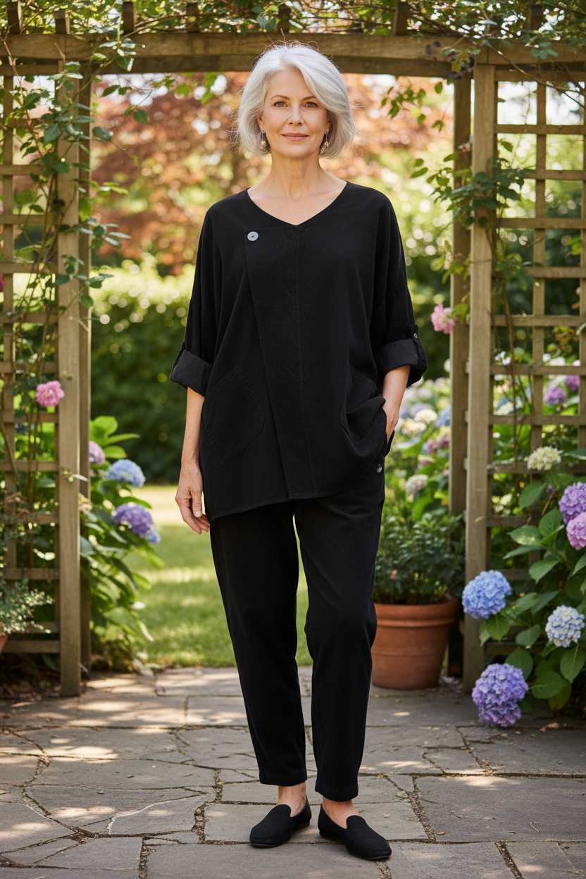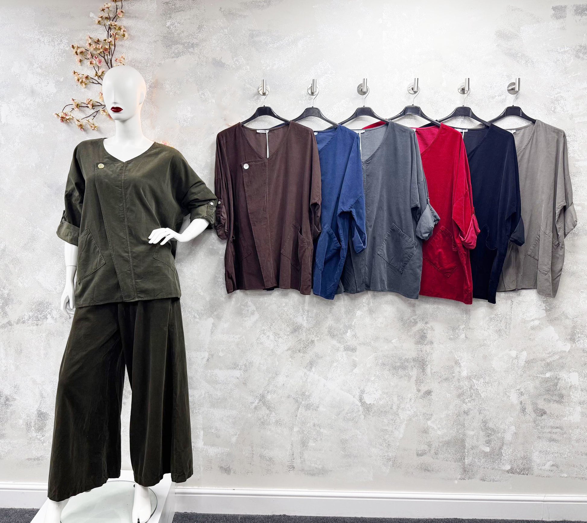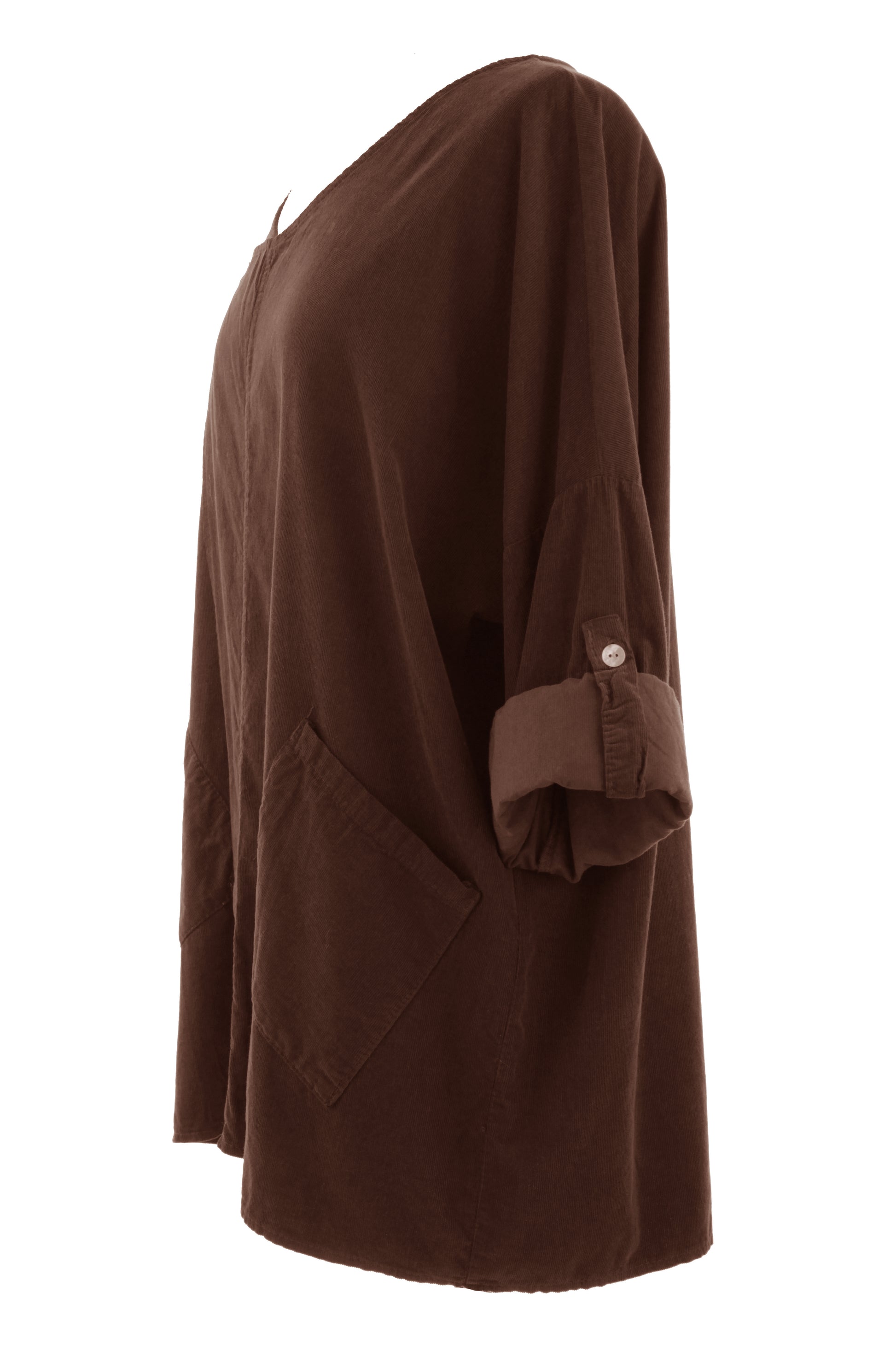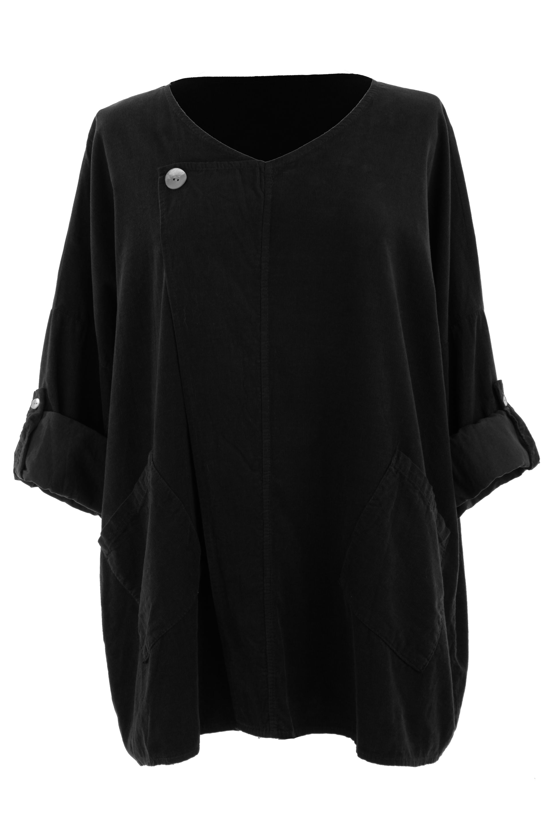 Crafted from soft and durable corduroy fabric, this top features a flattering V-neckline and turn-up button batwing long sleeves for versatile styling.