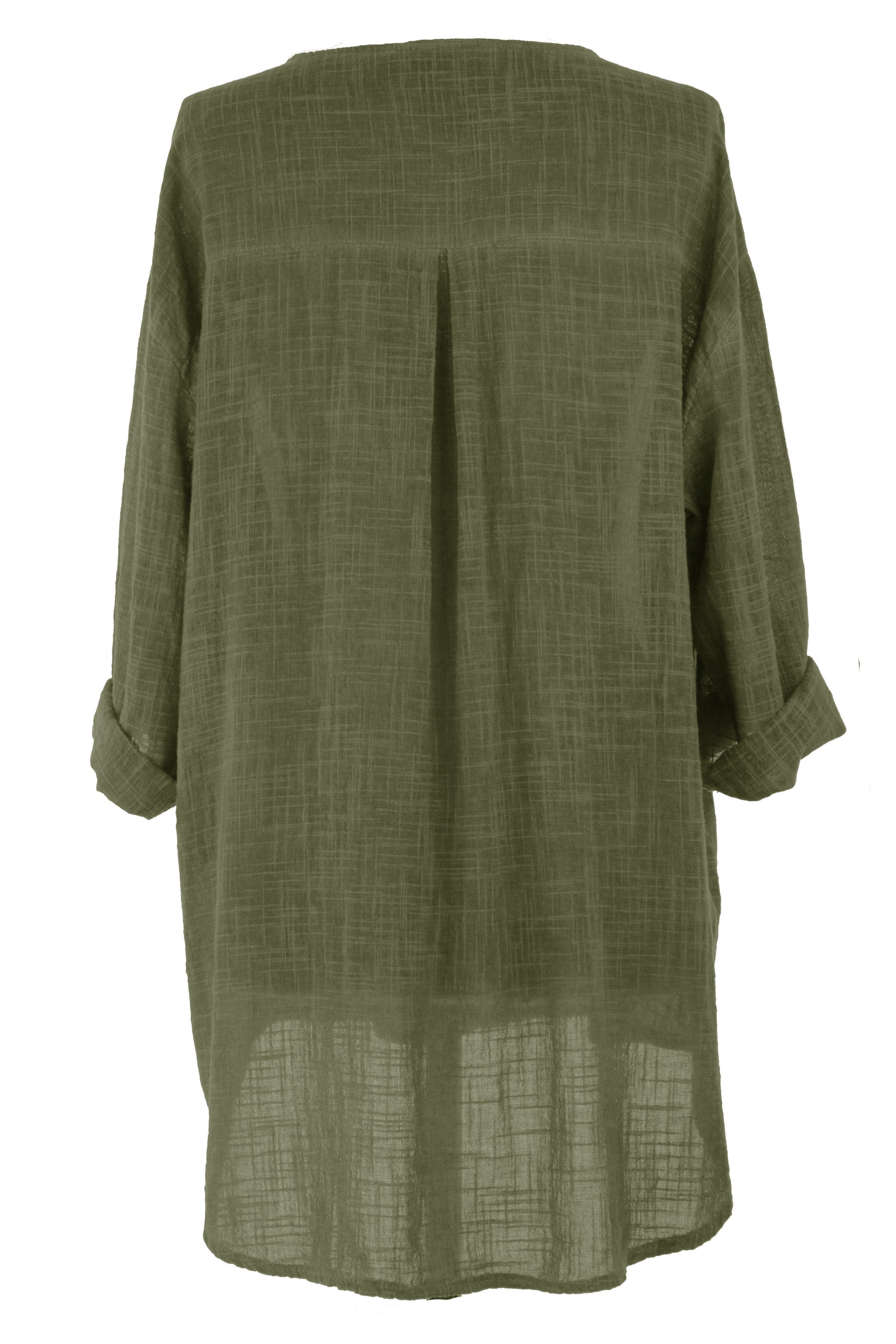 This cotton top features a flattering V cut-out neckline complemented by a single decorative button detail, creating an elegant focal point.