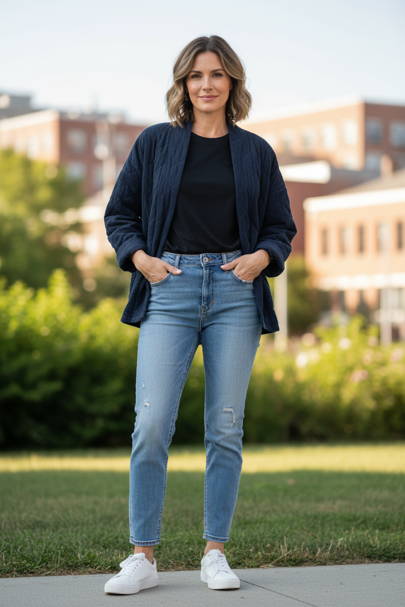 Two practical pockets provide convenient storage for your essentials, while the open-front style allows for effortless wearing.