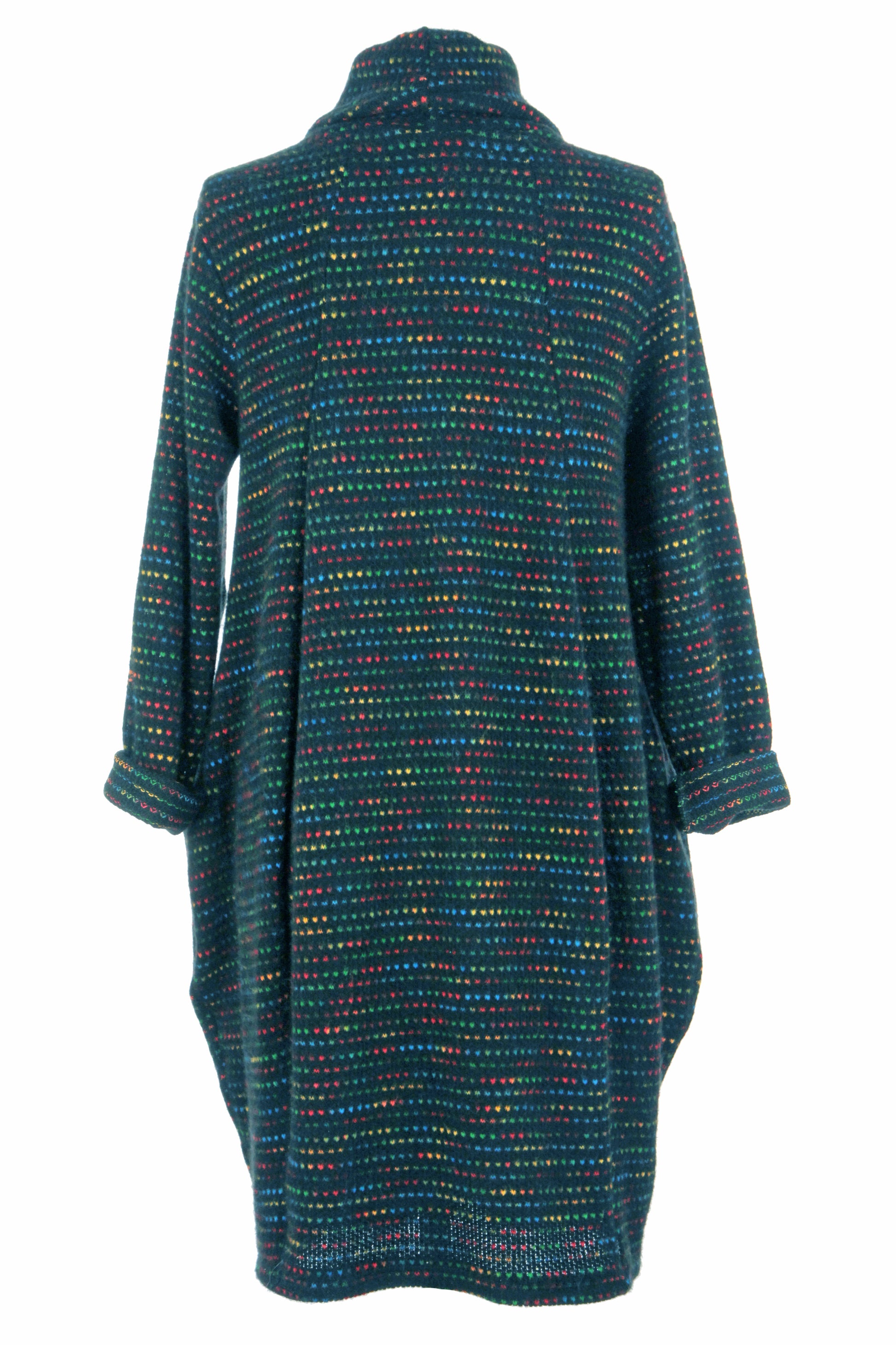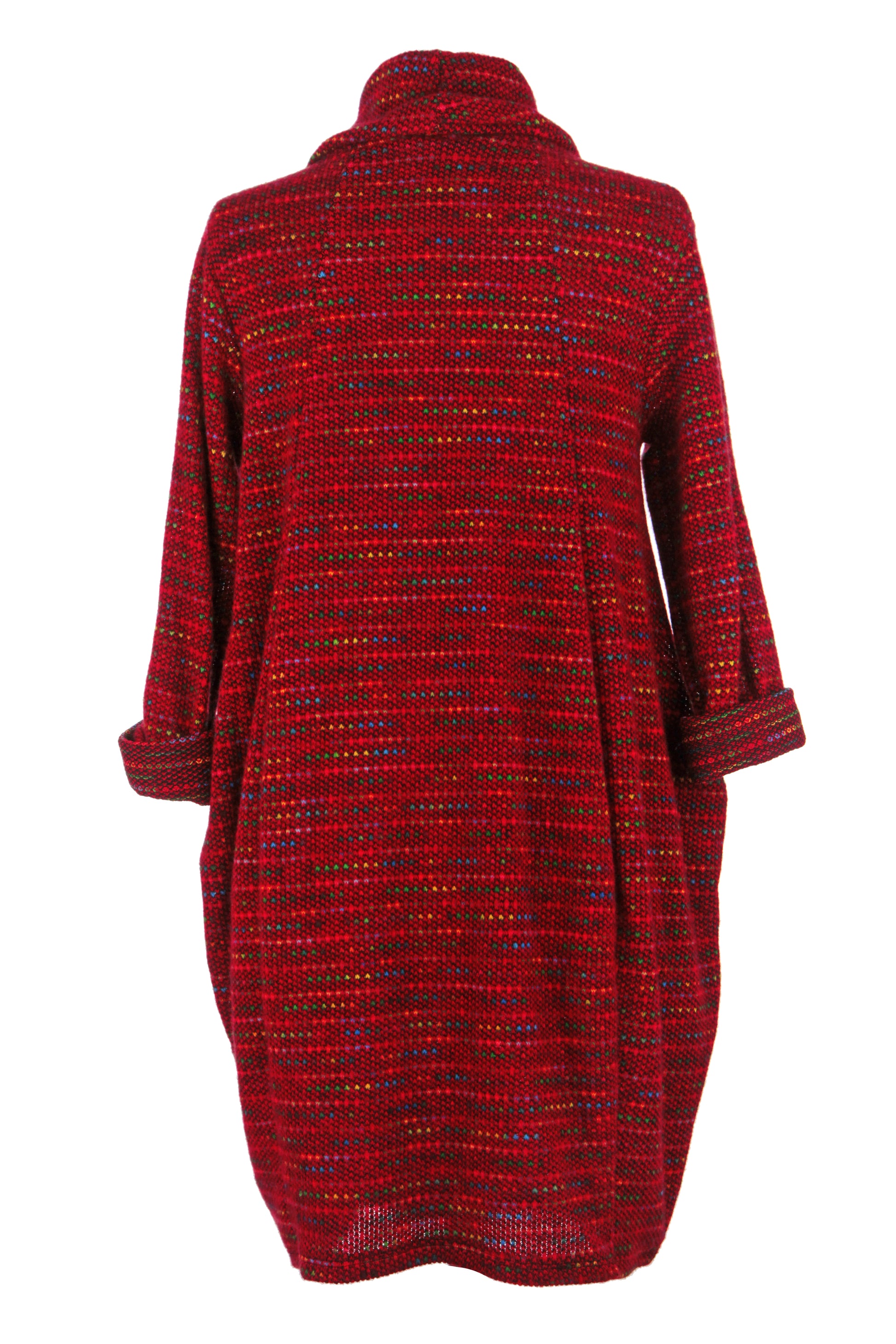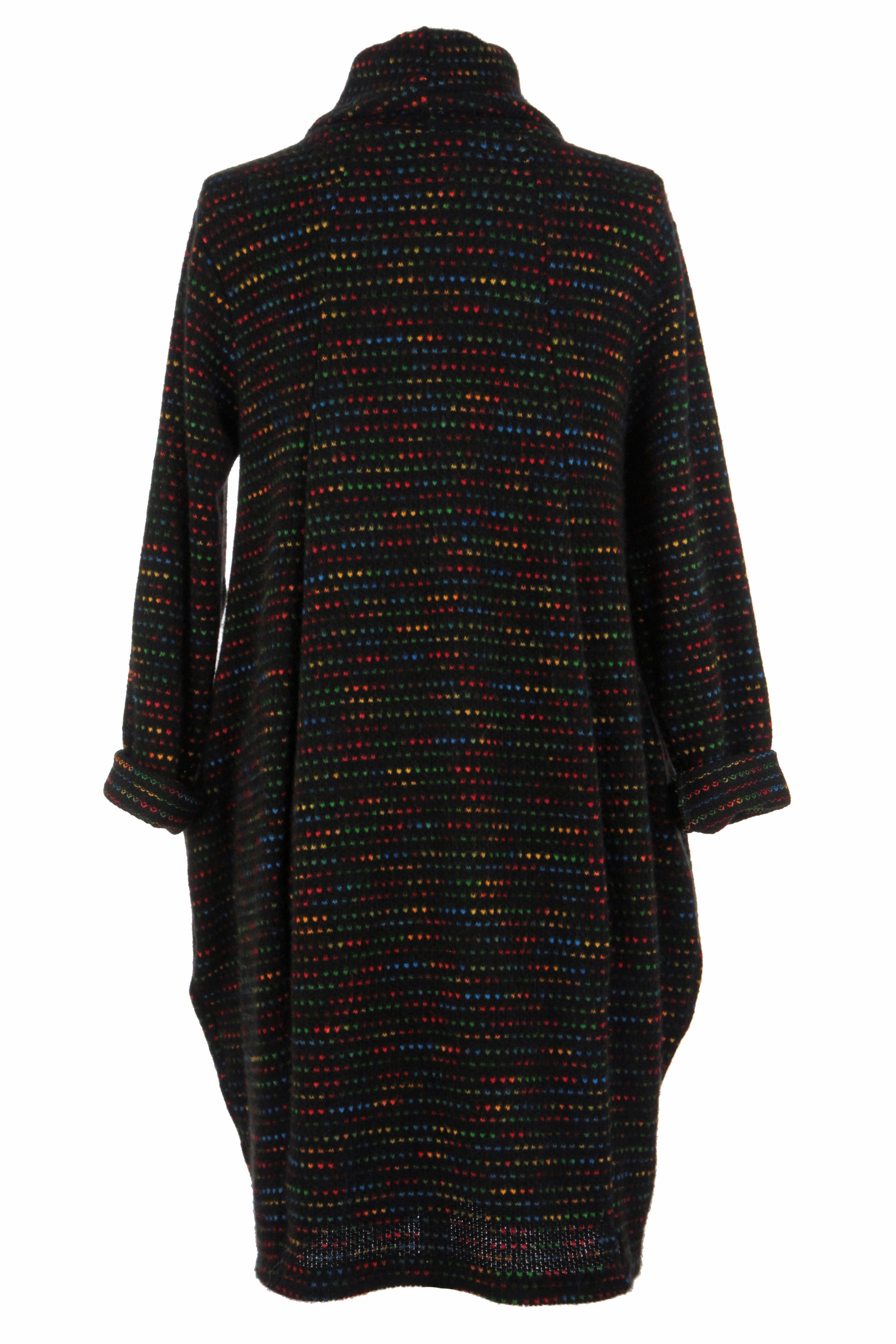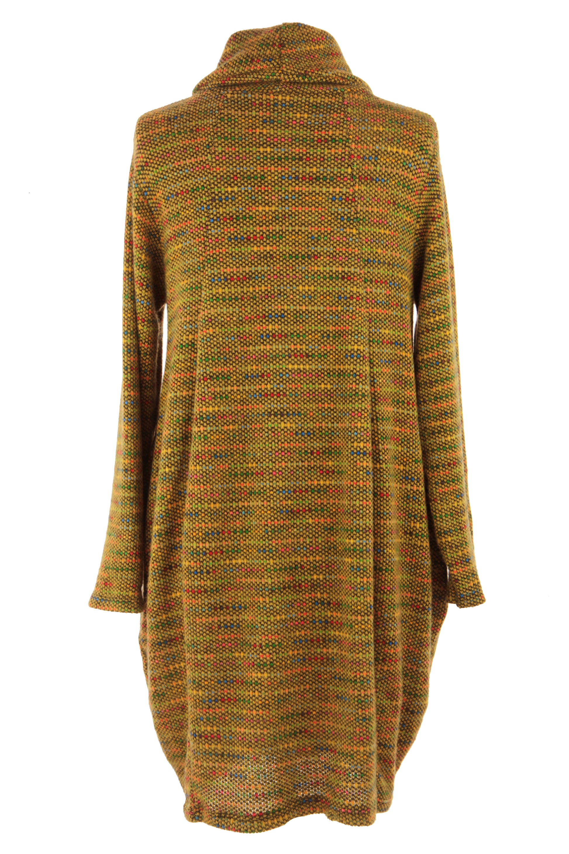 The distinctive flecked pattern in autumnal tones creates a captivating visual texture throughout the garment.