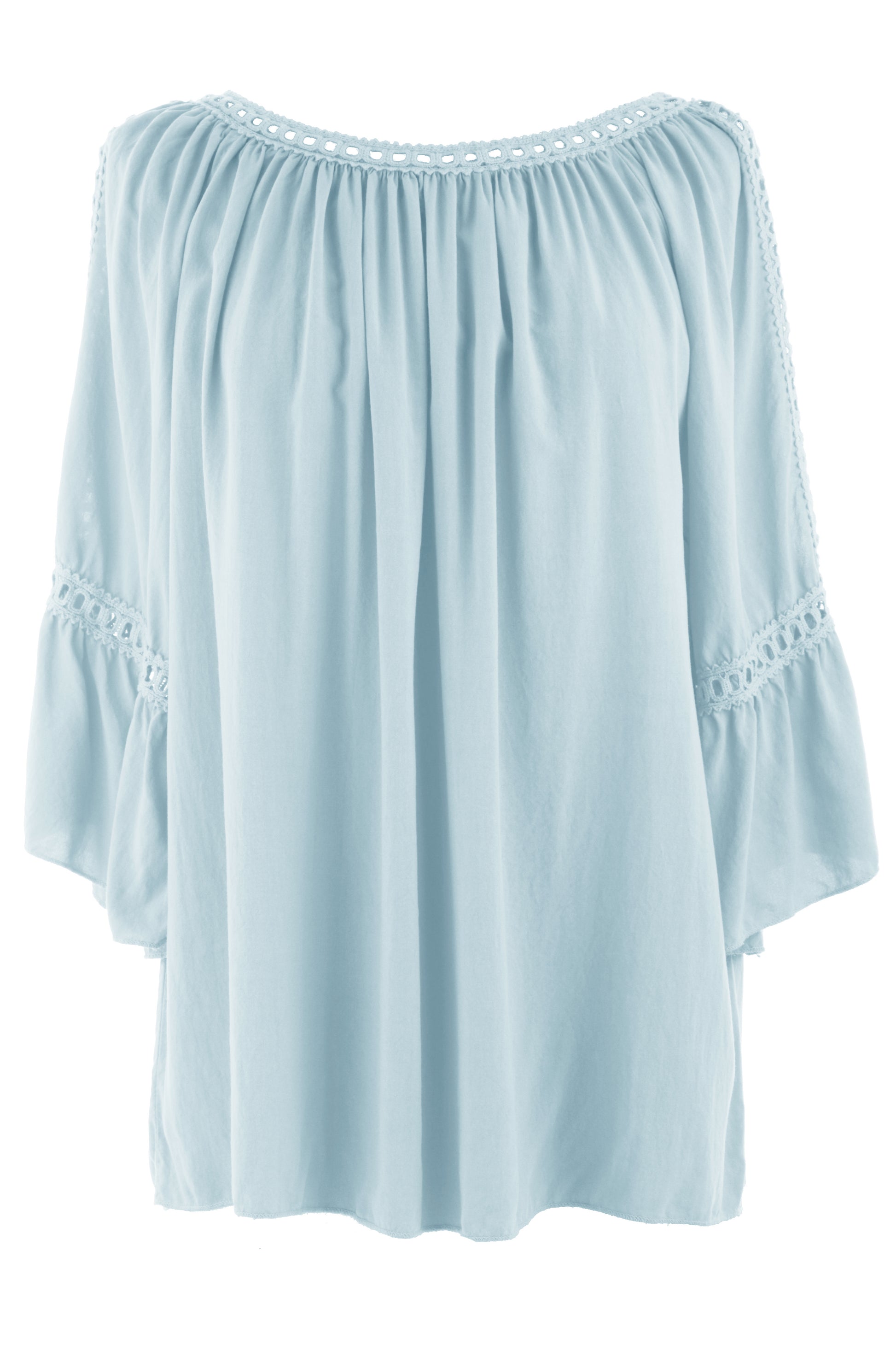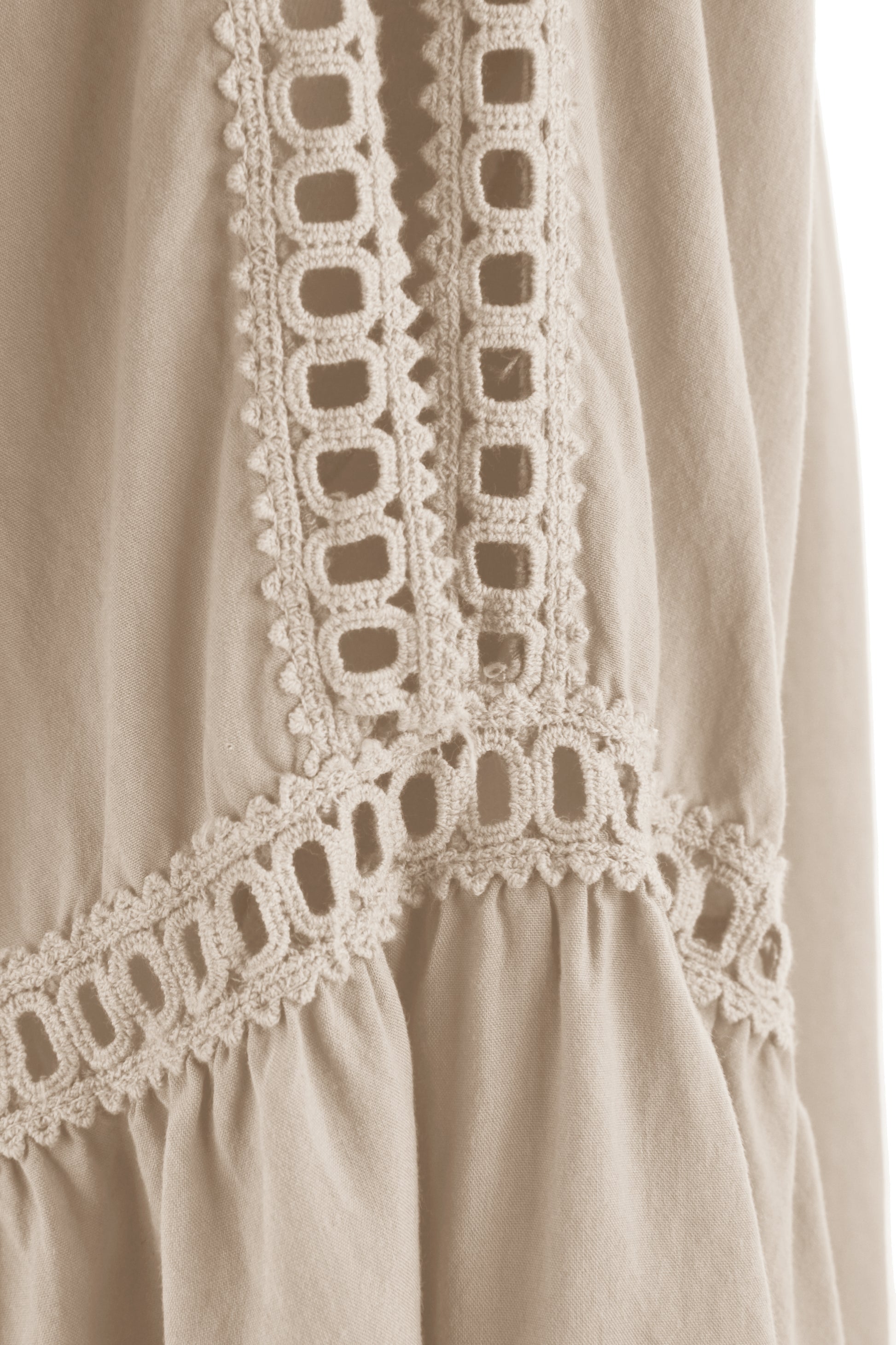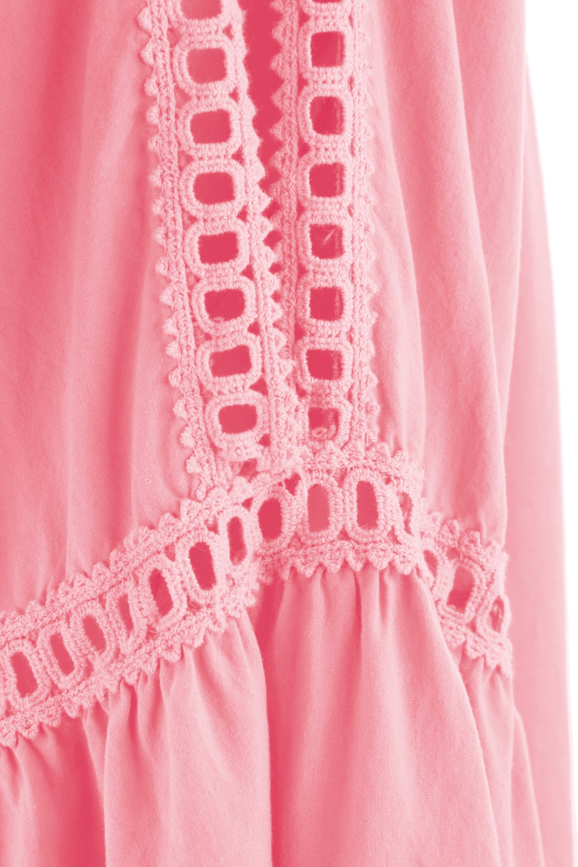 The standout elements include a beautifully crafted crochet trim neckline and fashionable cut-out shoulder details, creating a perfect blend of comfort and style.