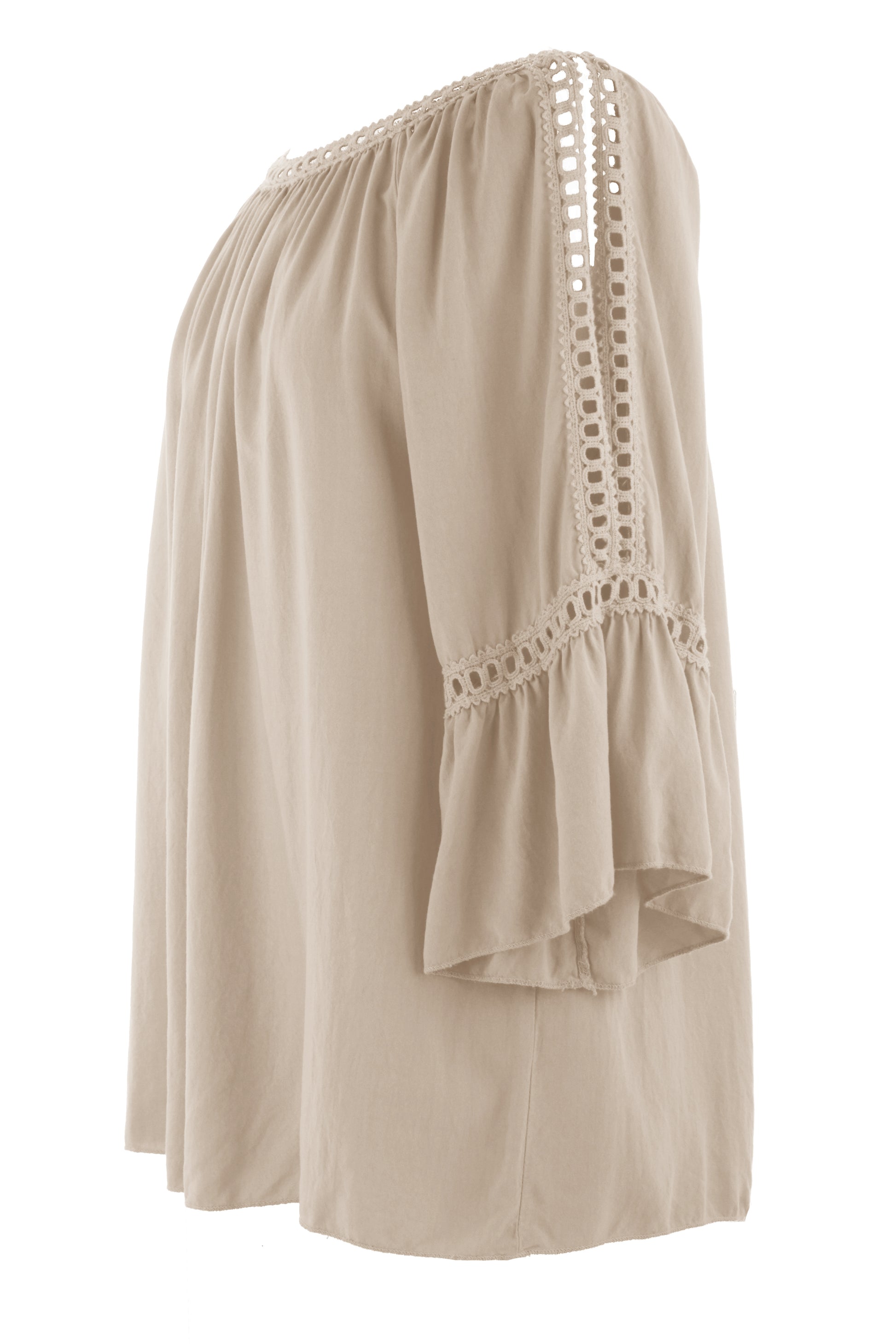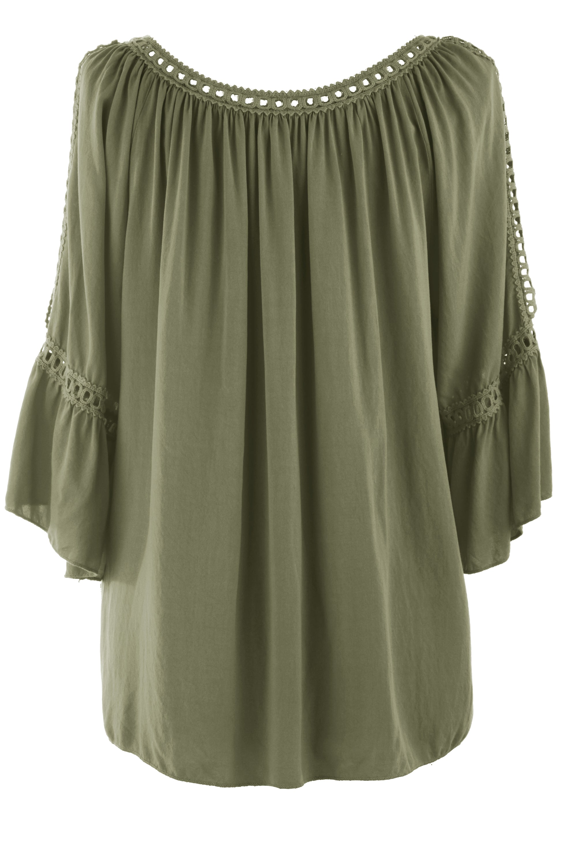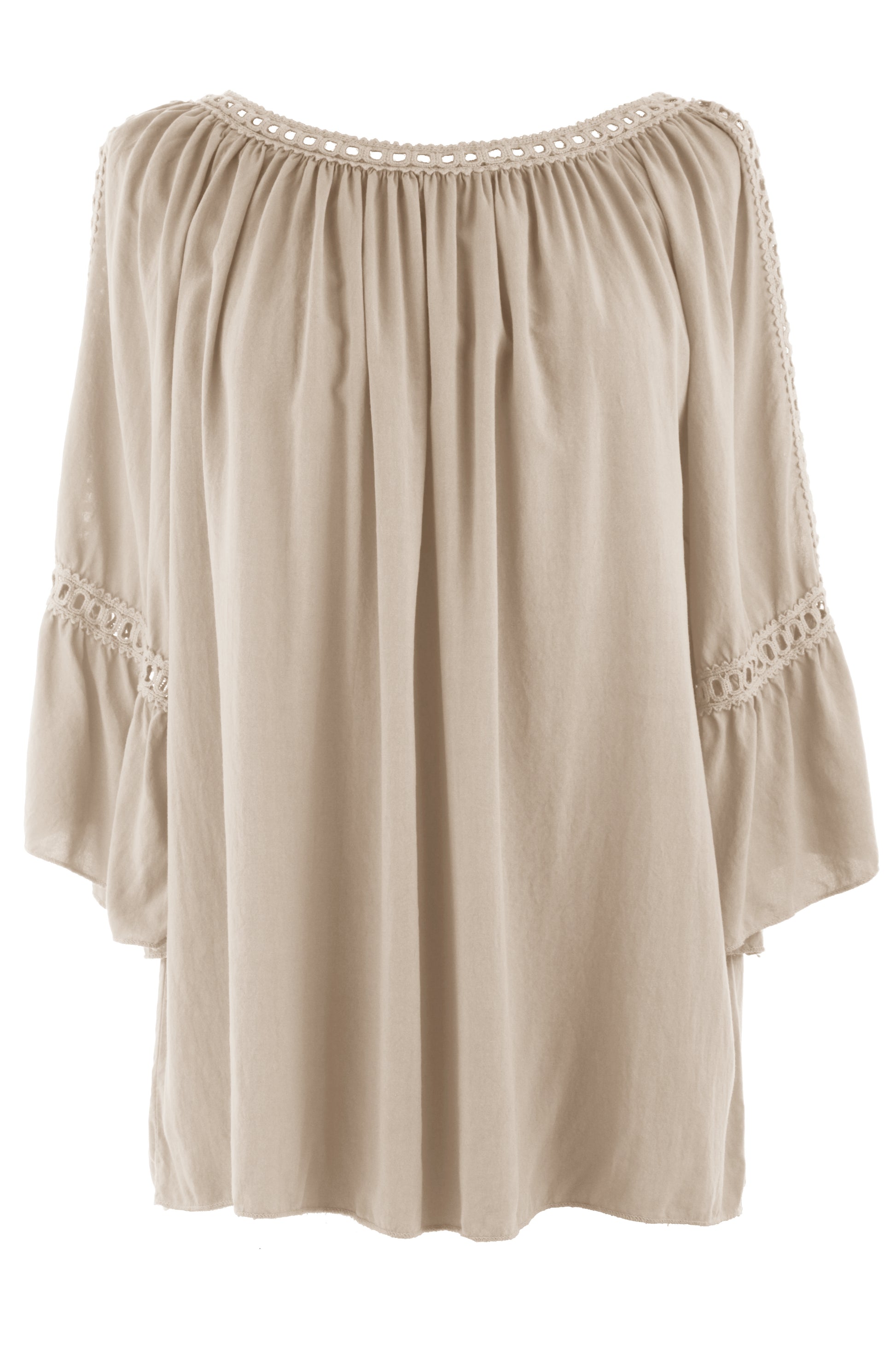 The standout elements include a beautifully crafted crochet trim neckline and fashionable cut-out shoulder details, creating a perfect blend of comfort and style.