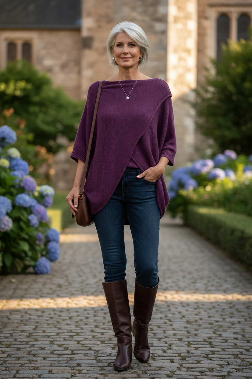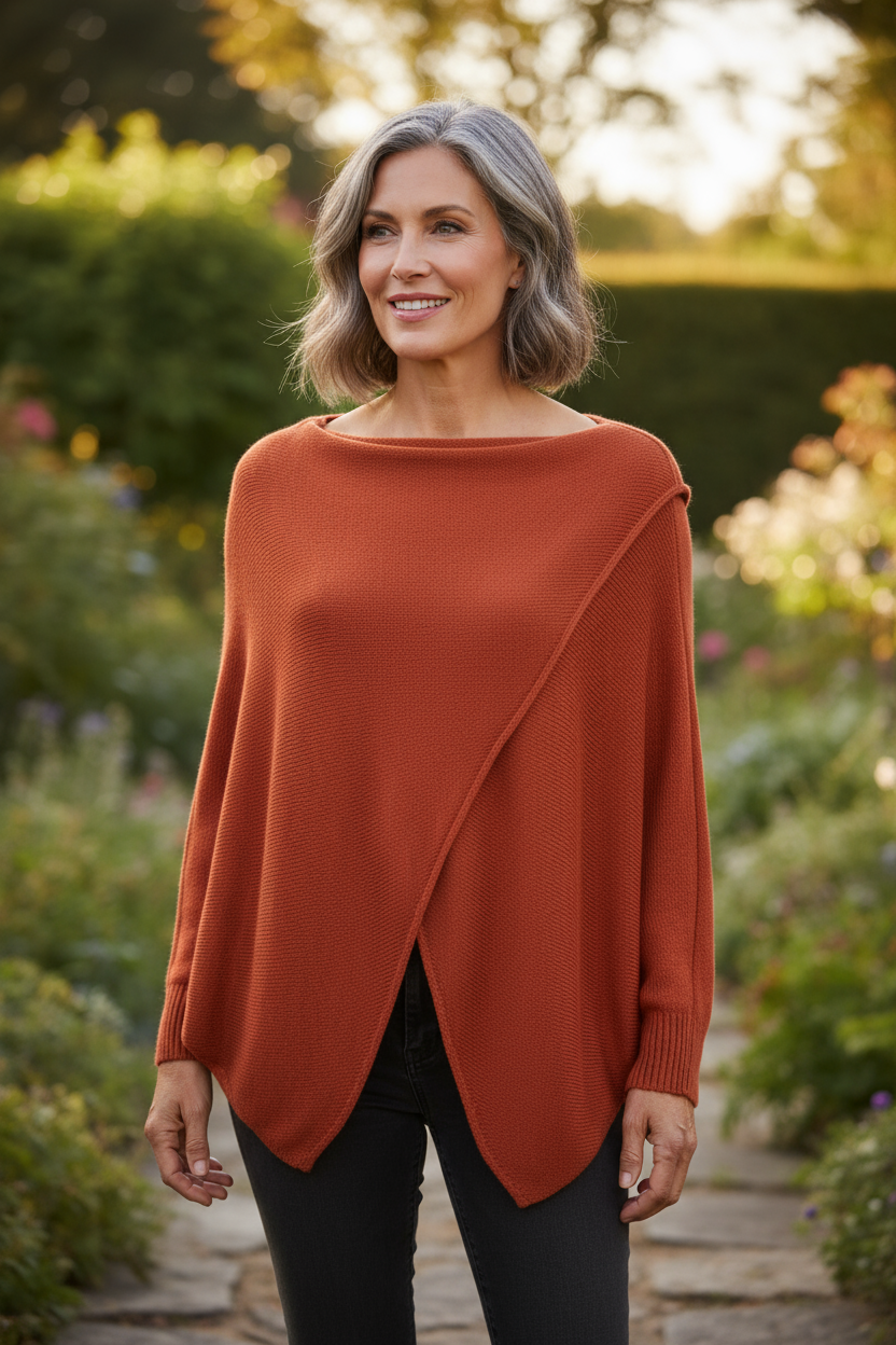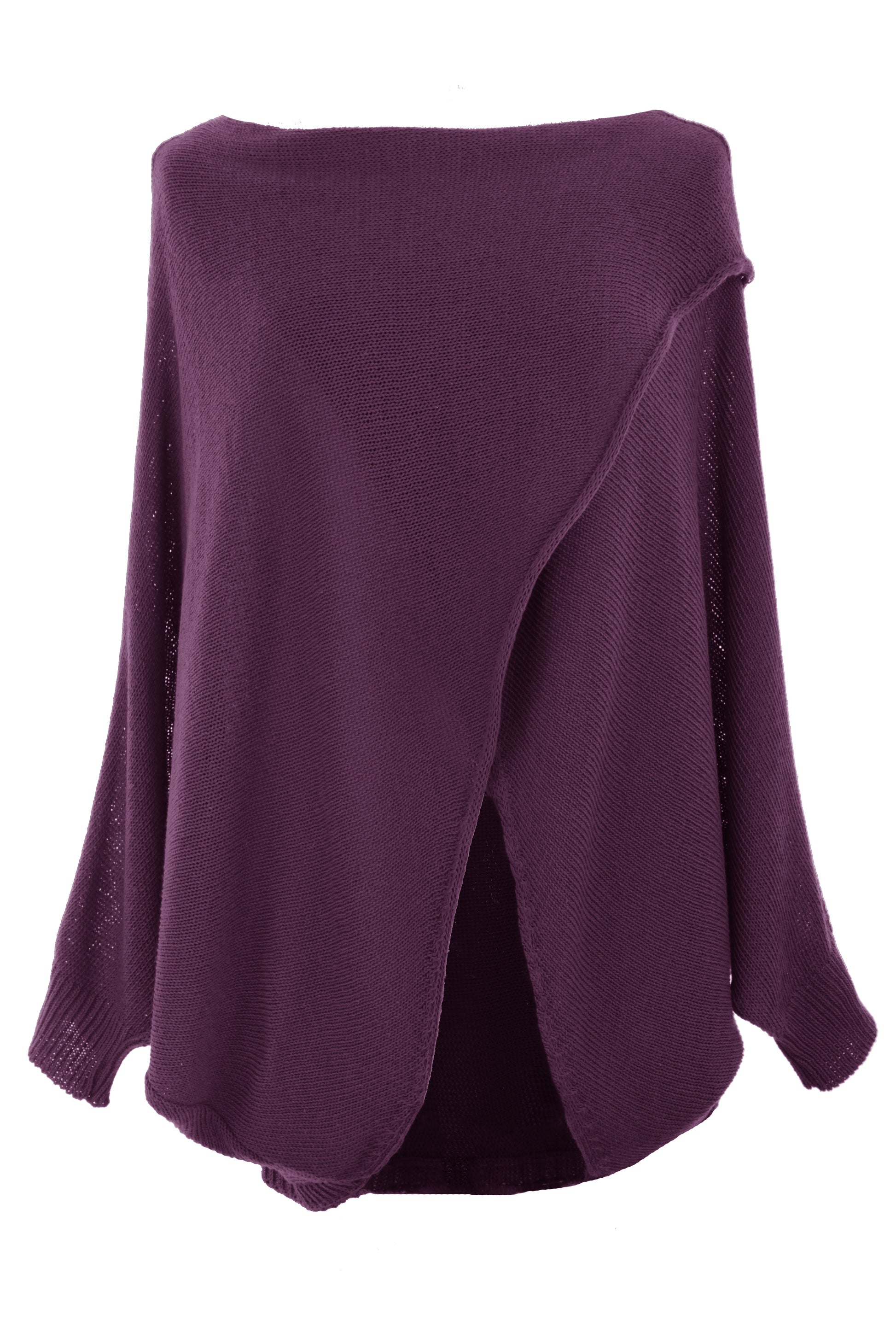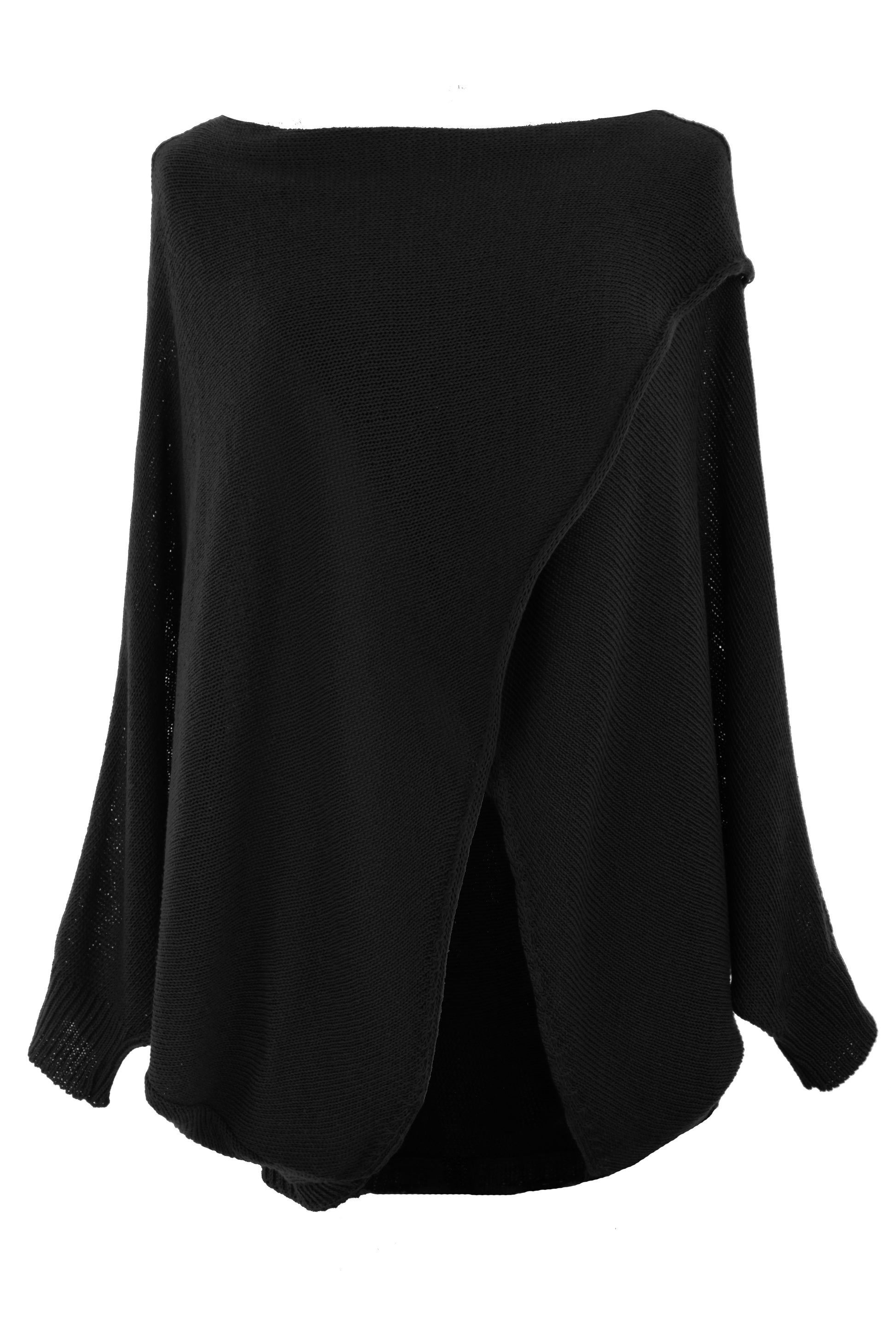 The relaxed silhouette features an elegant boat neckline and a distinctive crossover flap front design that adds visual interest.