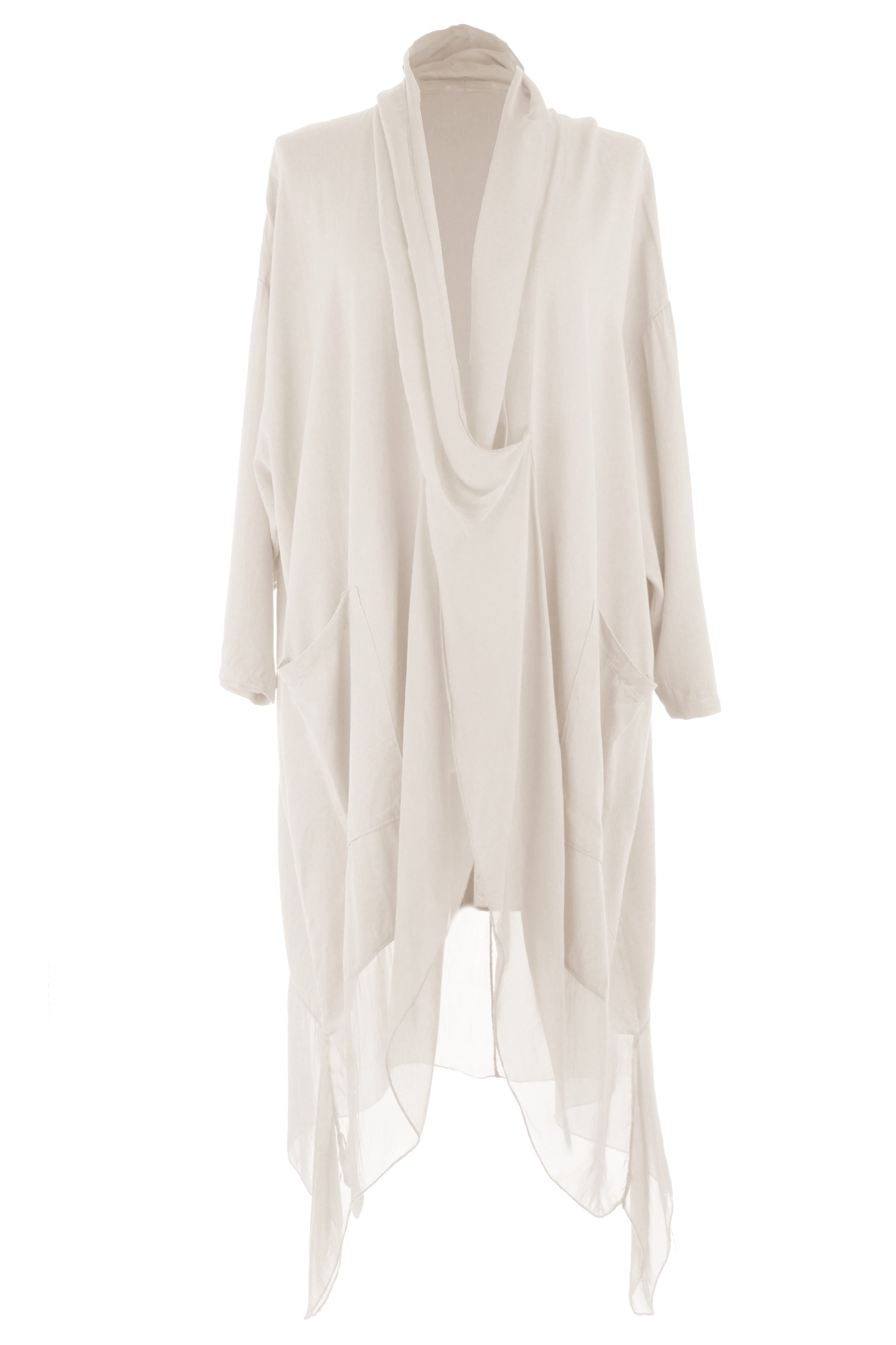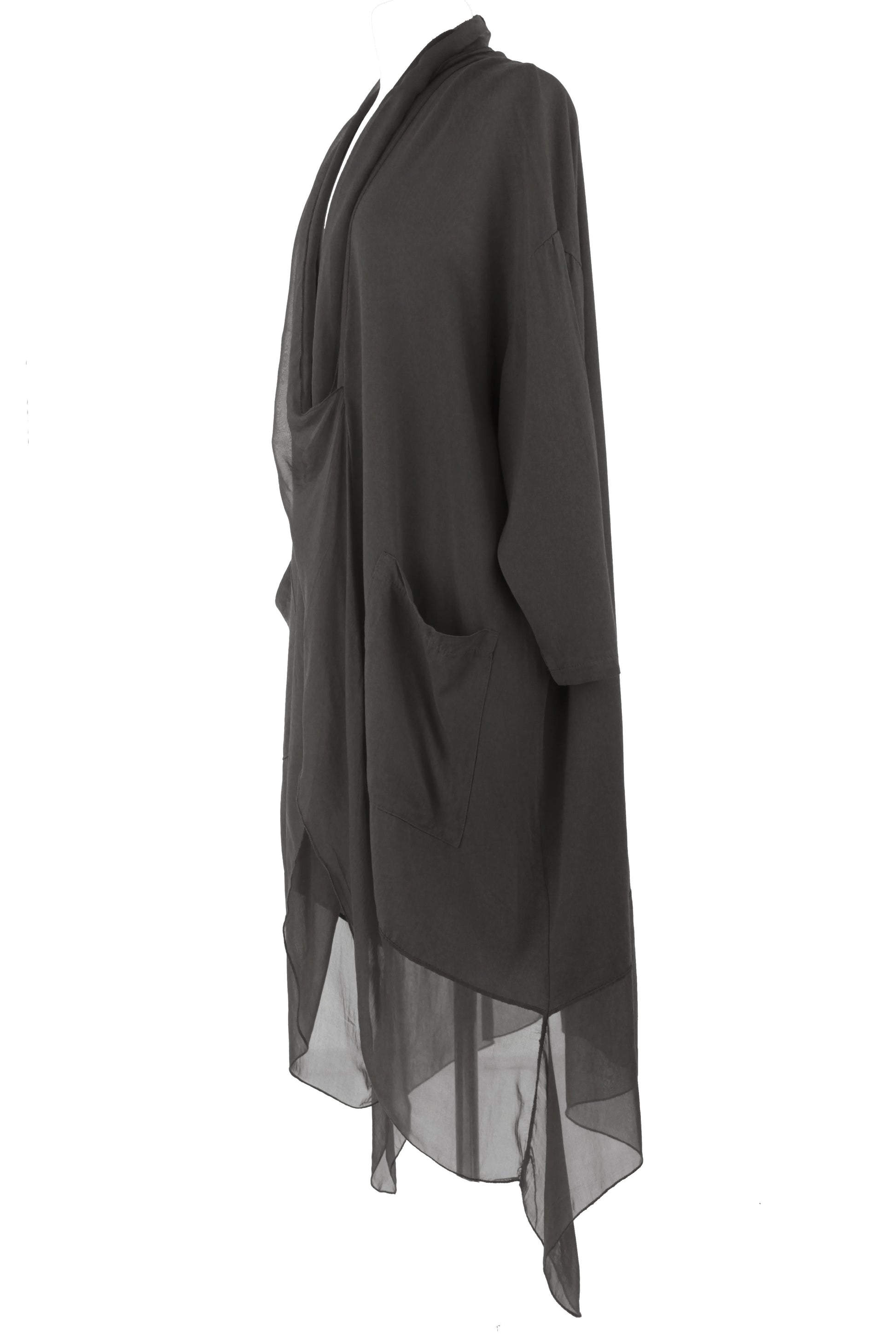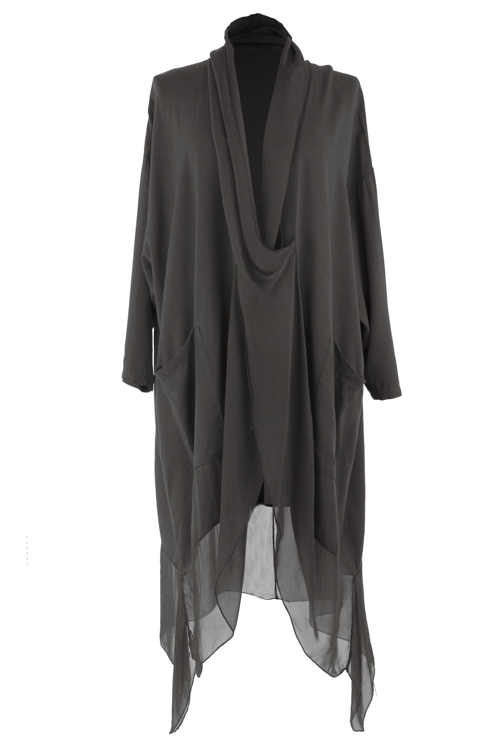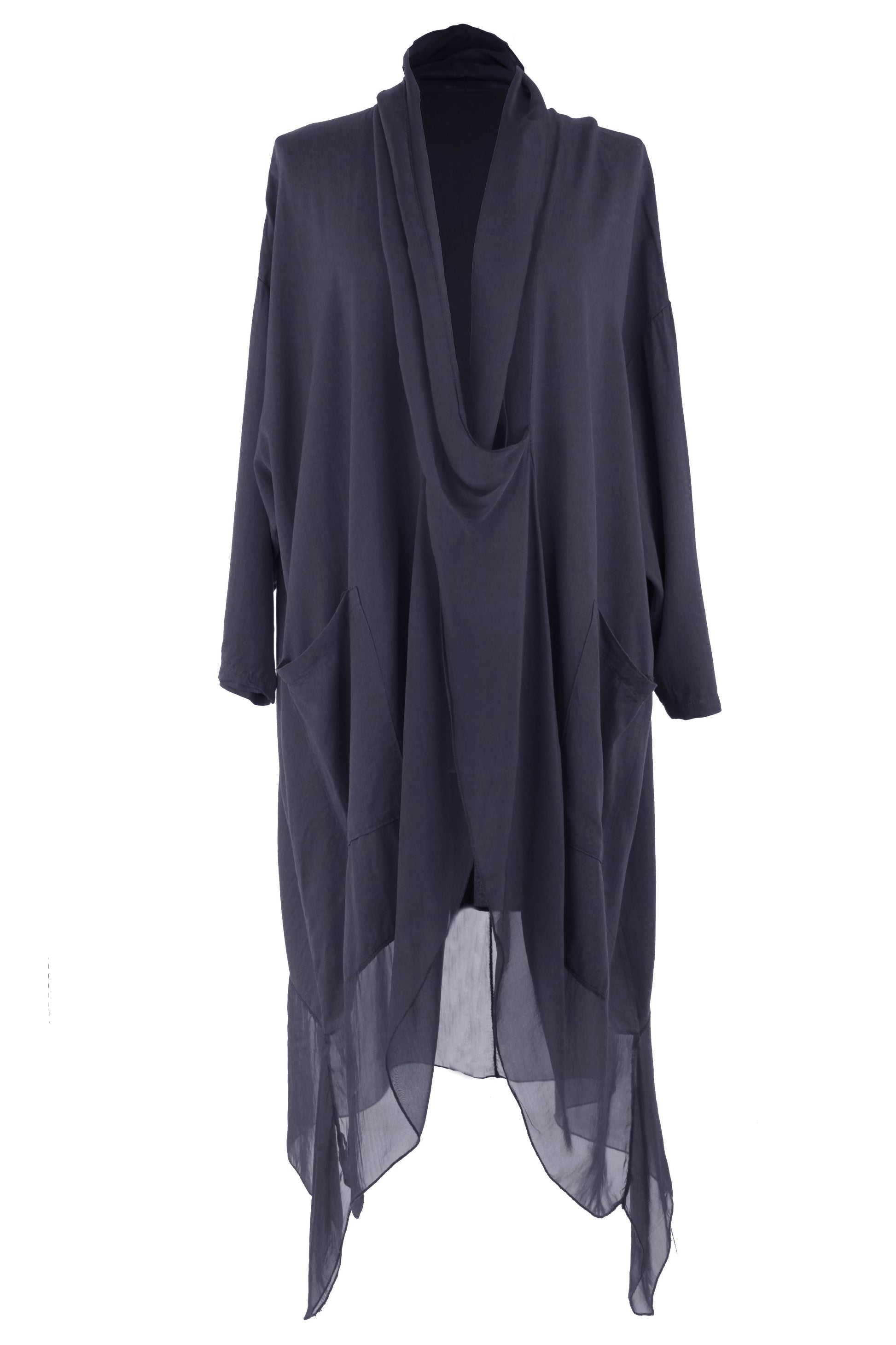 - Batwing 3/4 sleeves, deep cowl neck, 2 pockets on the front, crossover wrap over style front, asymmetric hemline.