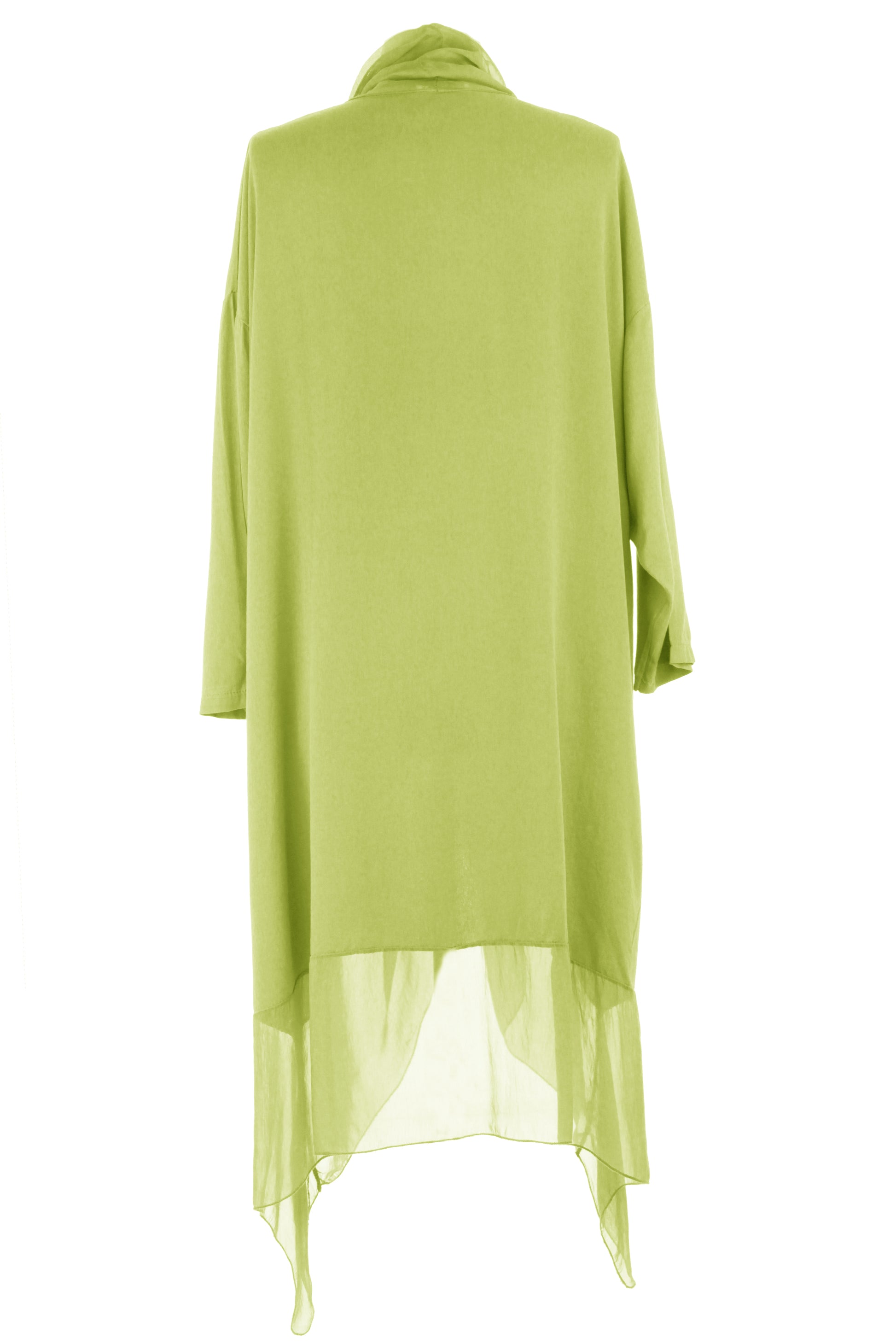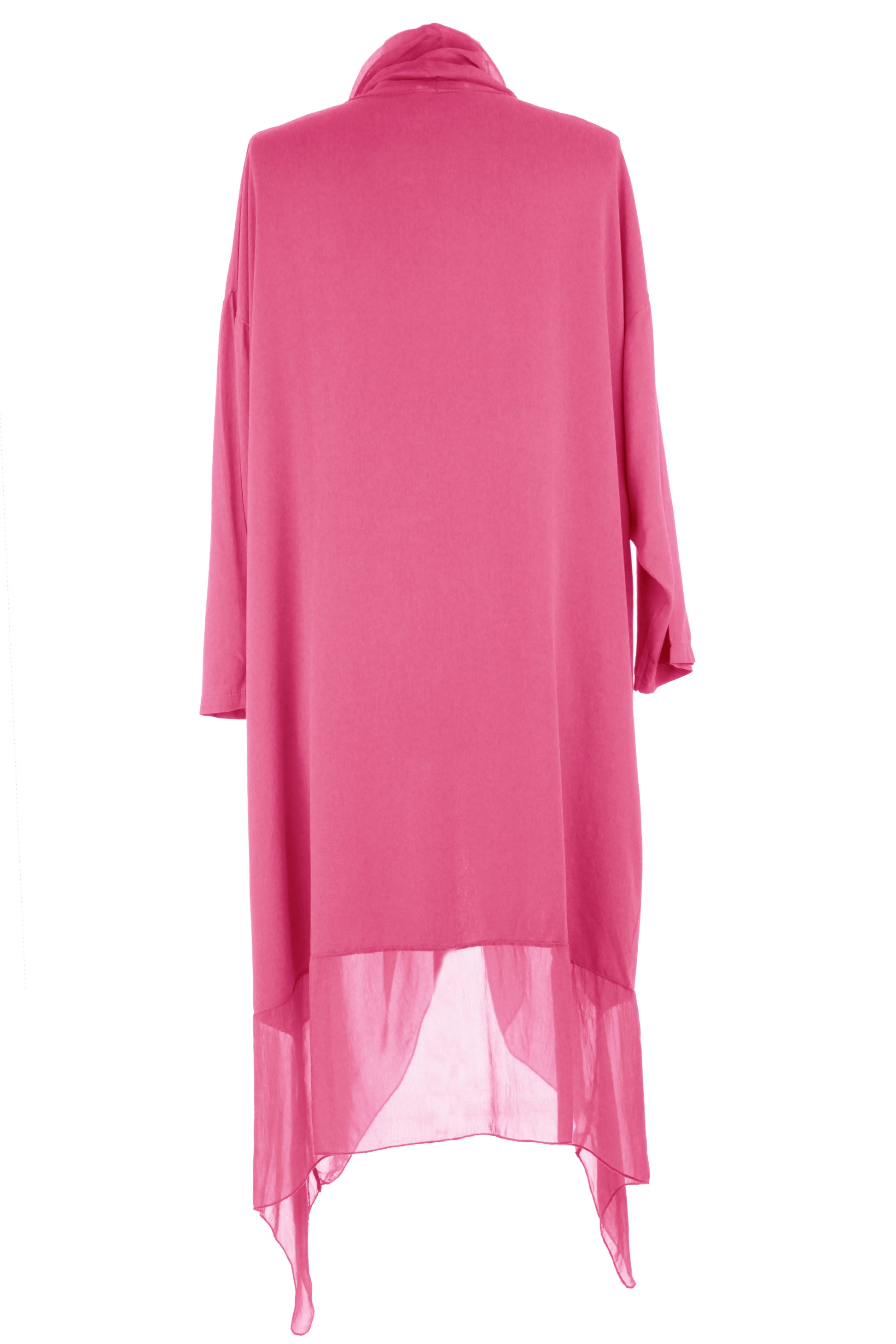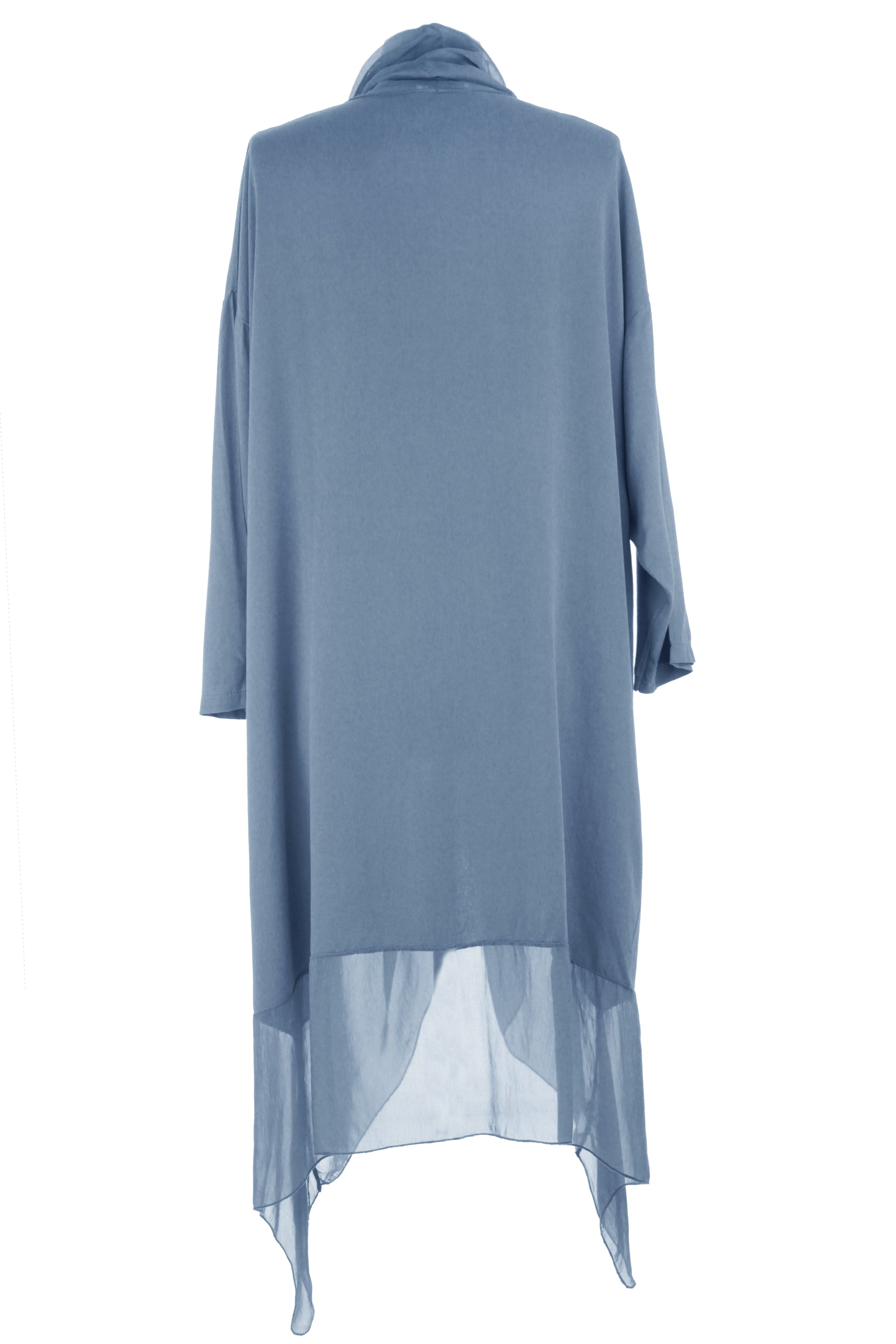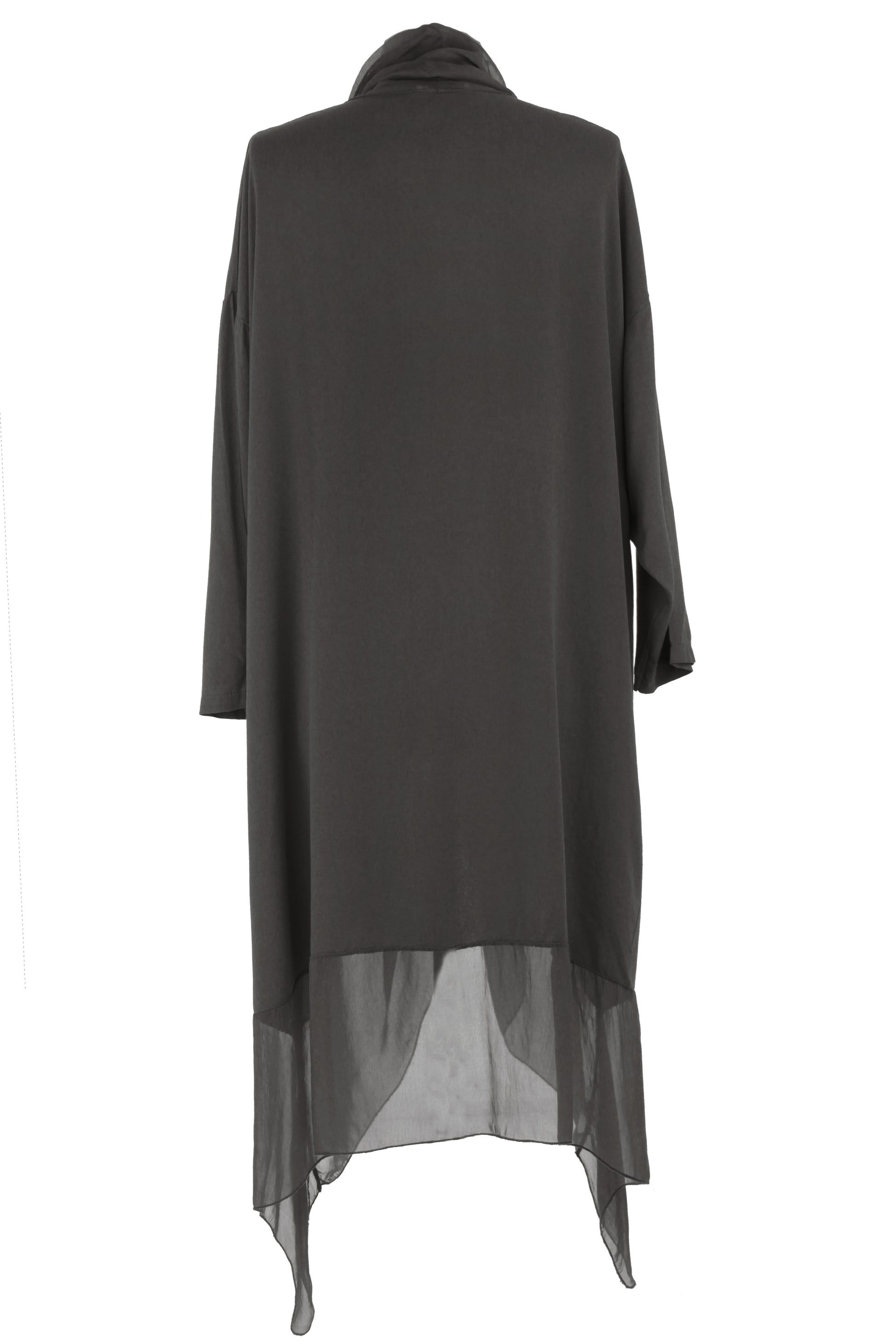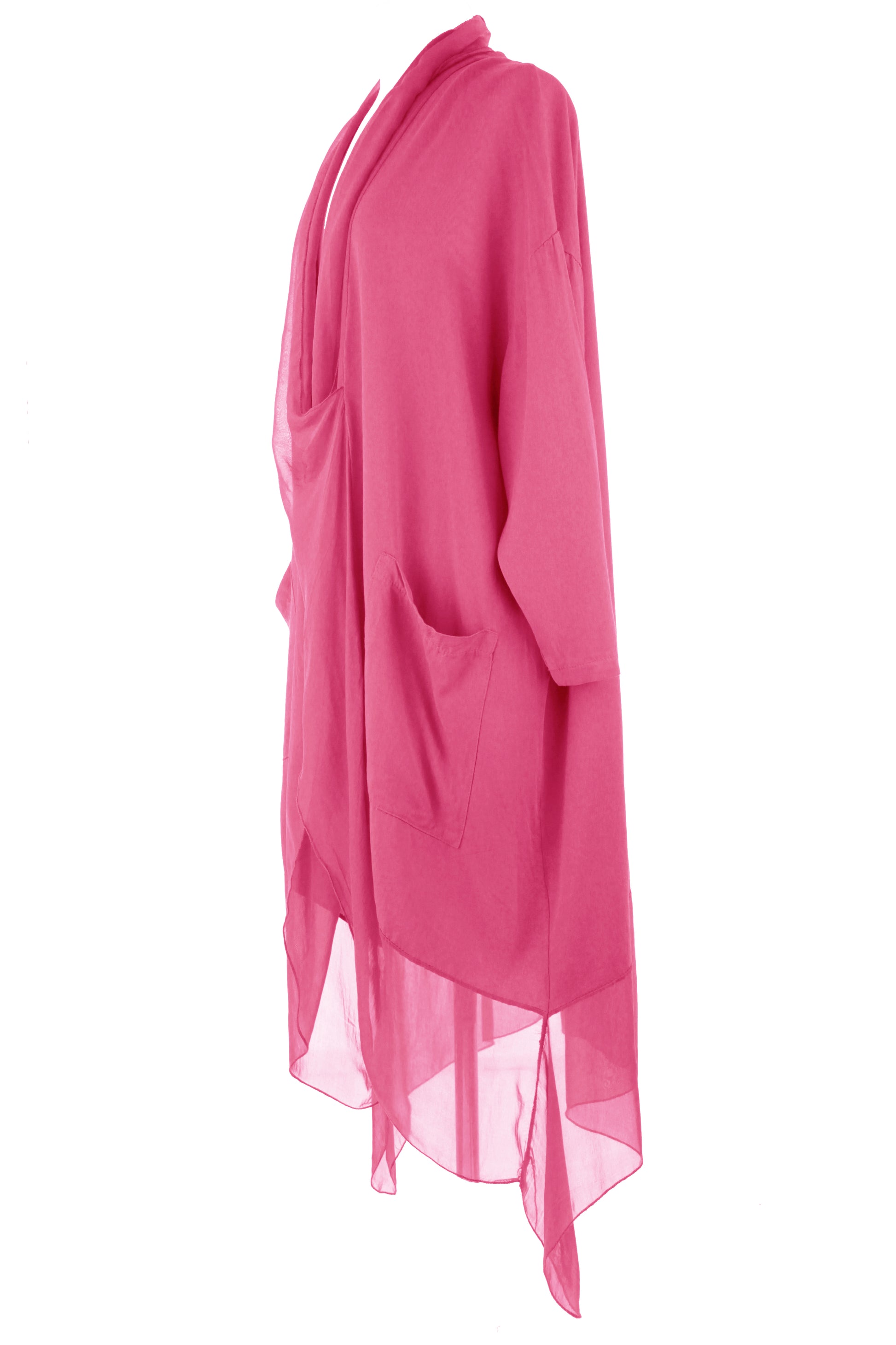 - Batwing 3/4 sleeves, deep cowl neck, 2 pockets on the front, crossover wrap over style front, asymmetric hemline.