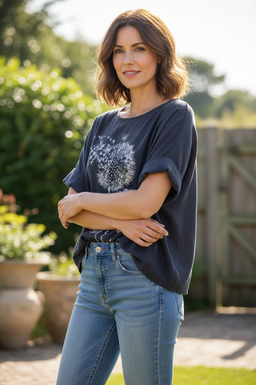 Elevate your wardrobe with this charming Italian Lagenlook cotton top, featuring an eye-catching dandelion floral print that adds a touch of whimsy to your ensemble.
