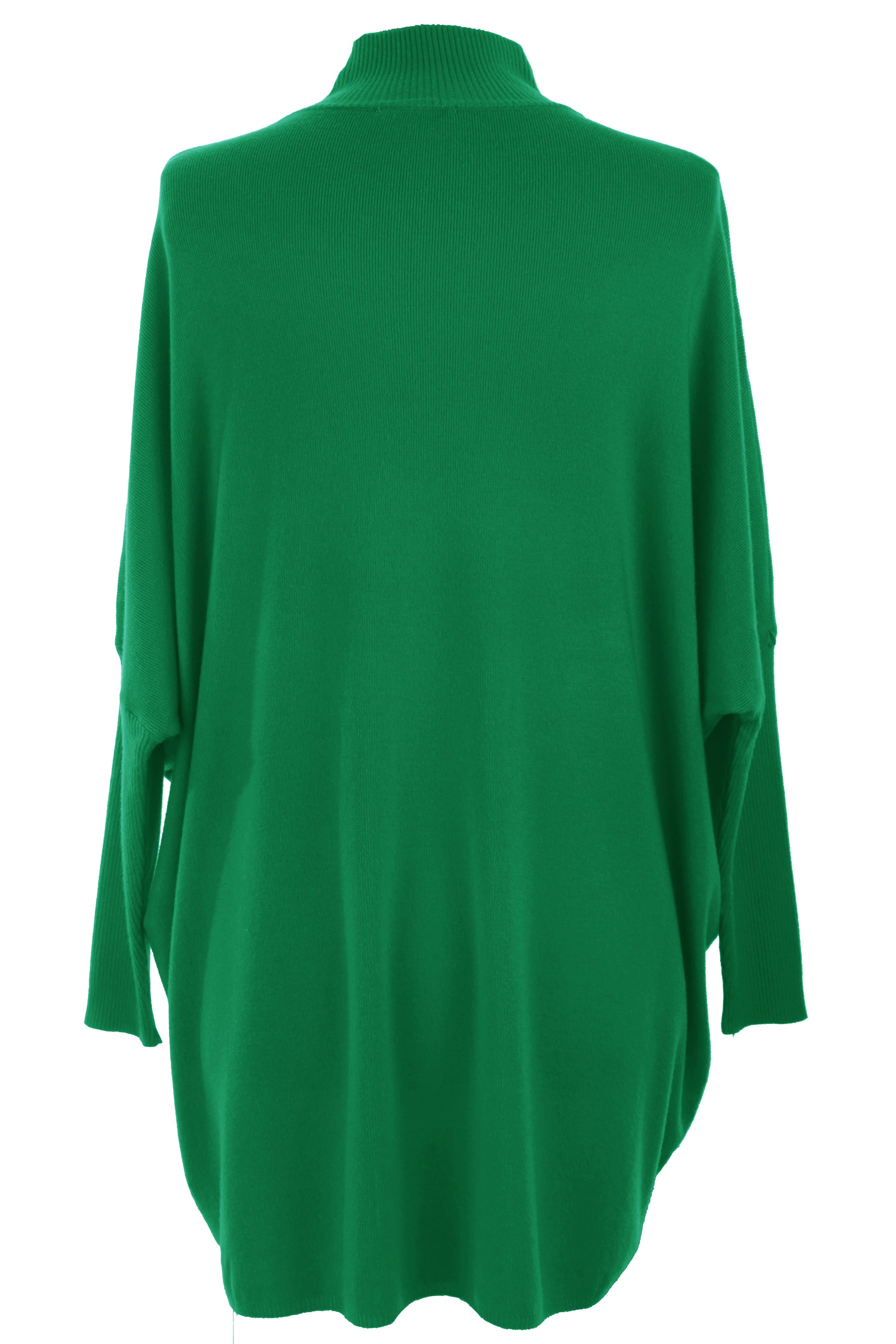 The relaxed silhouette includes a sophisticated funnel neck, generous batwing sleeves, and a fashionable high-low hem that creates a flattering line.