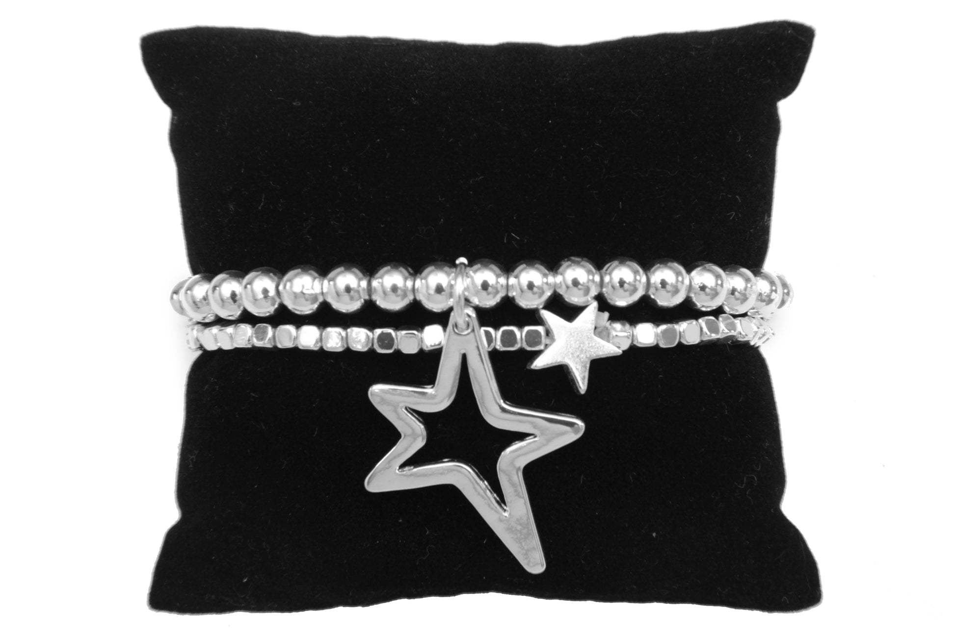 - This twin bracelet has square and ball beads with star charm to add interest to the wrist.