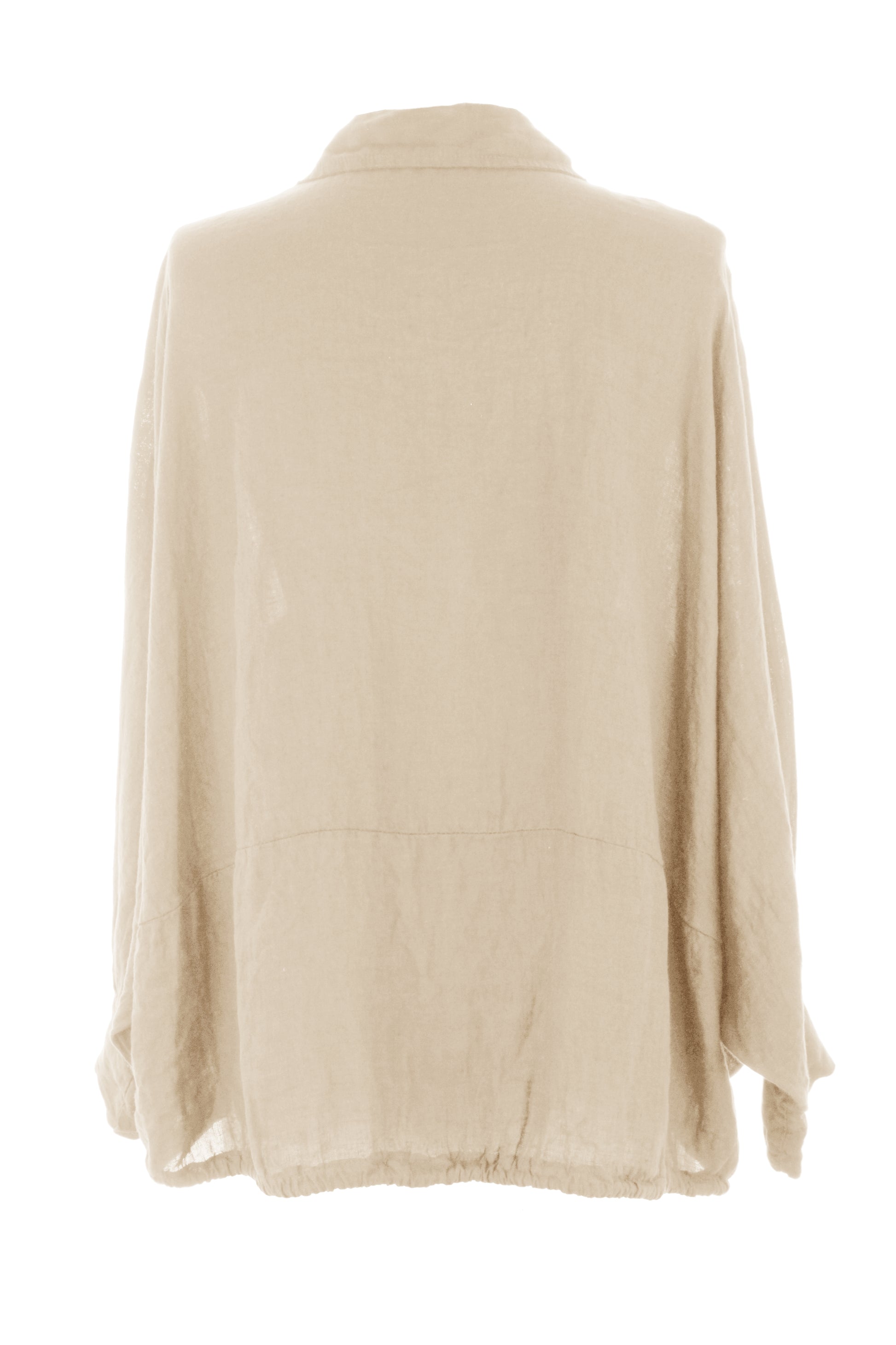 Designed with effortless style in mind, this relaxed oversized piece features a classic collar, full-length batwing sleeves with cuffs, and a convenient two-pocket design at the front.