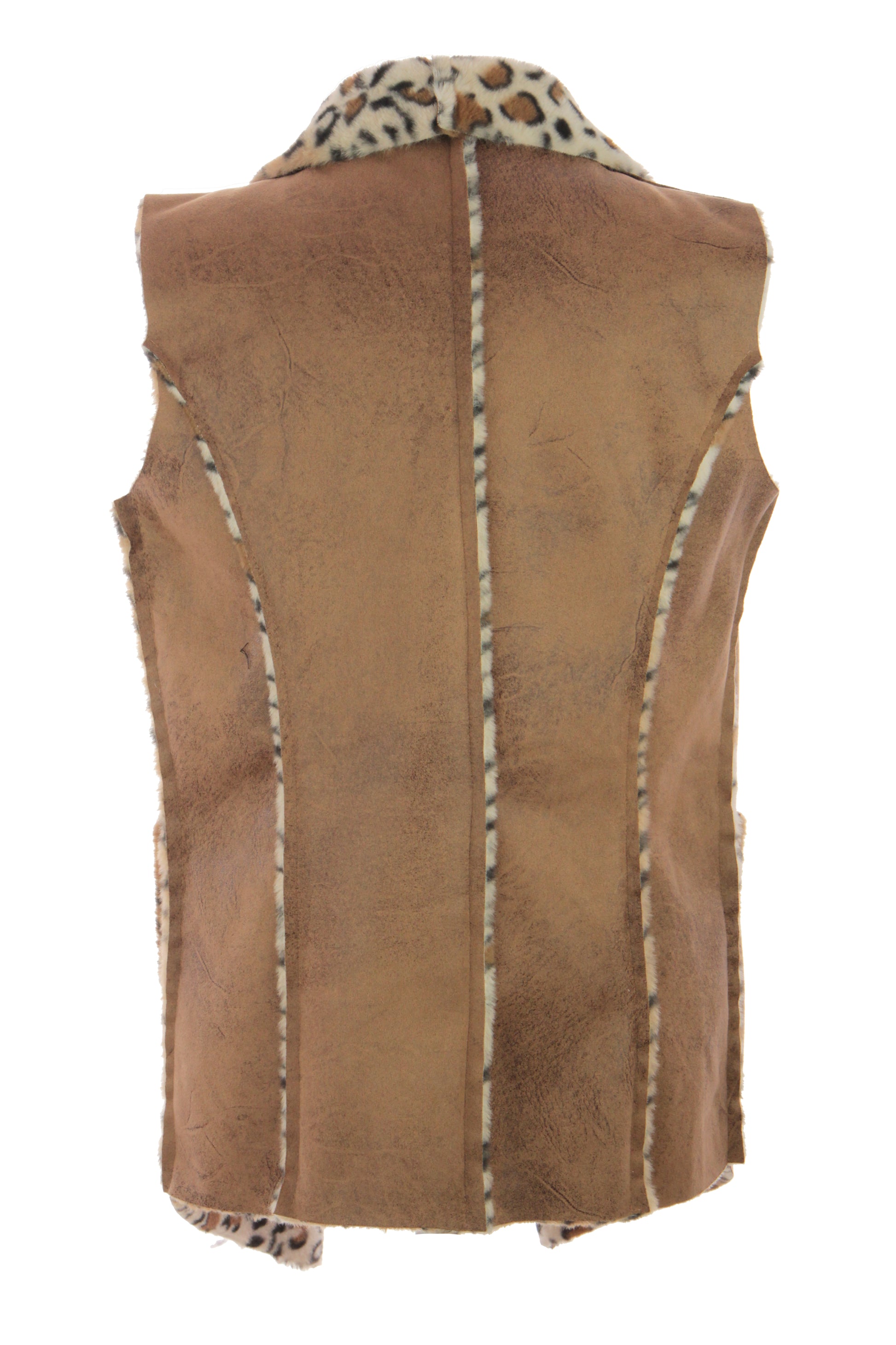 Crafted with a luxurious leopard print faux fur interior and soft suede-like exterior, this waistcoat exudes effortless glamour.