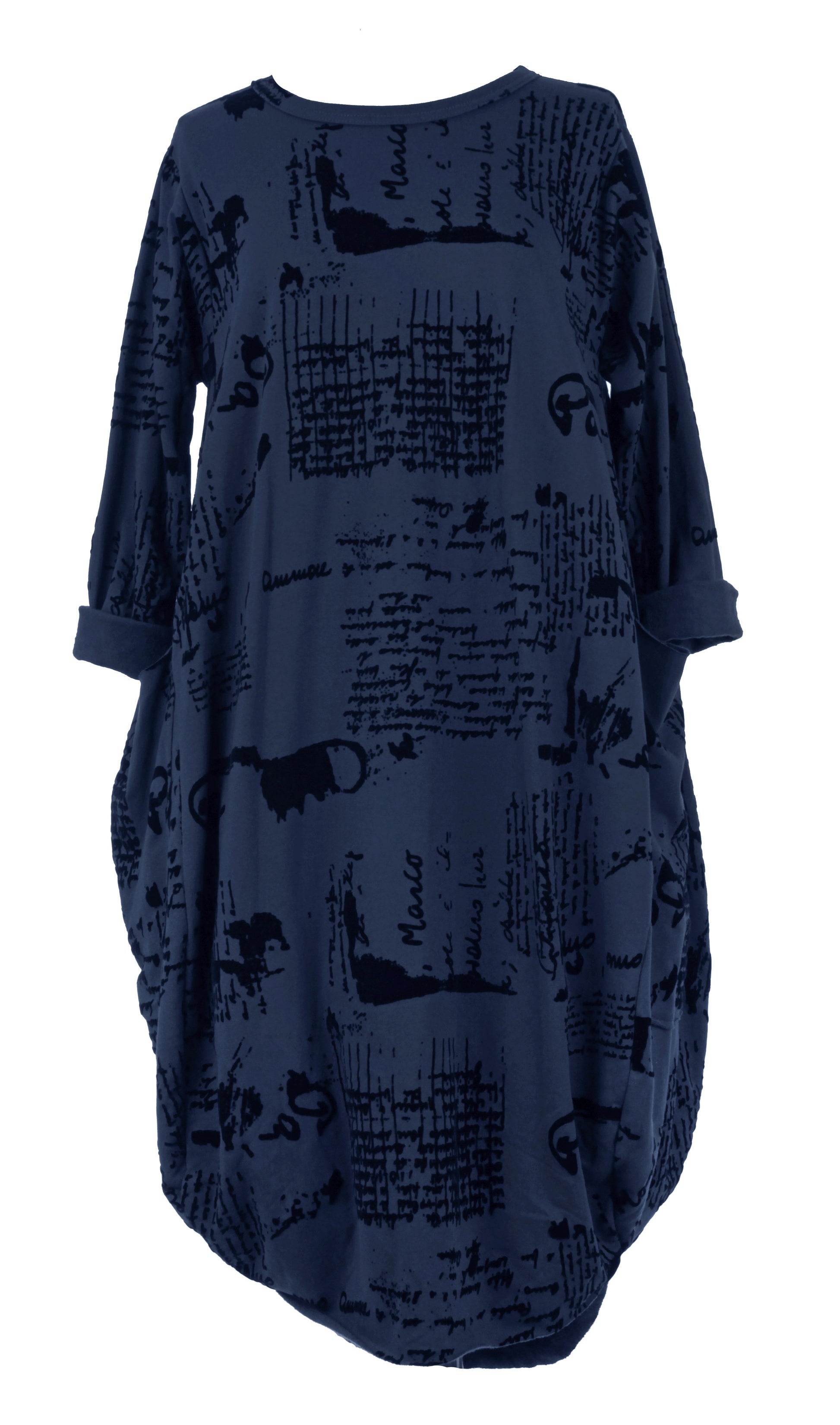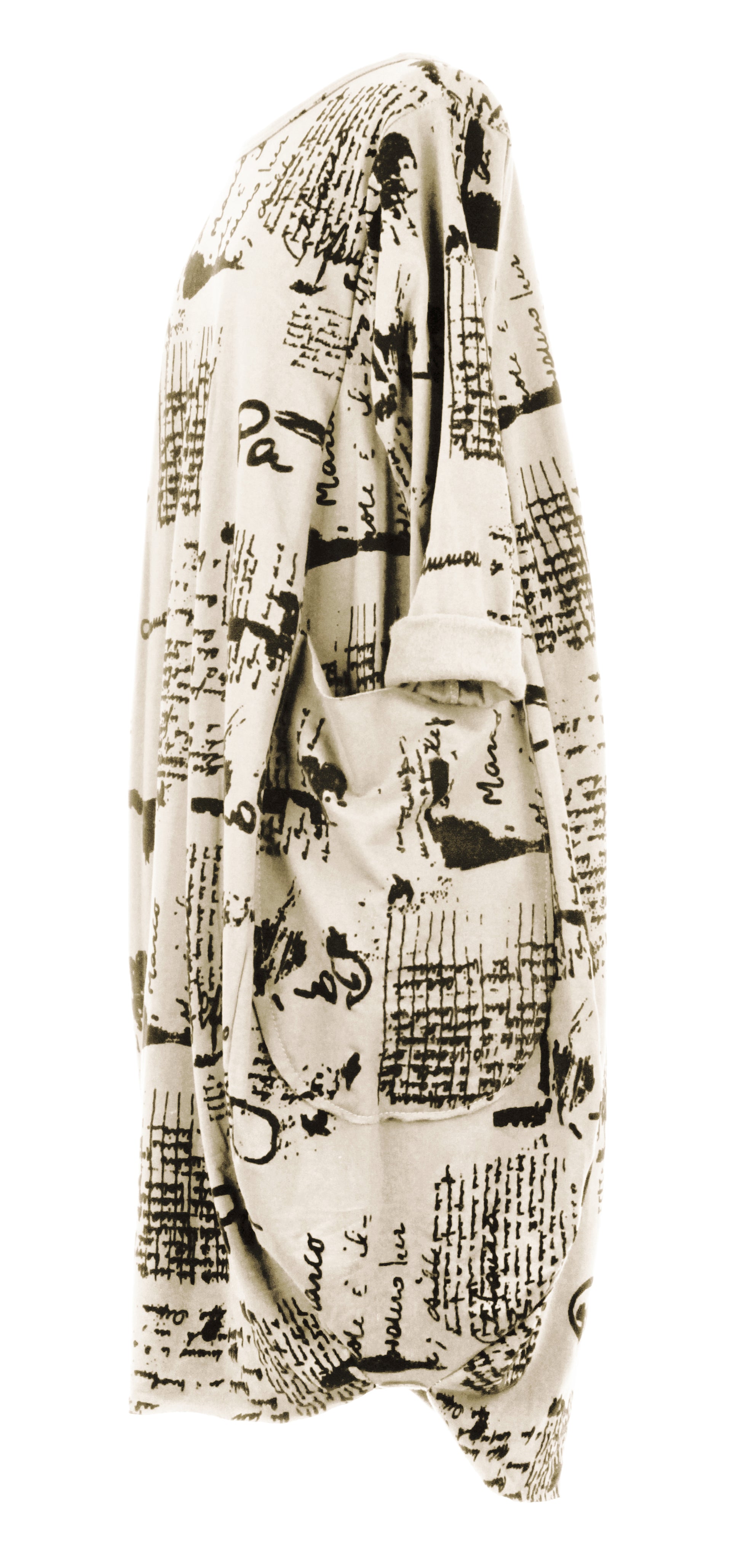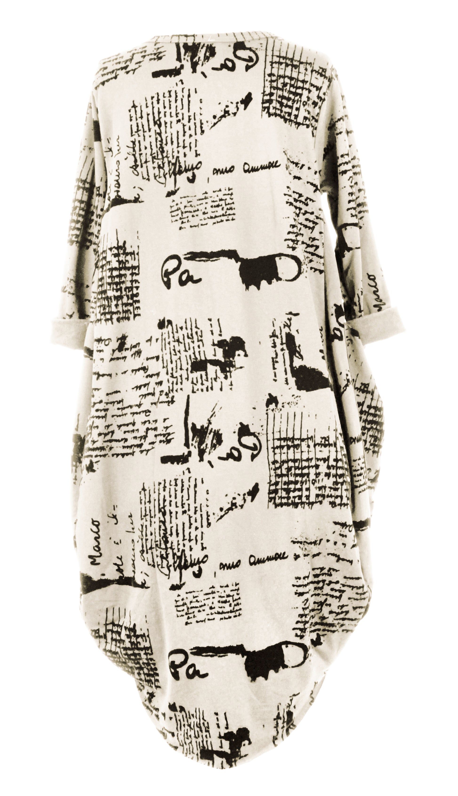 The standout feature is the eye-catching flocked script print in contrasting black, creating a bold and artistic statement.
