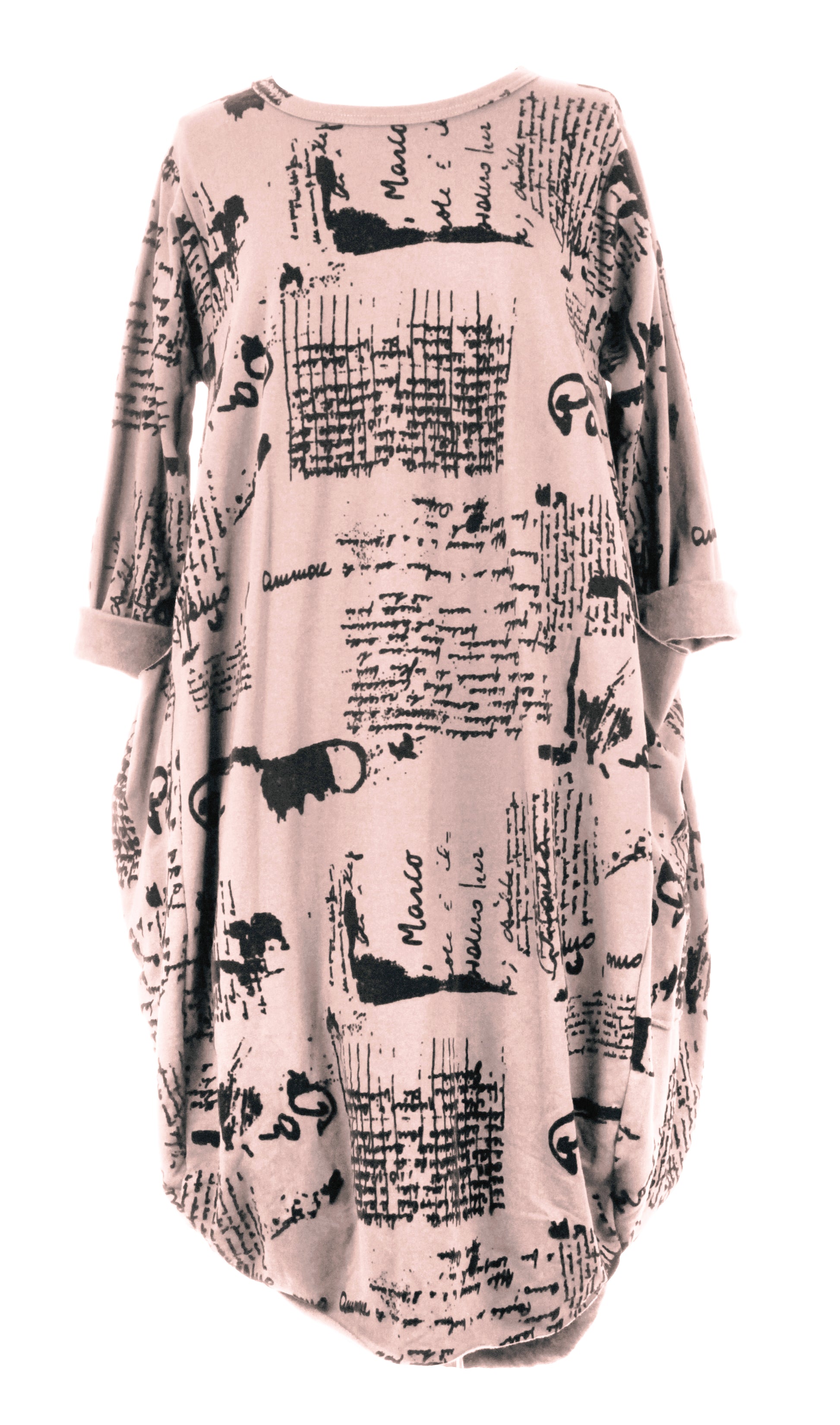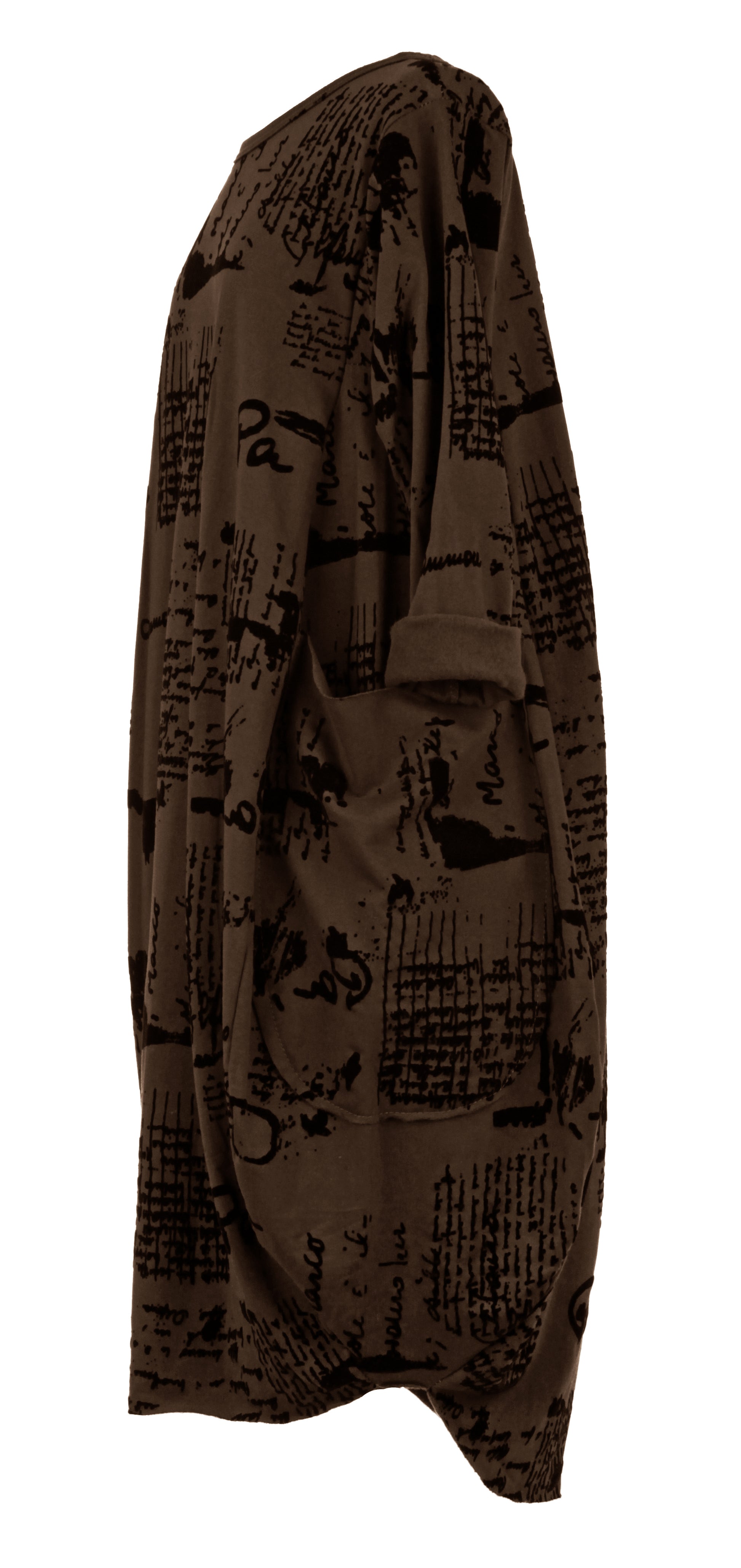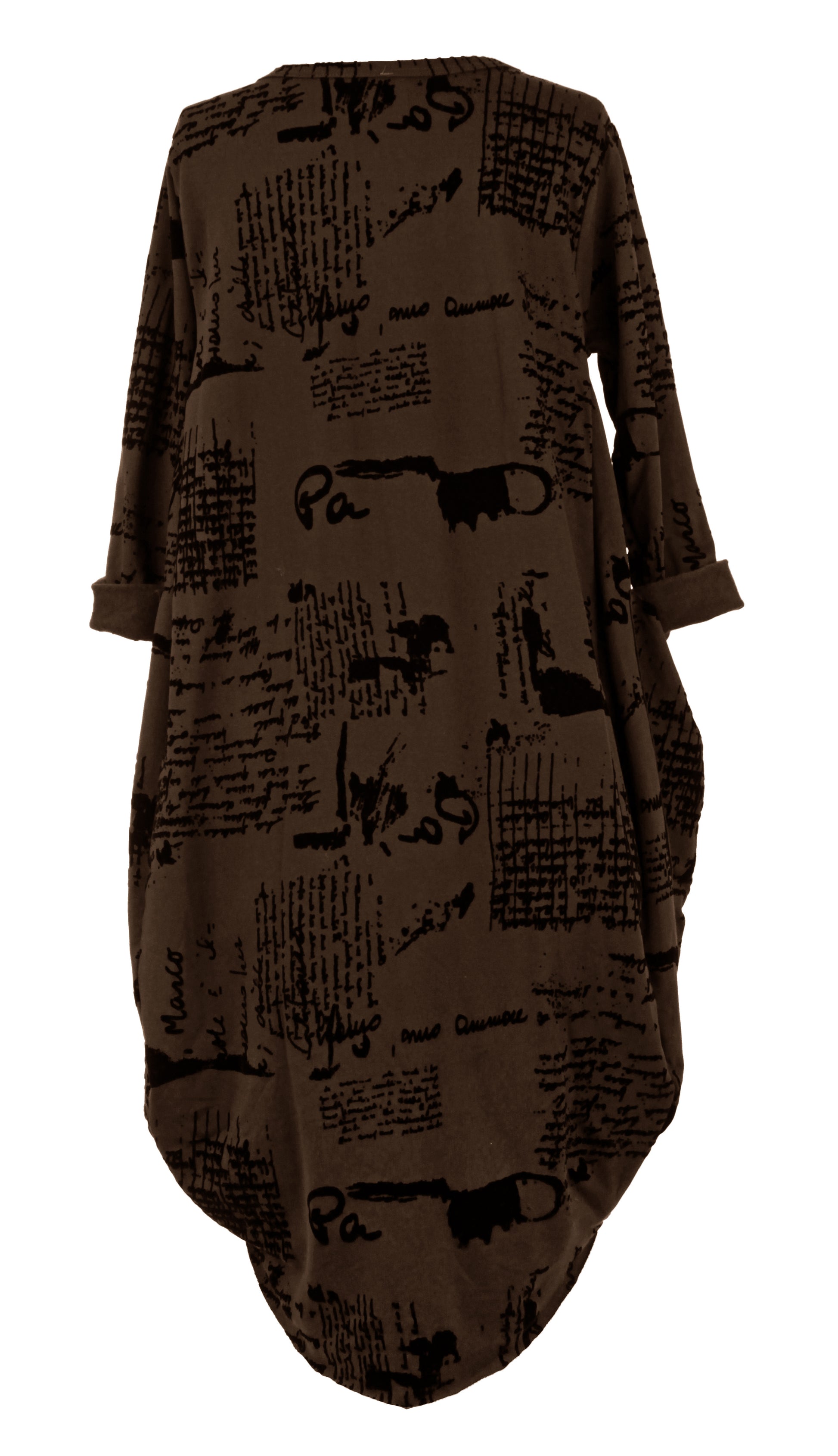 The standout feature is the eye-catching flocked script print in contrasting black, creating a bold and artistic statement.