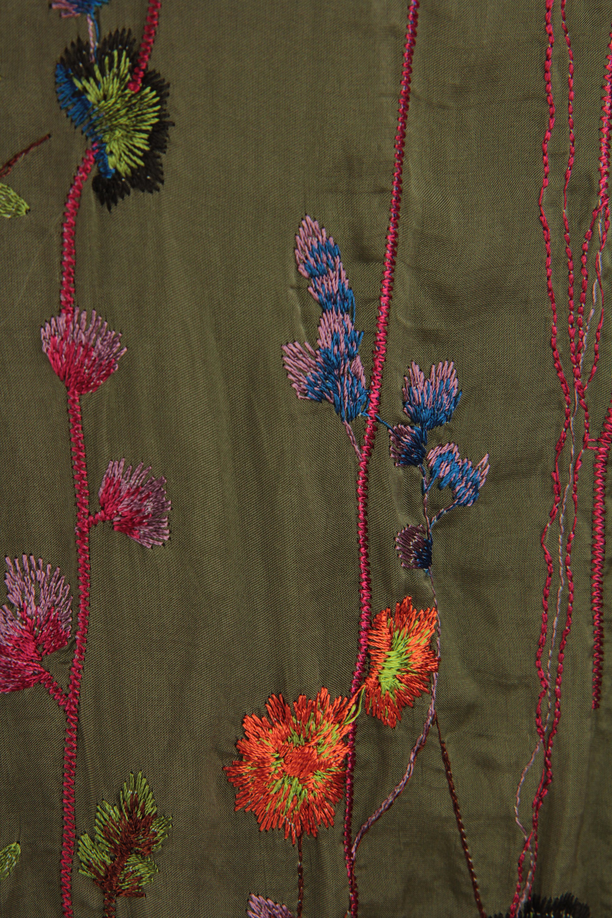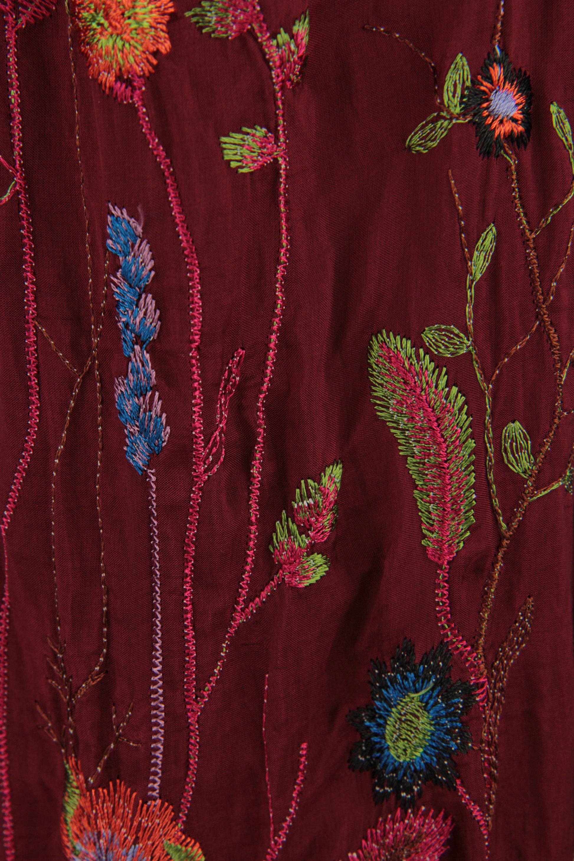 The base showcases intricate floral embroidery in vibrant hues, creating an eye-catching pattern that makes these trousers truly special.