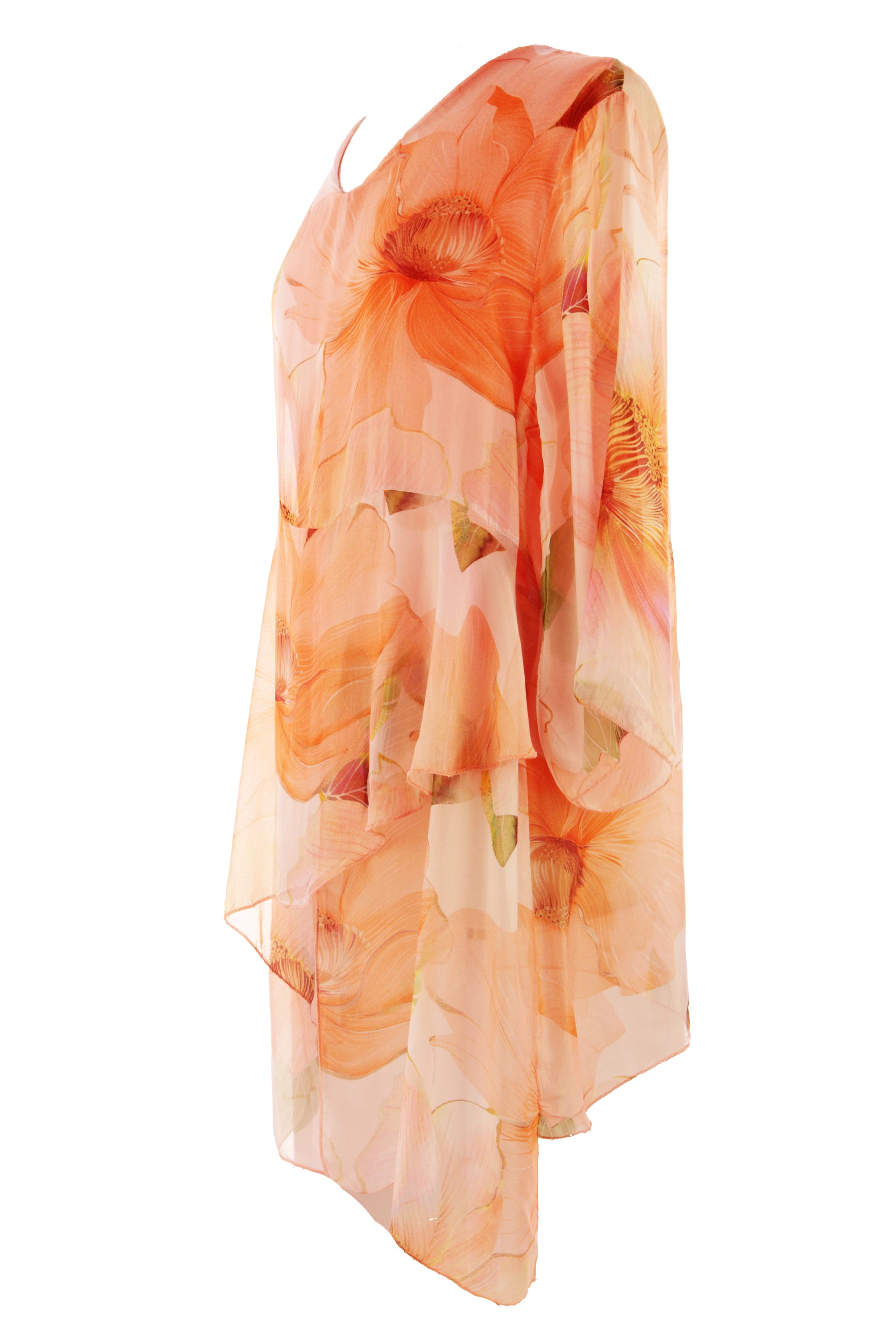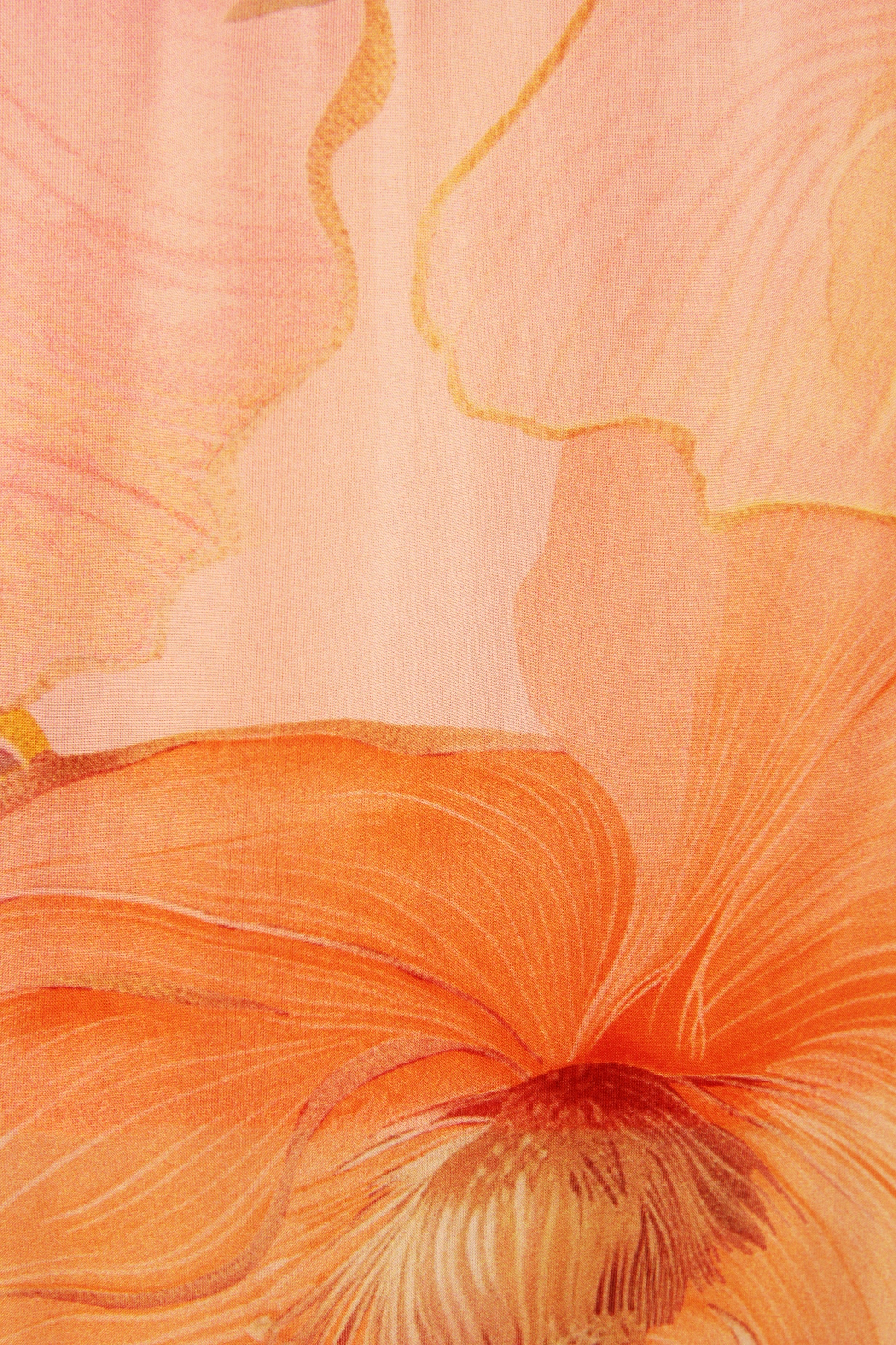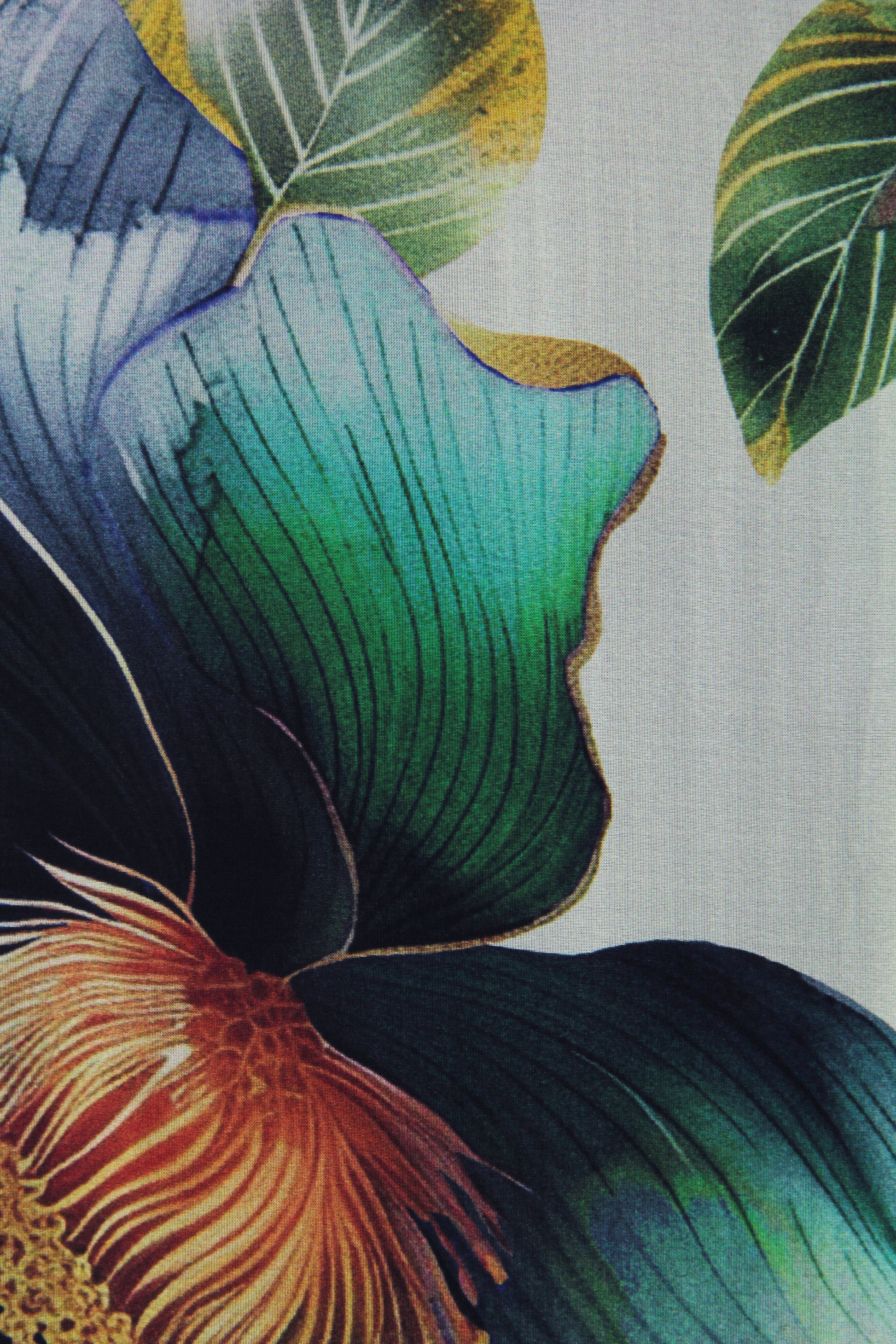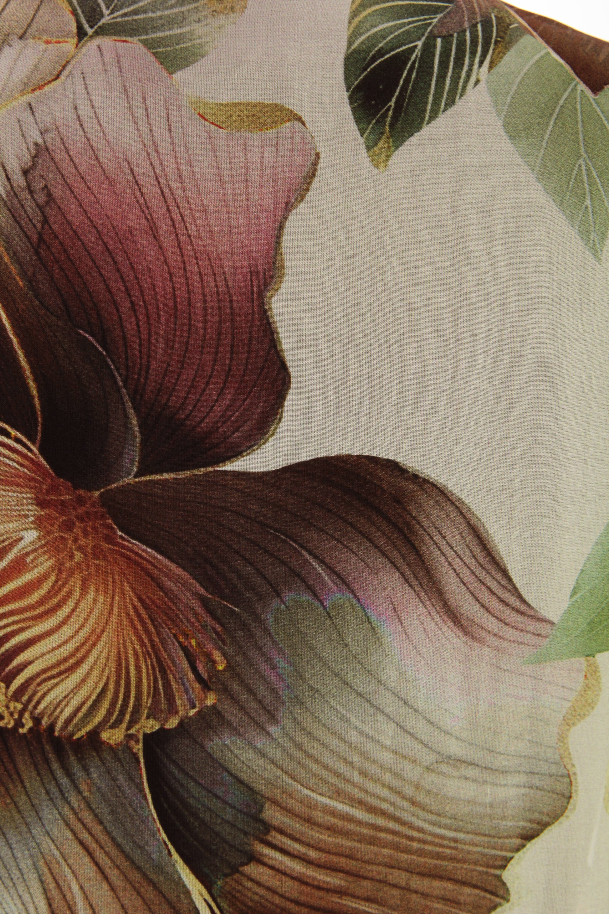 The delicate floral pattern, featuring large blooms and foliage against a light background, creates an artistic, painterly effect that elevates any ensemble.