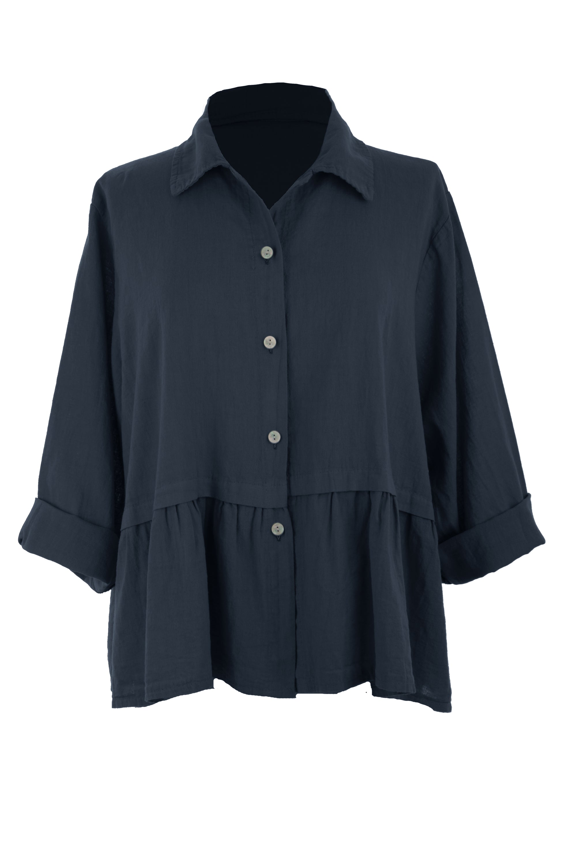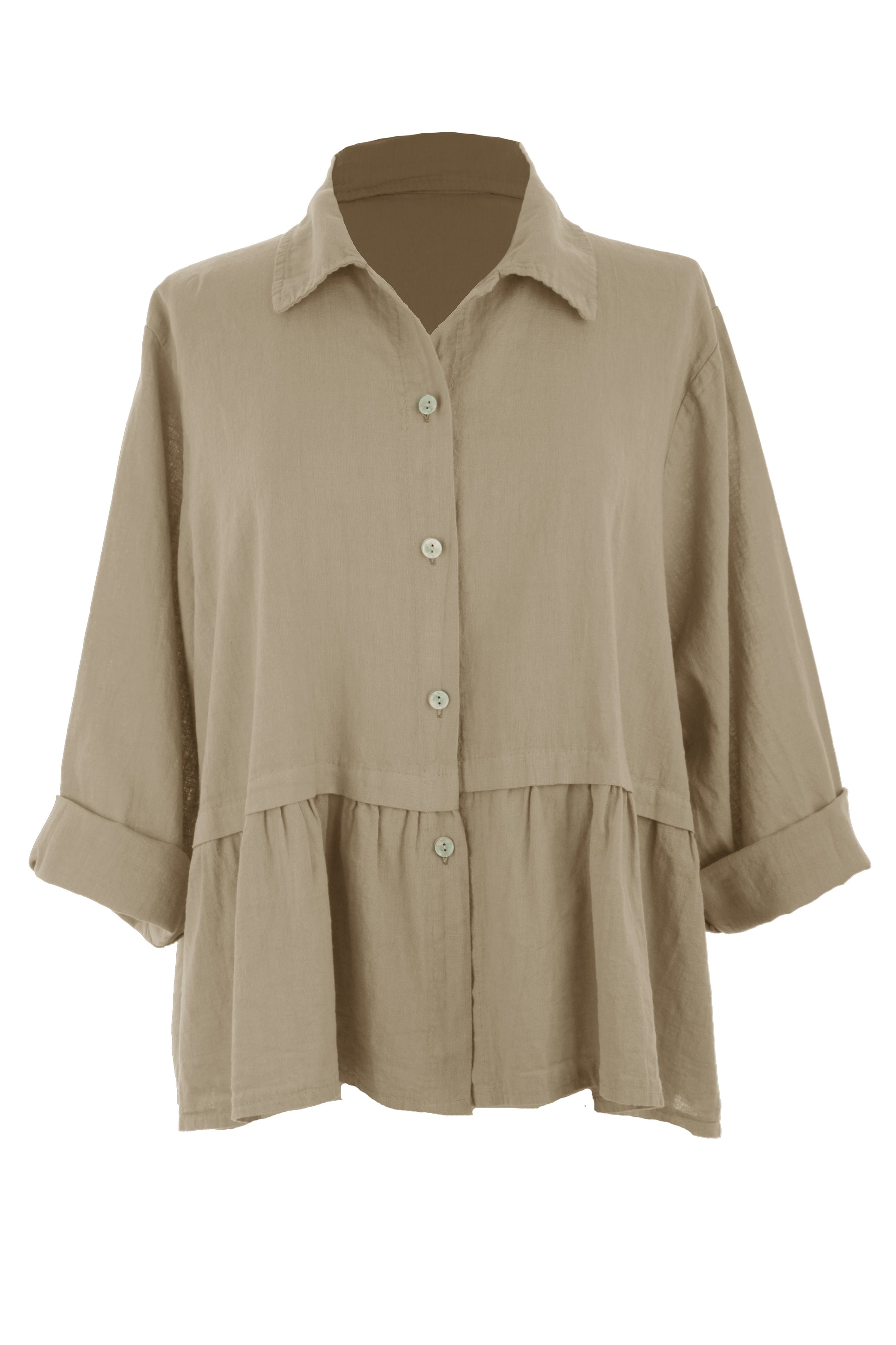 The relaxed, lagenlook design features a classic collar and long sleeves that can be elegantly rolled up.
