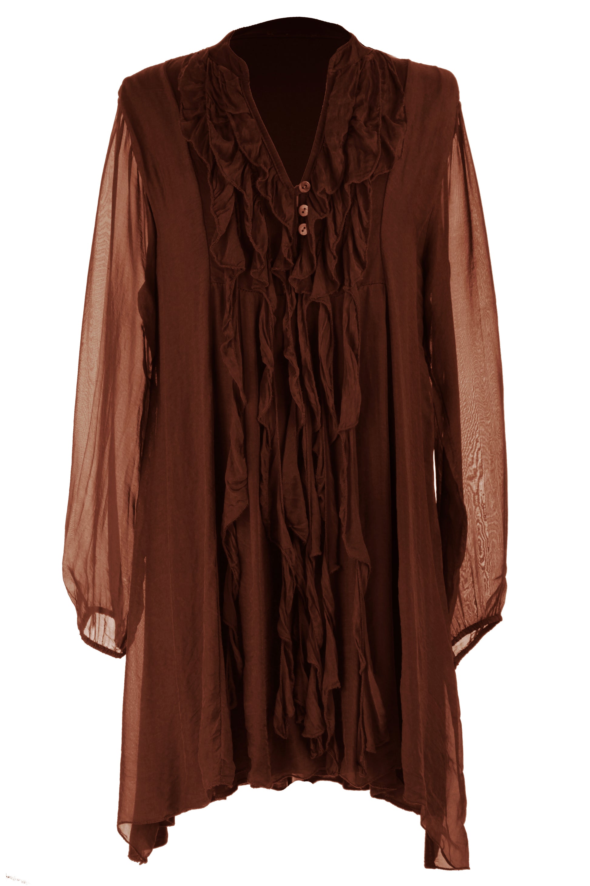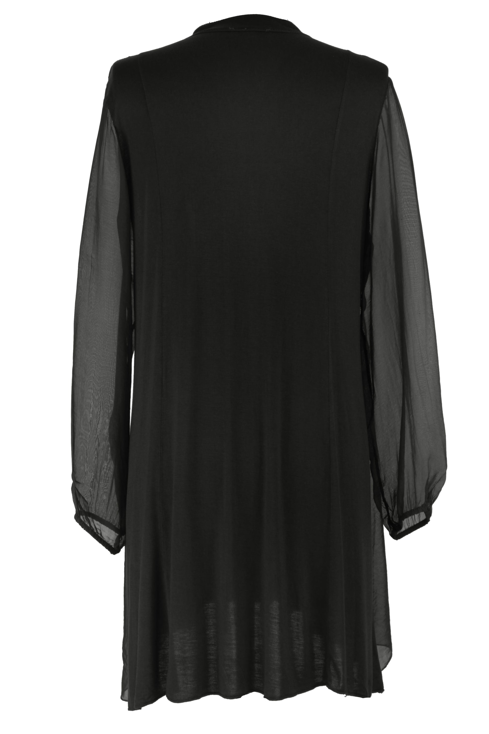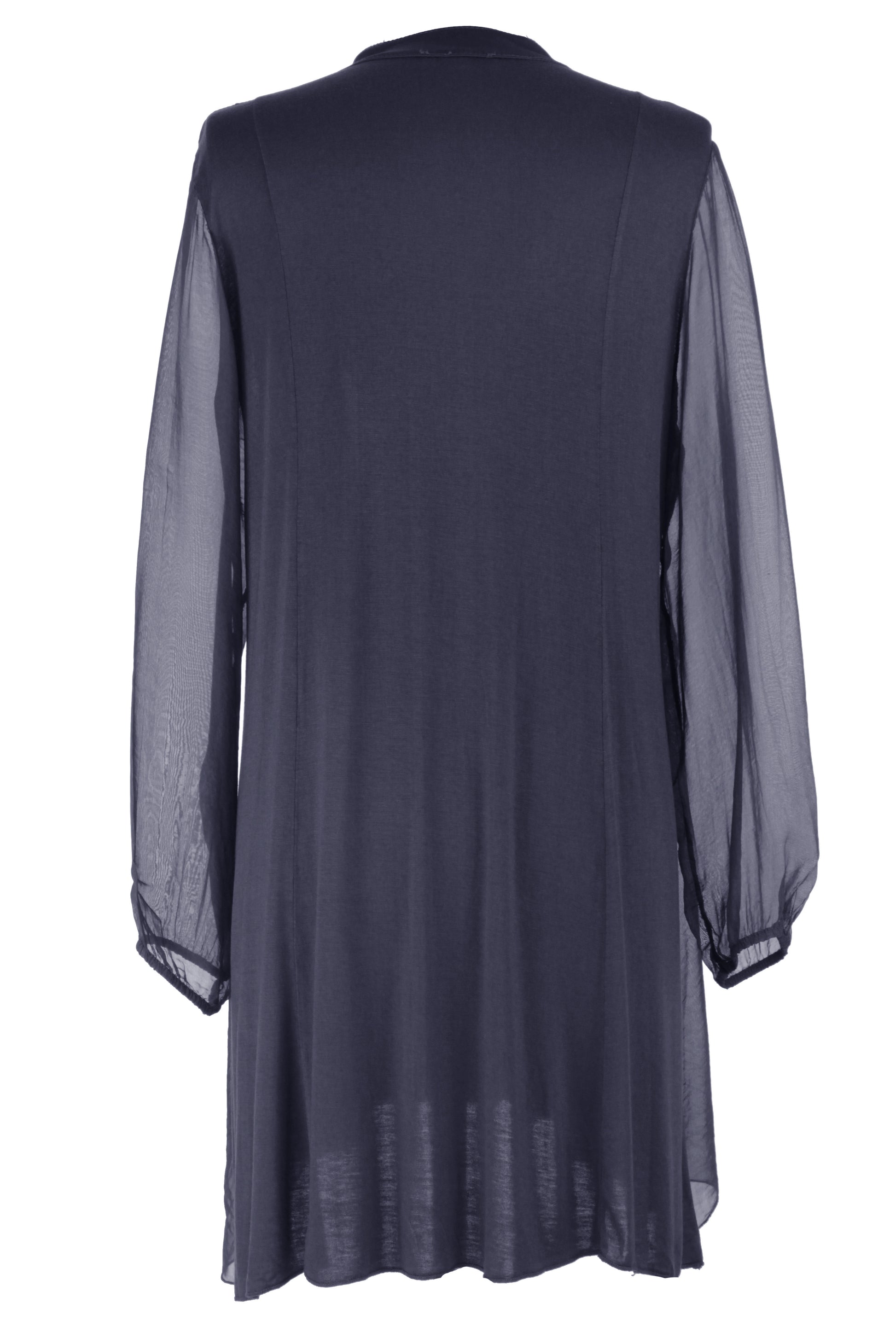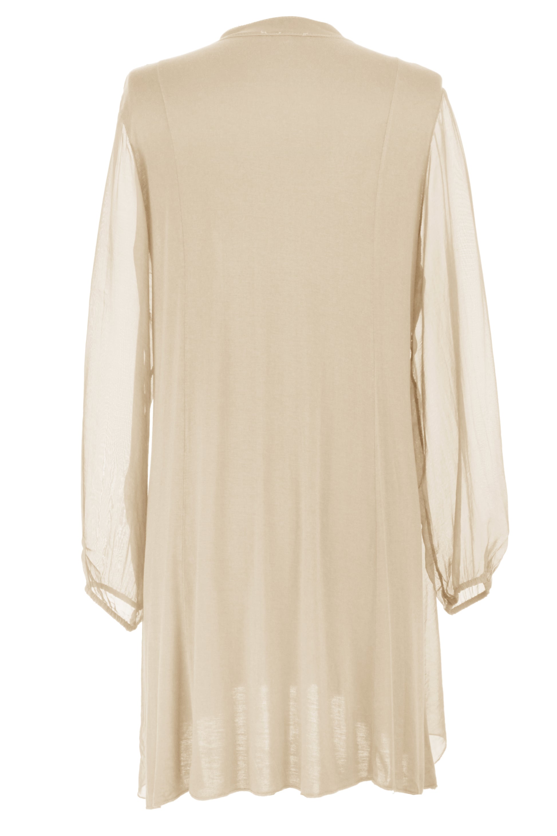 The long, sheer sleeves gather gracefully at the wrists, while the flowing Lagenlook cut offers both comfort and style.