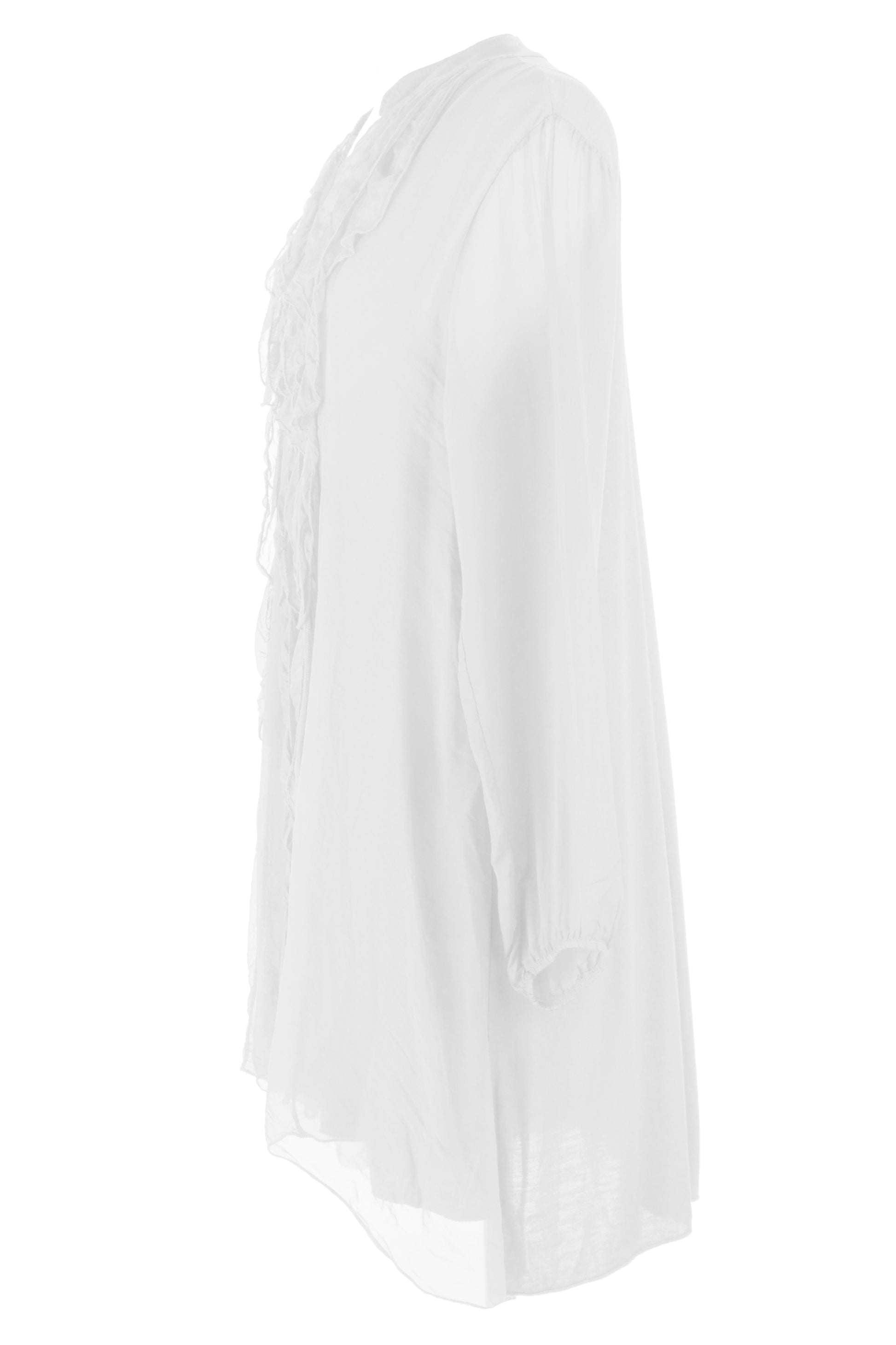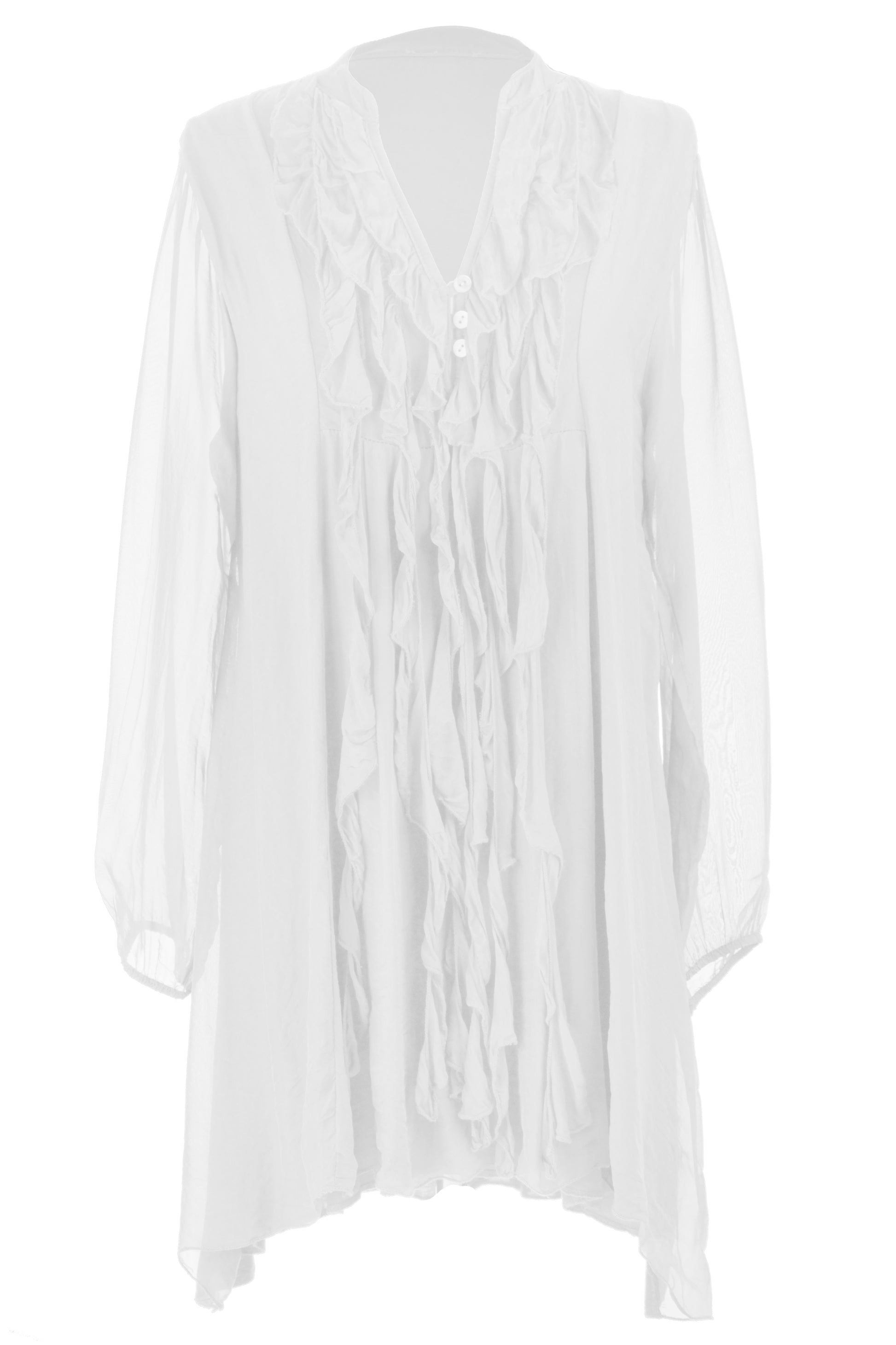 Design features an elegant V-neckline adorned with cascading frills and three button opening, creating a romantic and feminine silhouette.