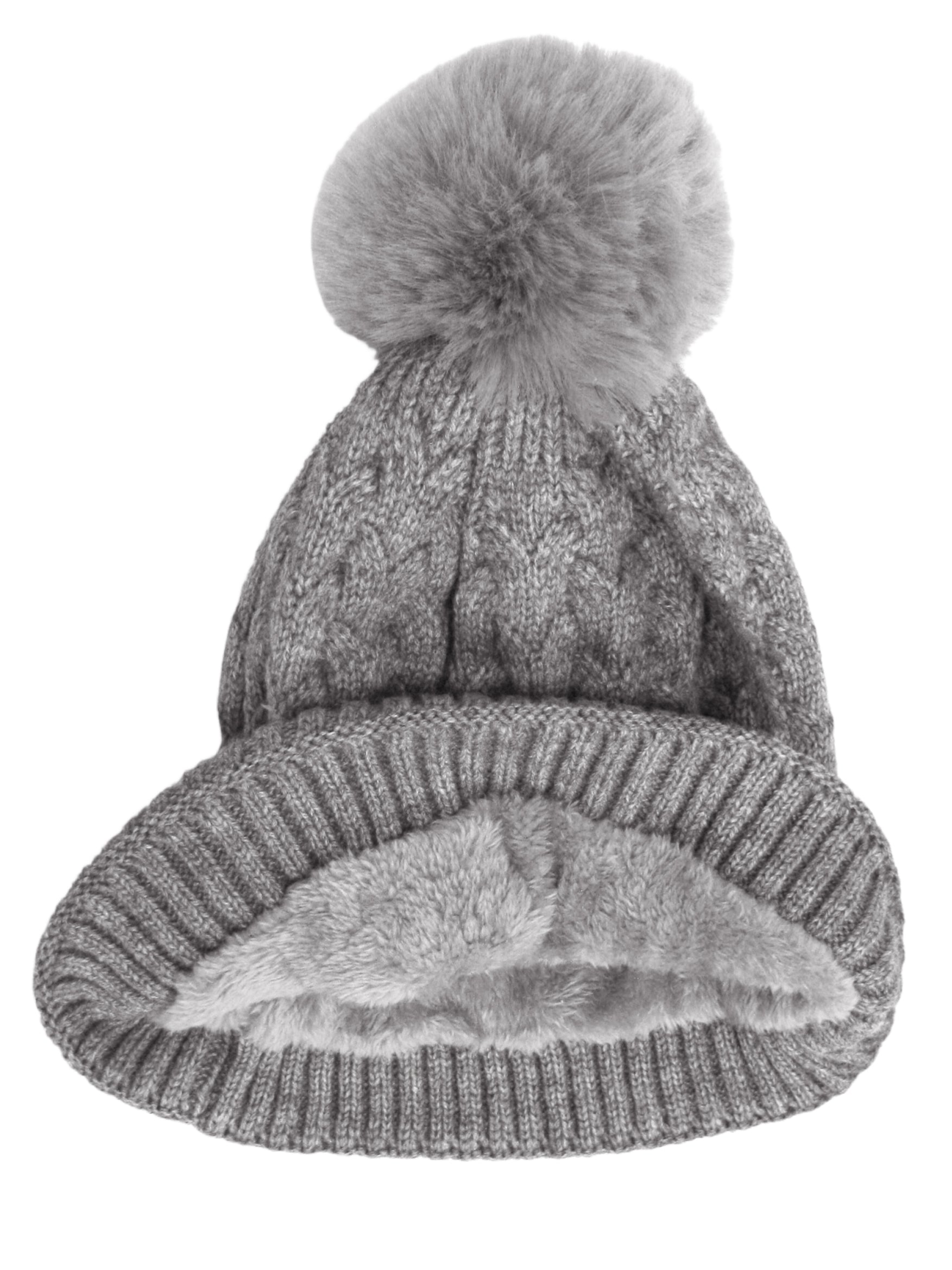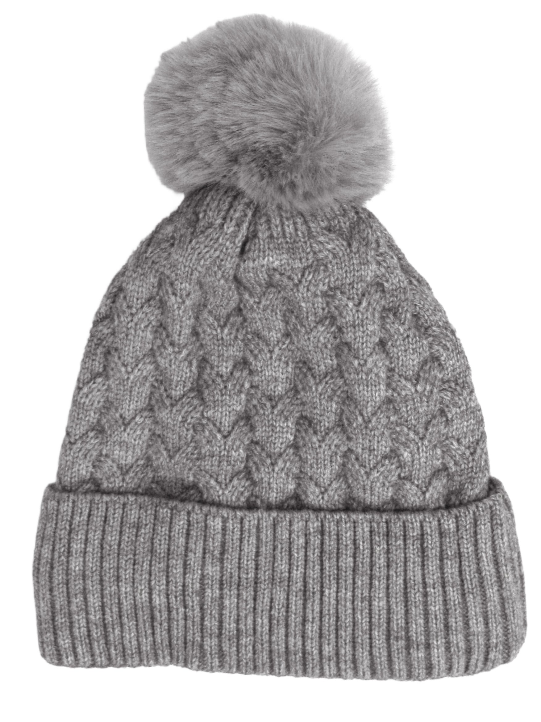 This beautifully crafted winter accessory features an intricate knitted heart design and a luxurious faux fur pom pom that adds a playful touch to your cold-weather ensemble.