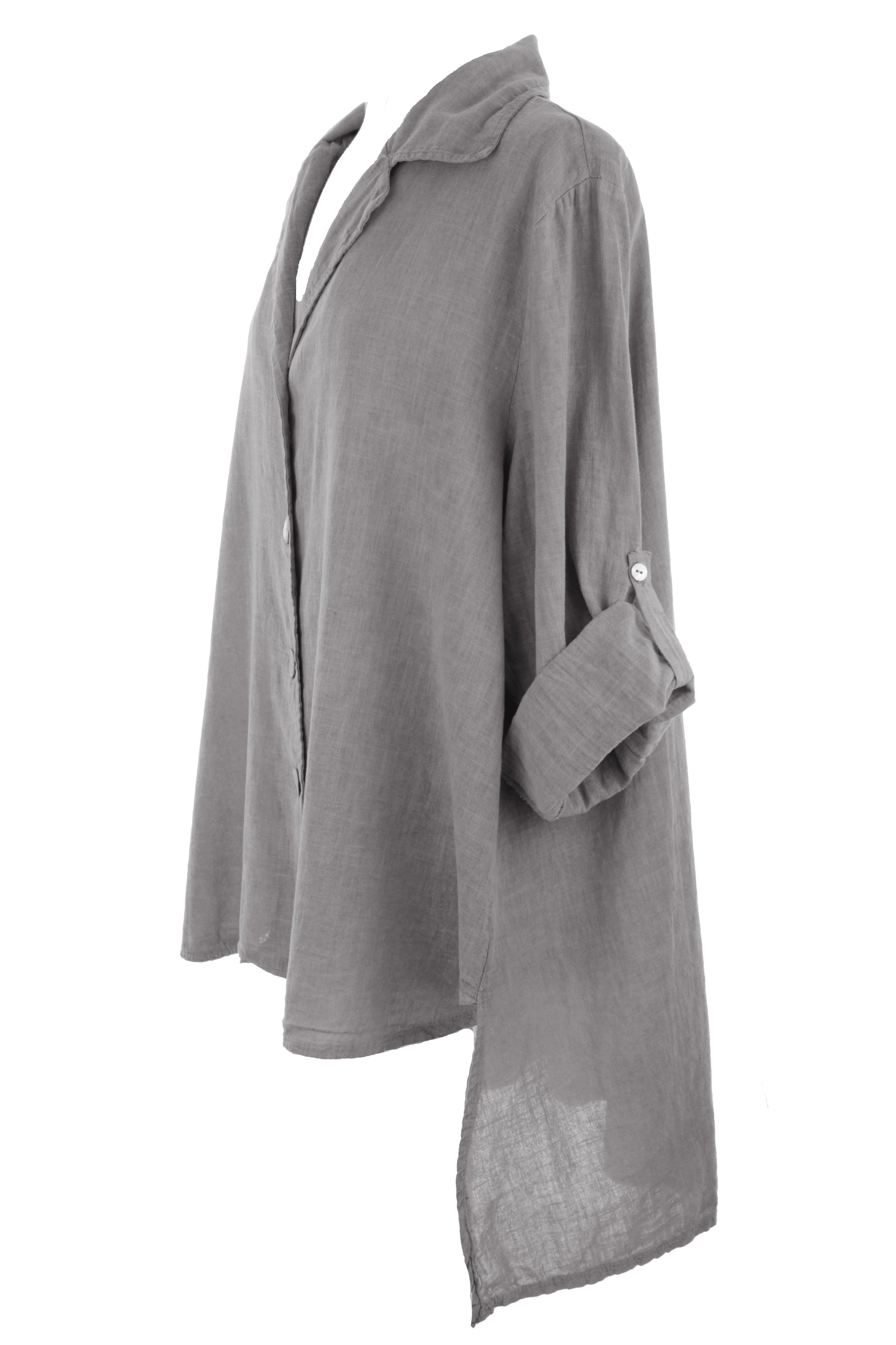 The classic collar neck and button-front closure create a timeless silhouette, while the contemporary high-low hem adds a modern twist.