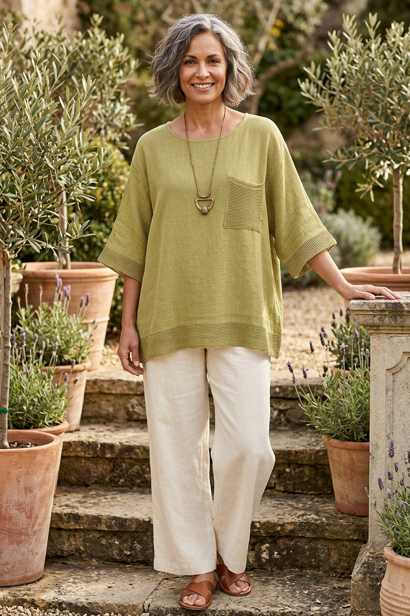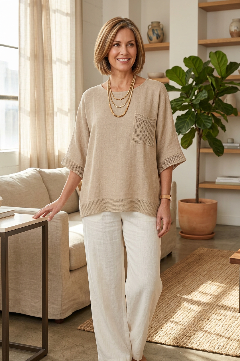 Crafted in a soft, breathable linen blend fabric, this relaxed fit blouse features a classic round neckline and comfortable short sleeves, making it ideal for warm days and layering alike.