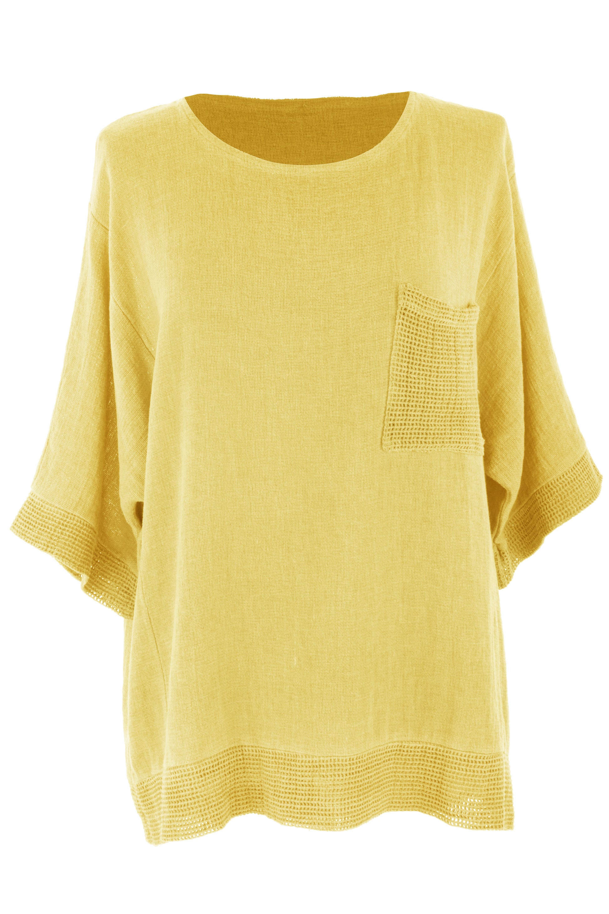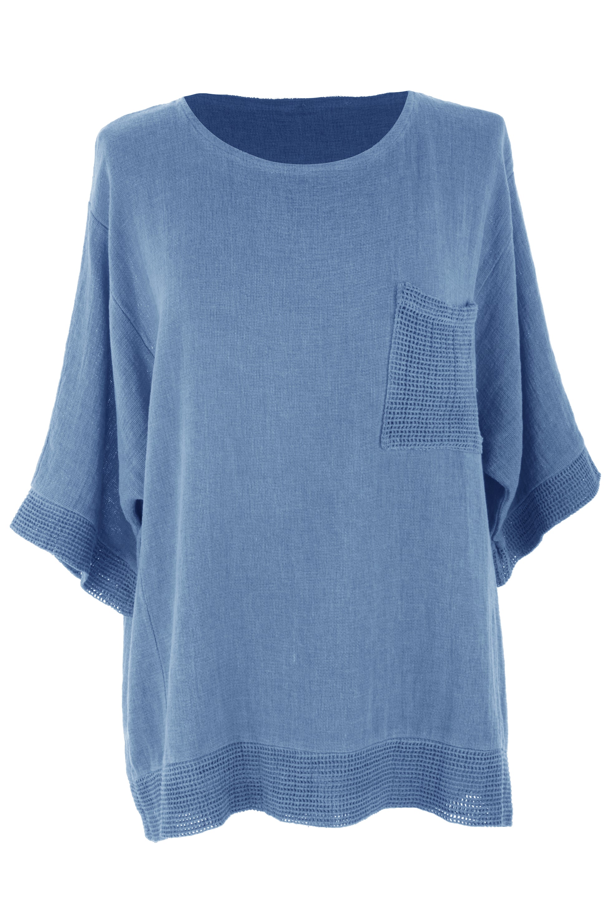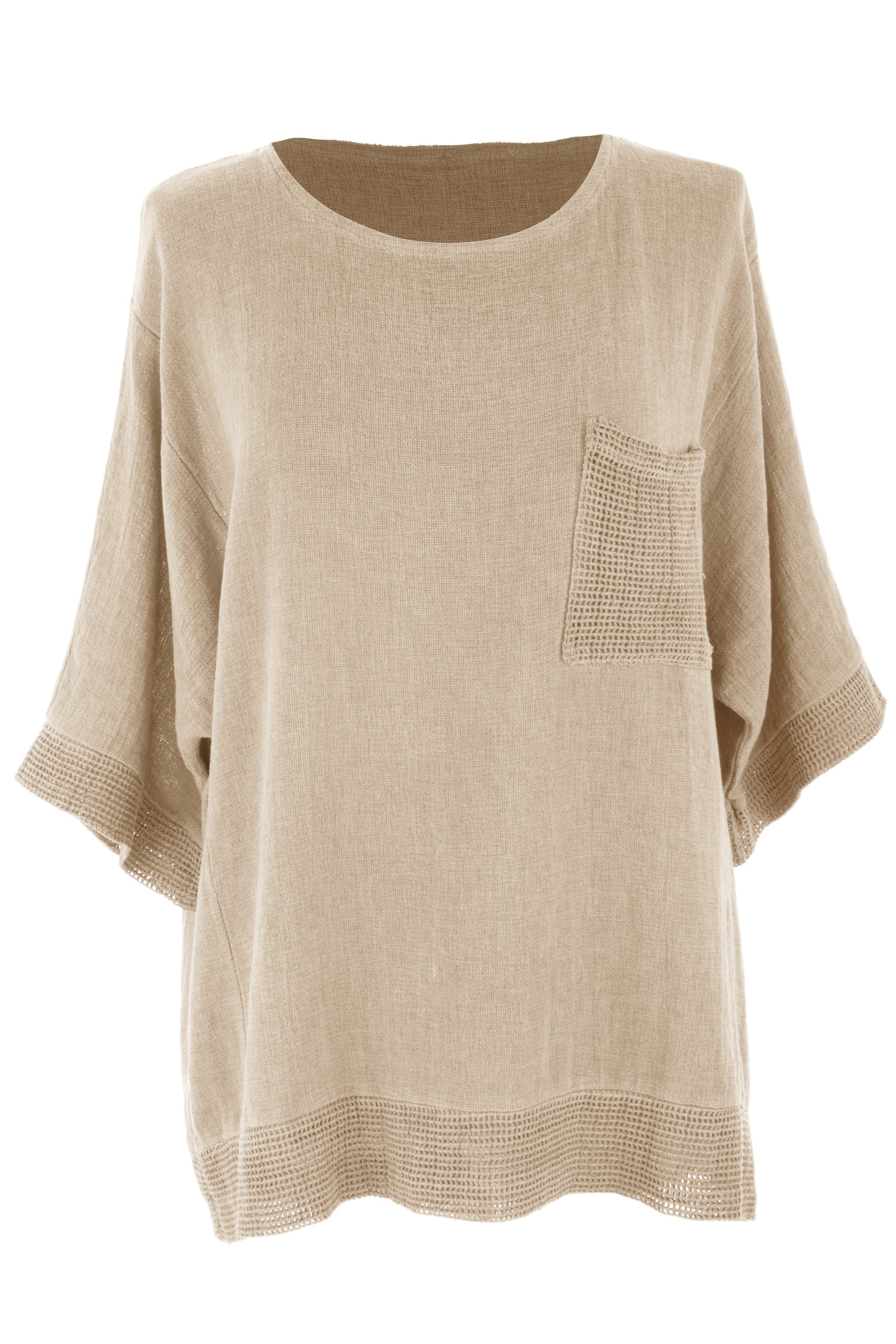 The standout detail is the textured mesh pocket on the chest, which is beautifully echoed by matching open-weave mesh trim along the sleeve cuffs and hem, adding a subtle artisan touch to the overall design.
