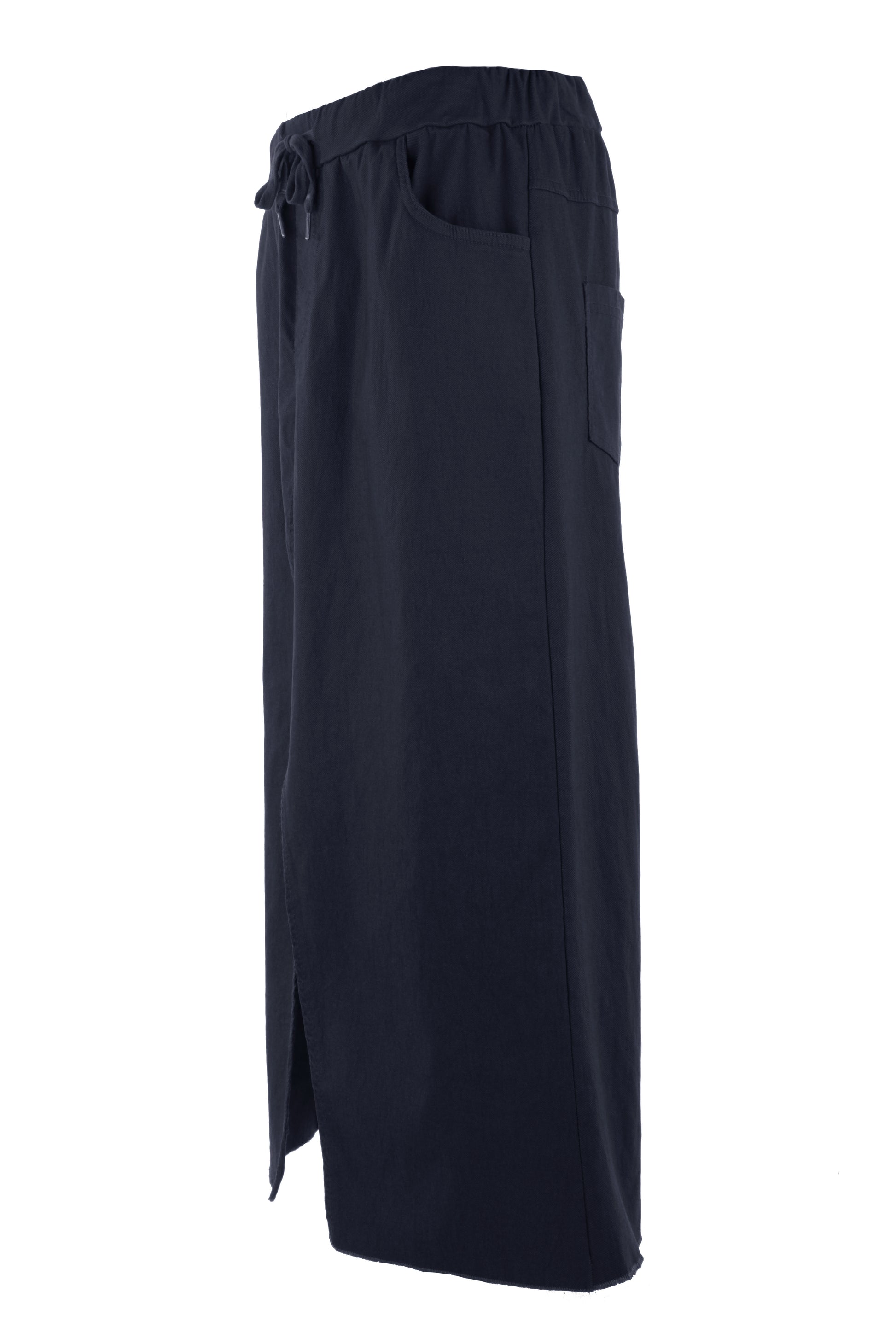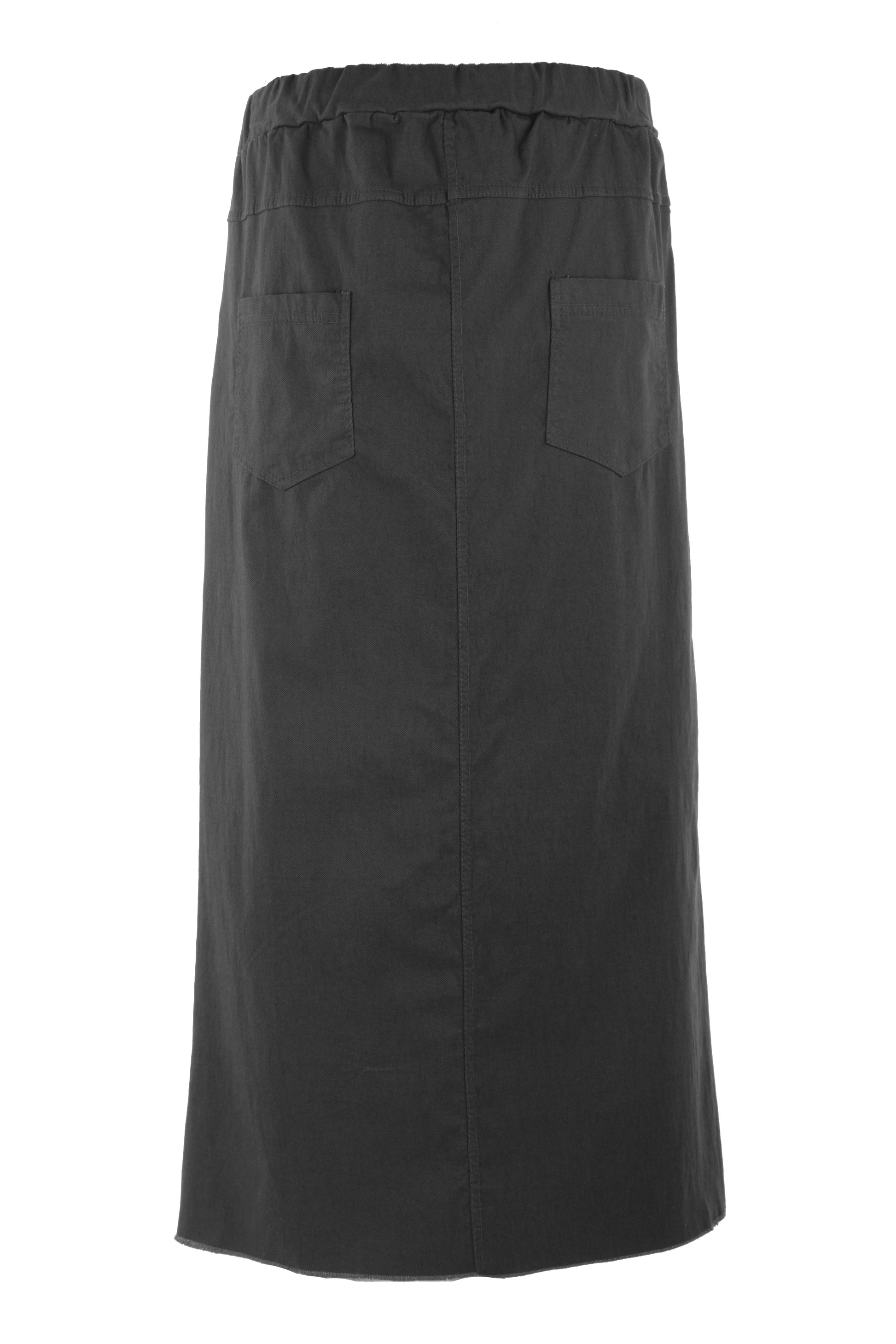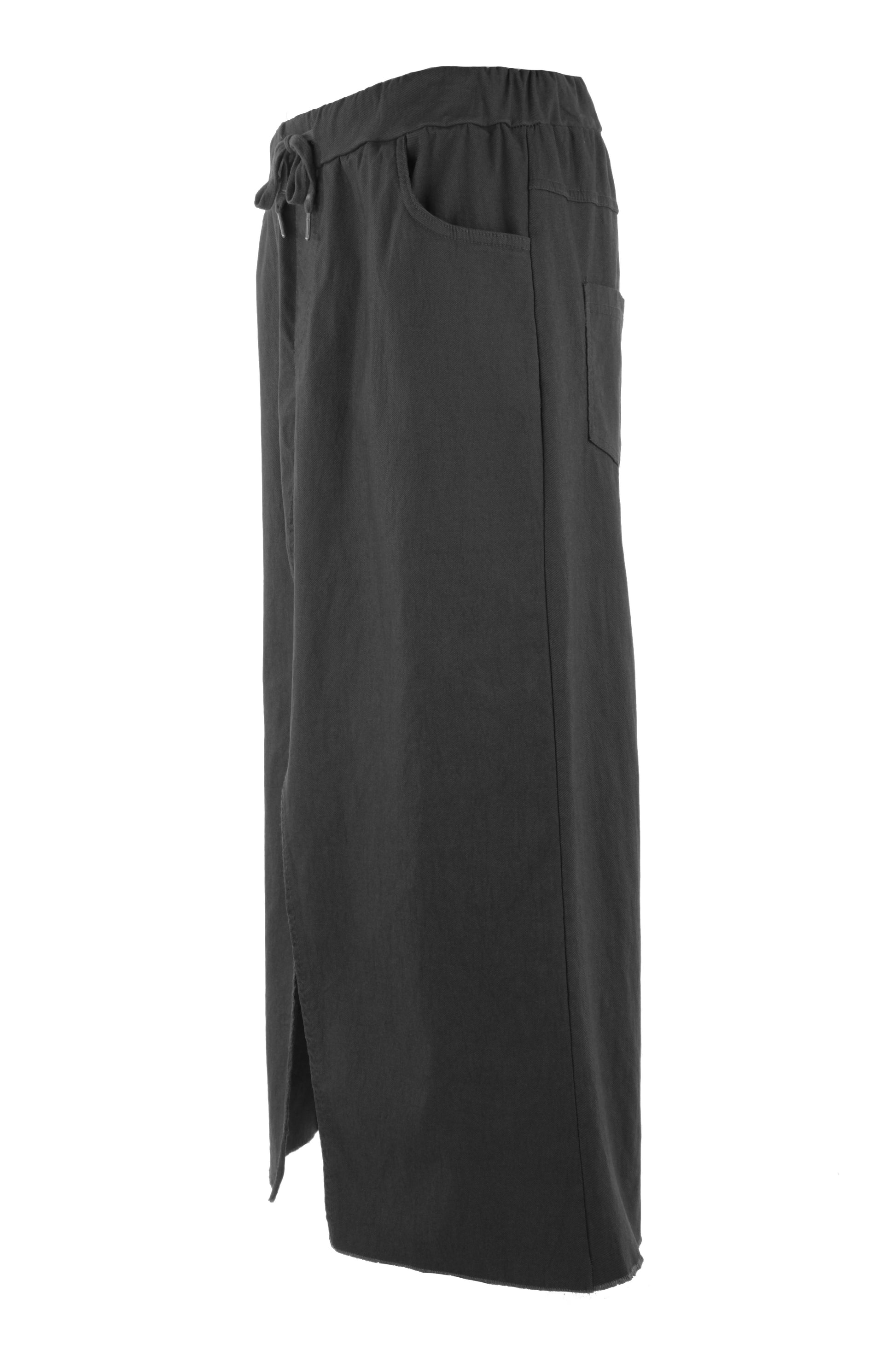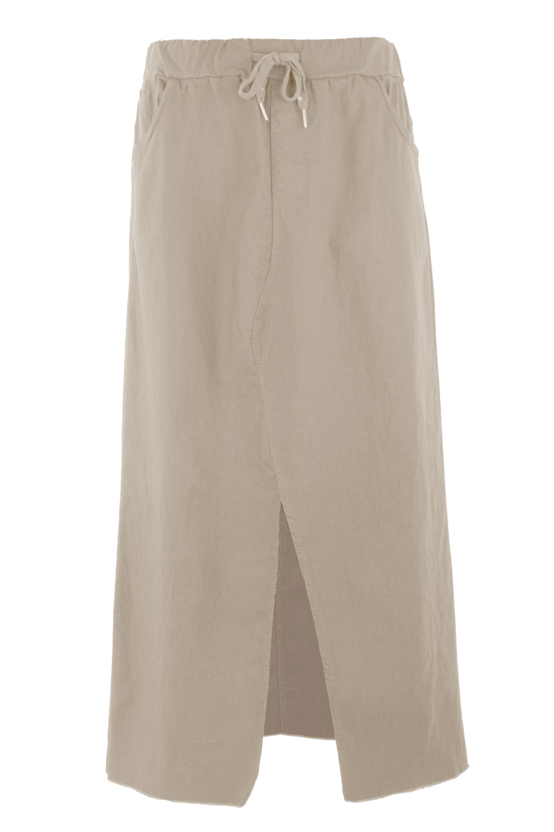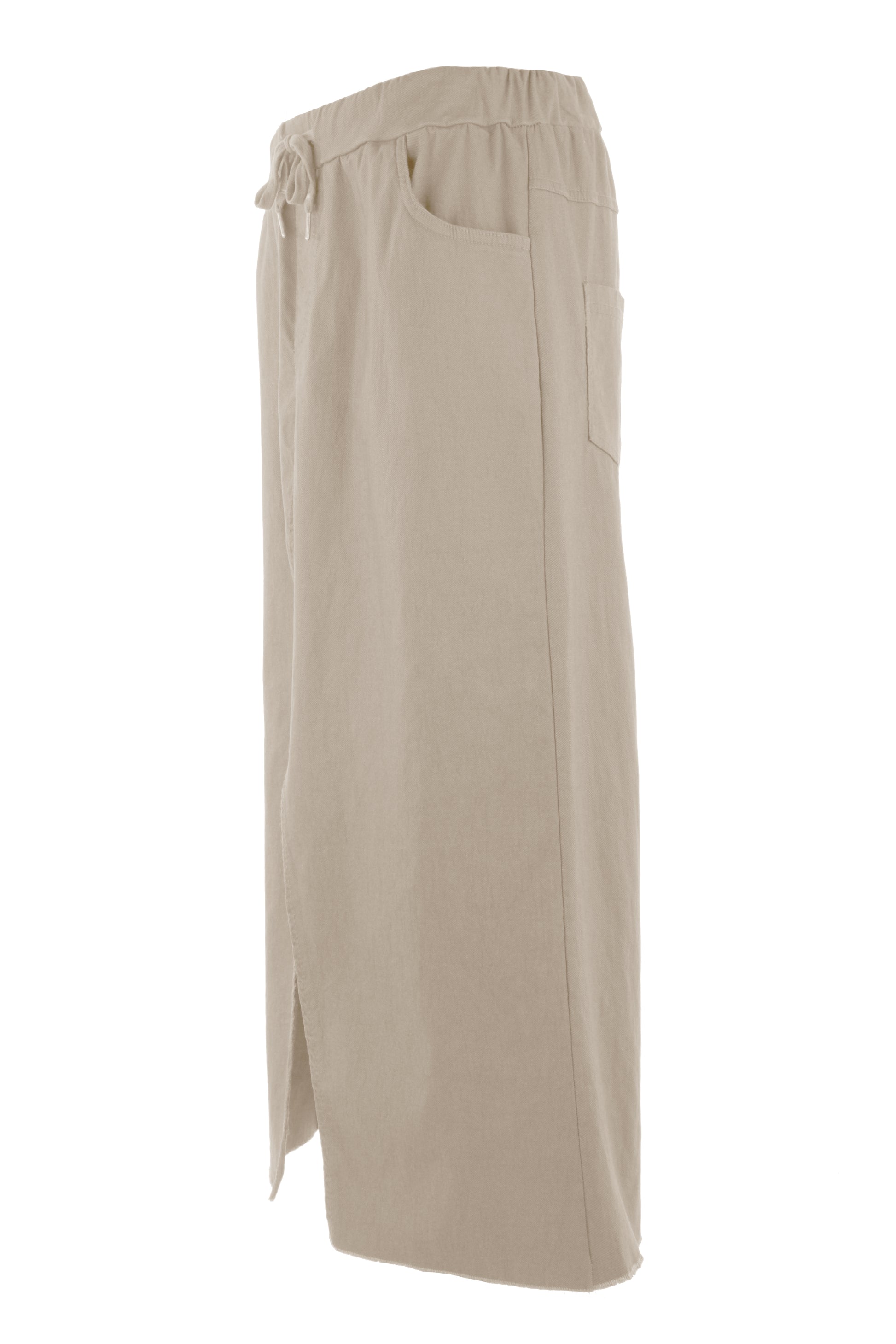 - Featuring elasticated tie waist, pocket on the sides and back, raw edge hemline finished with a flattering slit on the front.
