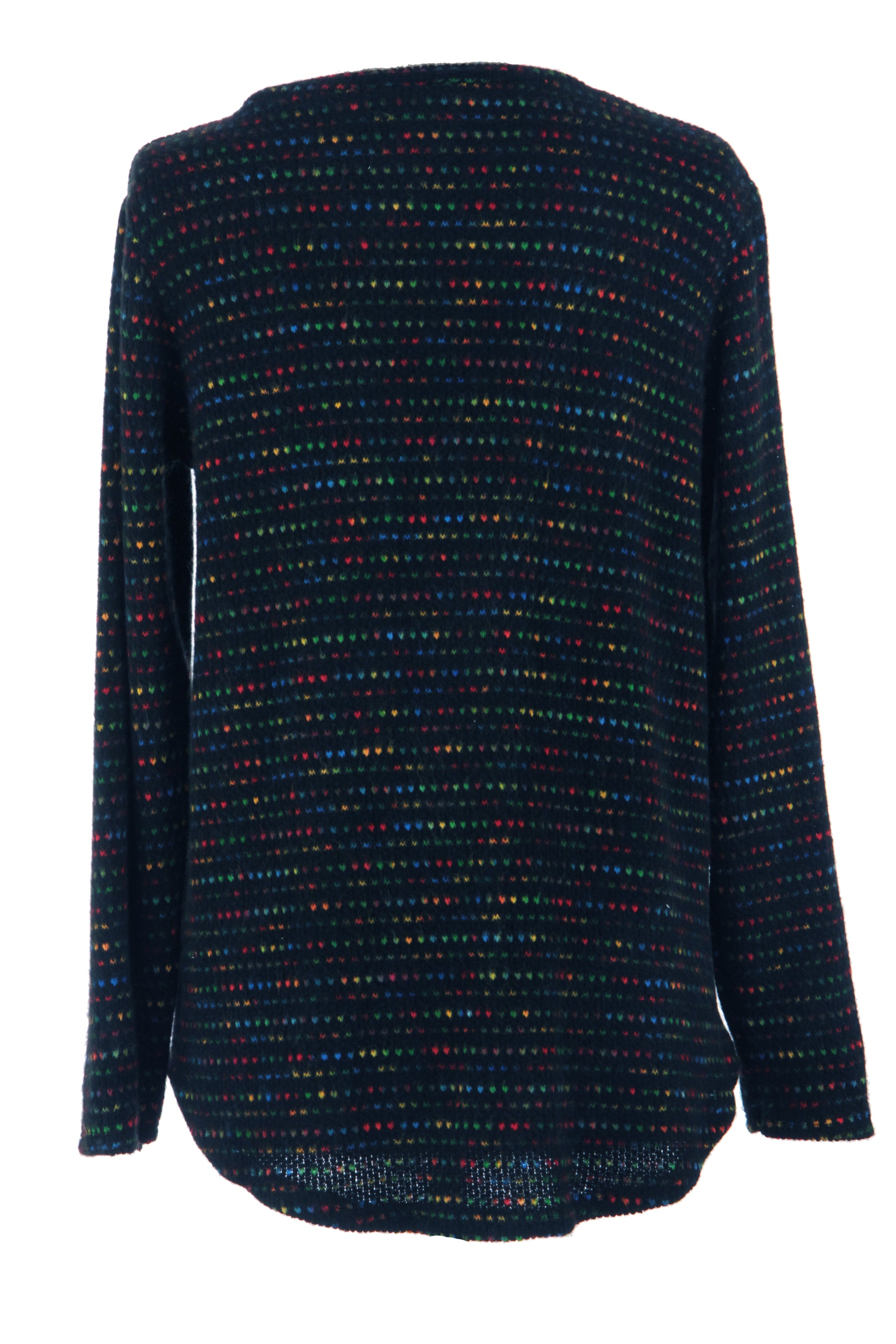 - Soft tweed weave multicolored flecks top features classic scoop neck, long sleeves, one pocket on the front and slightly asymmetric hi-low hemline.