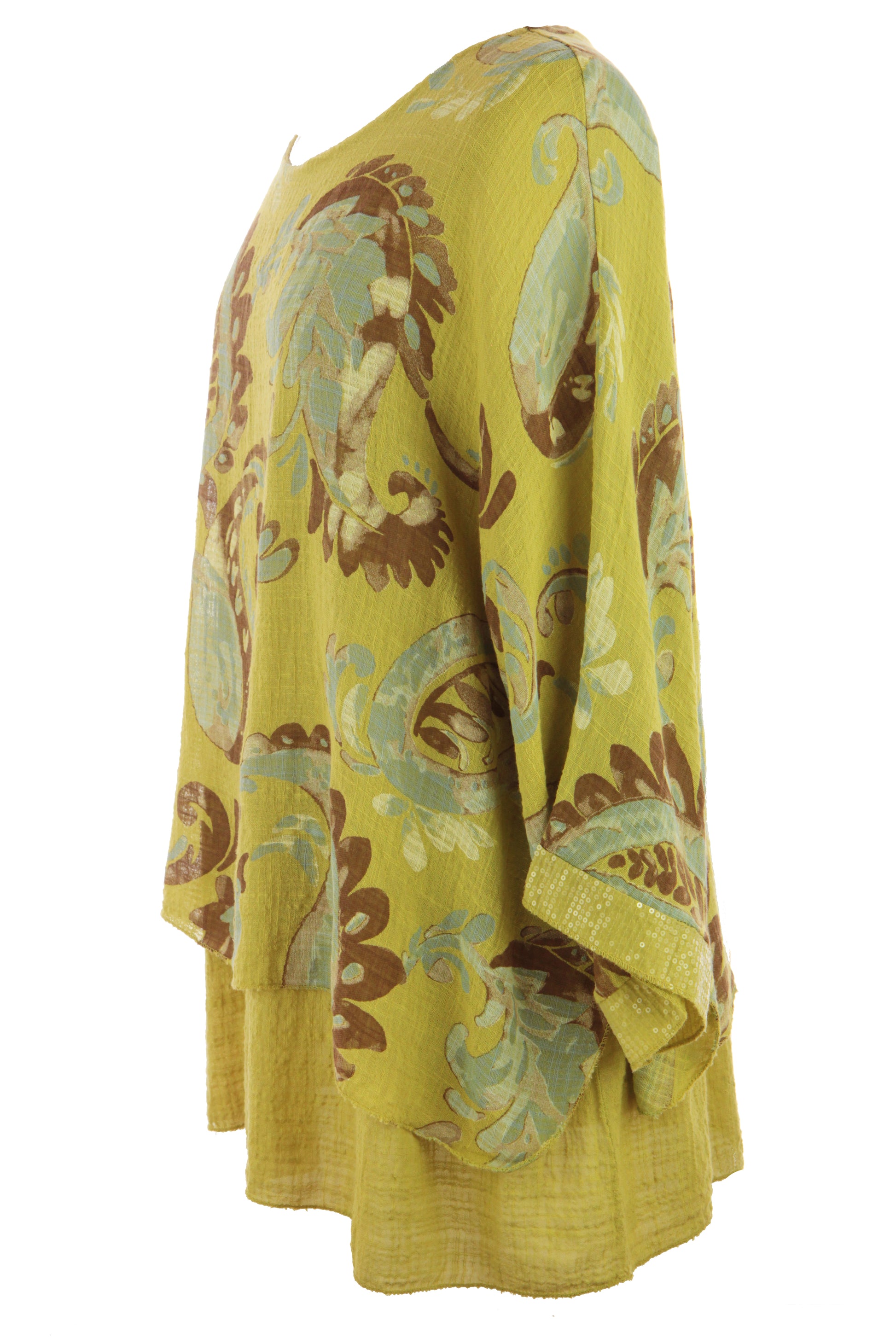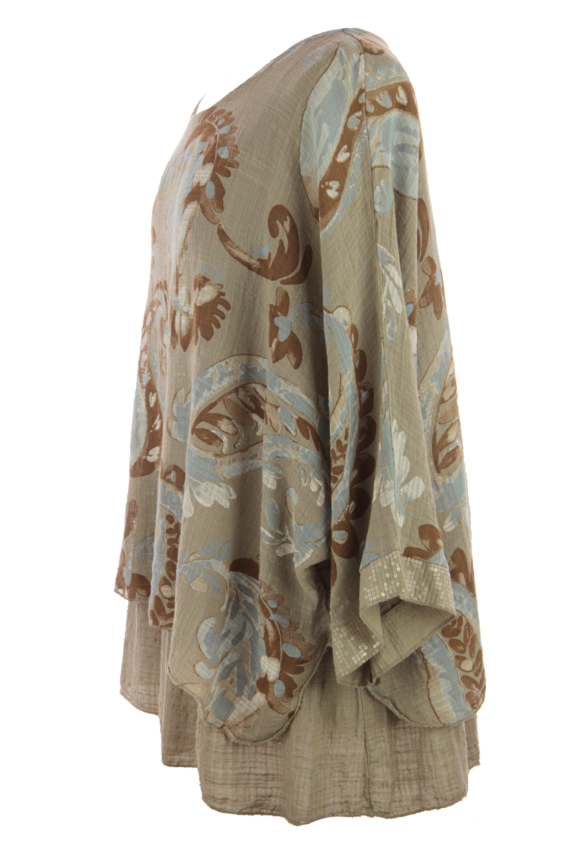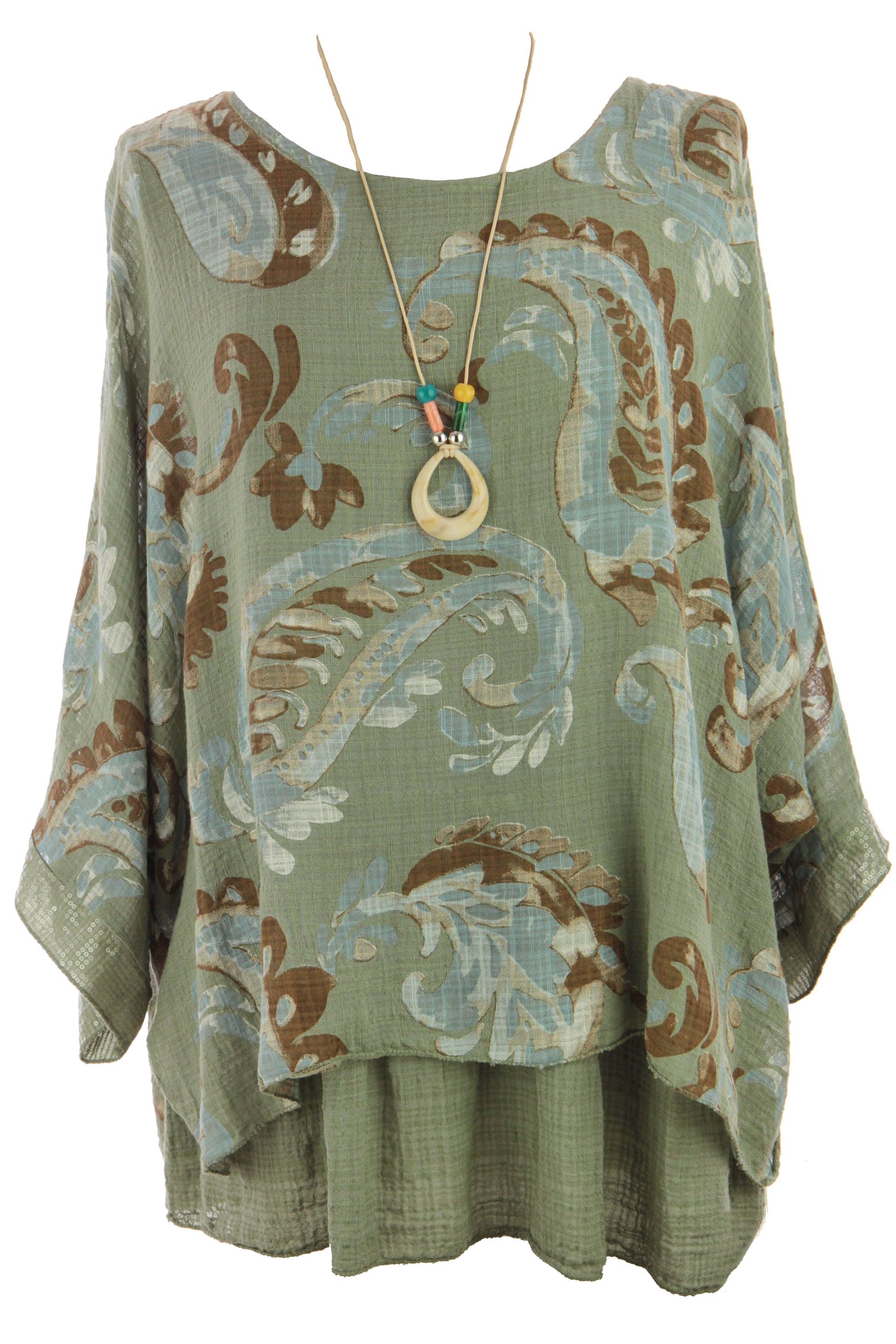 Elevate your wardrobe with this stunning Italian-style layered cotton top featuring an elegant paisley print in sophisticated tones.