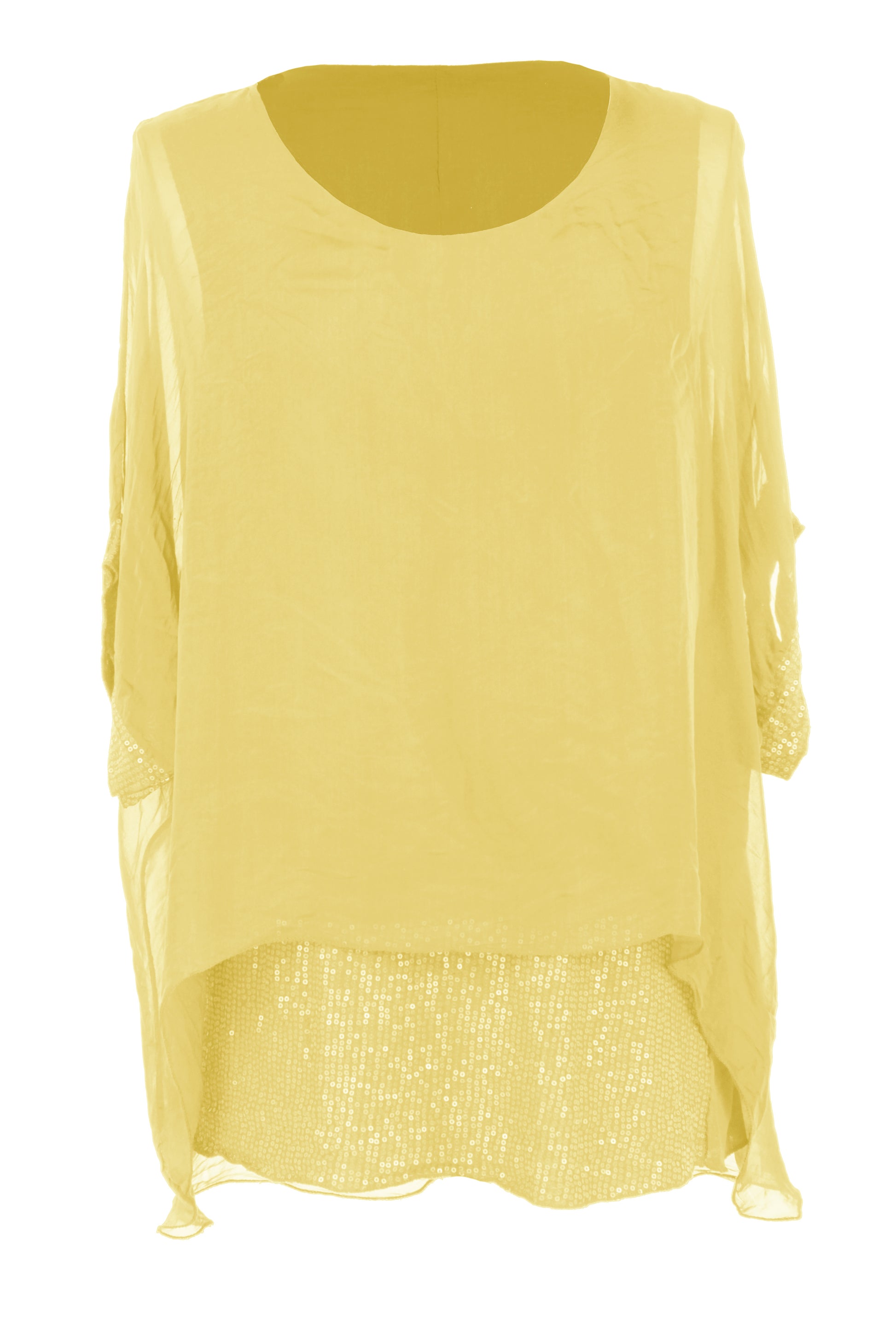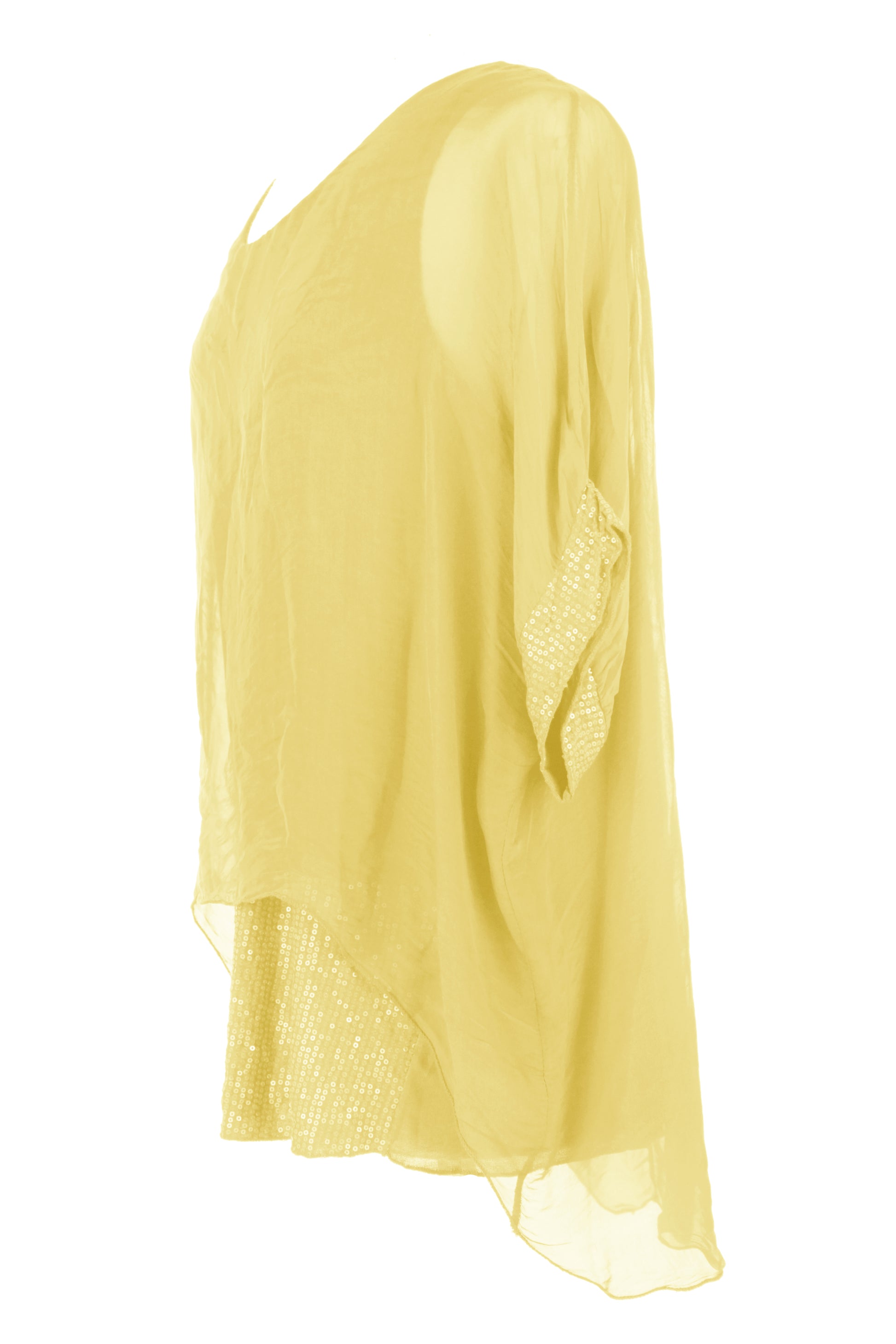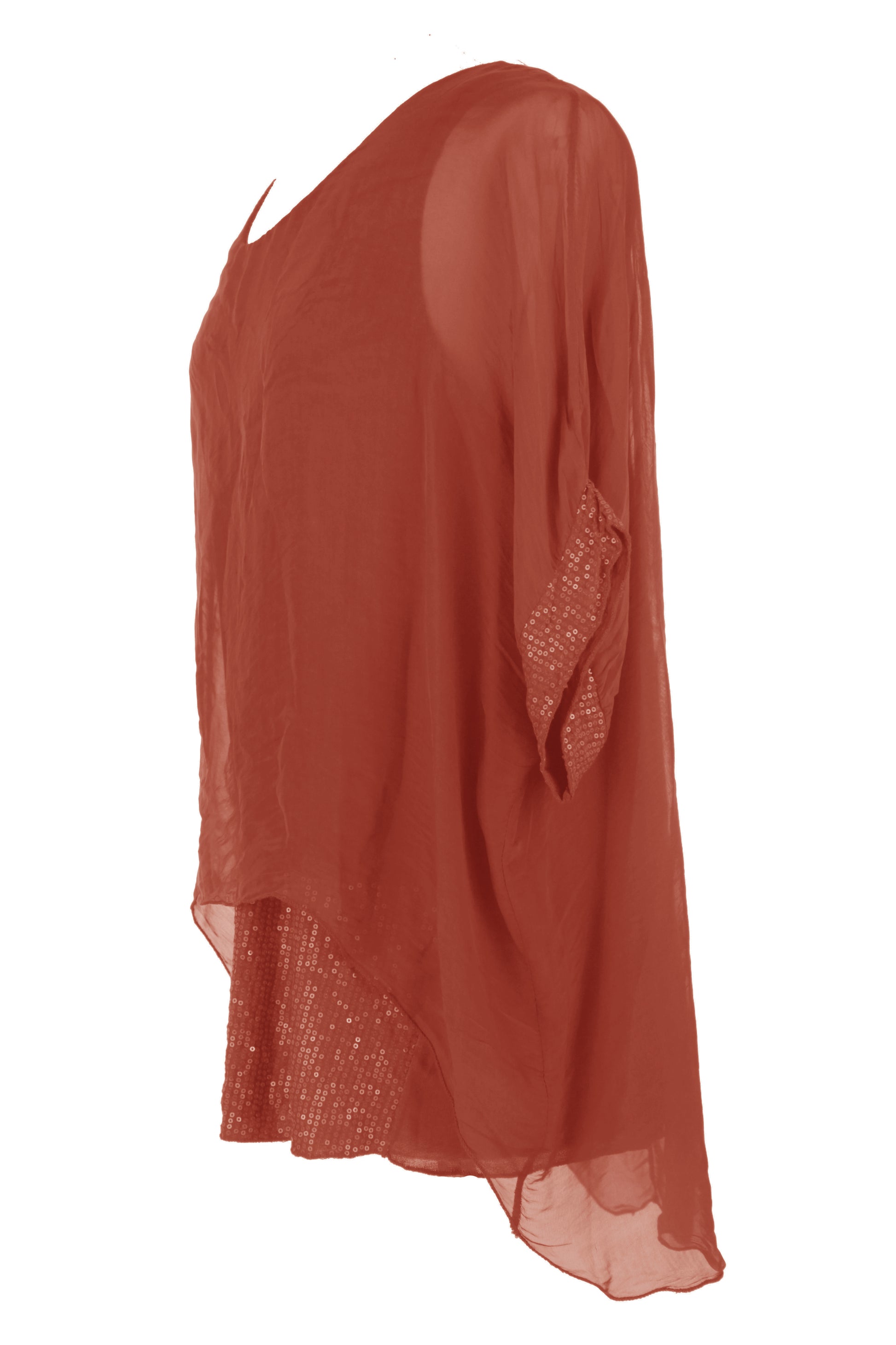 - Sheer silk layer with matching stretchy viscose lining attached underneath. Attached lining has a classy sequin panel hem giving a layered look.