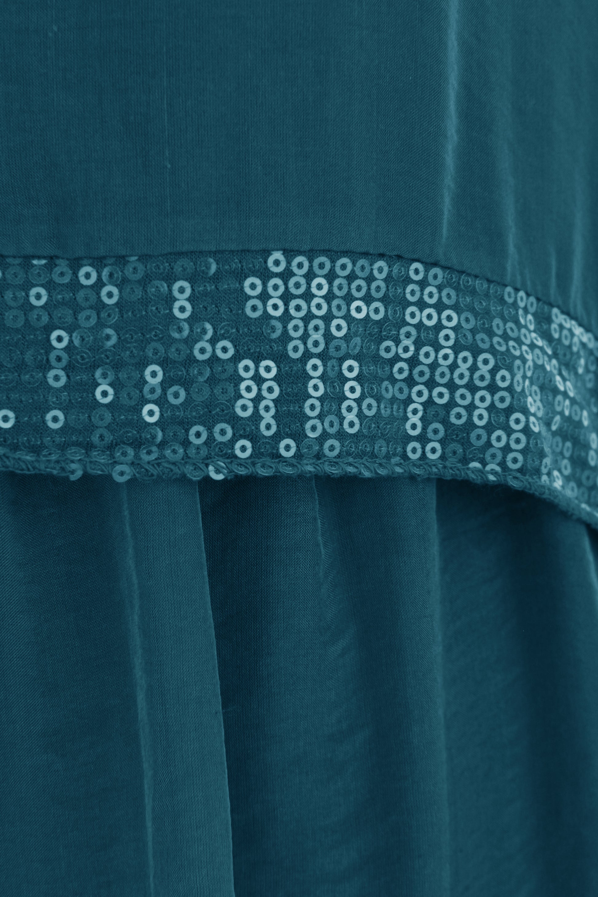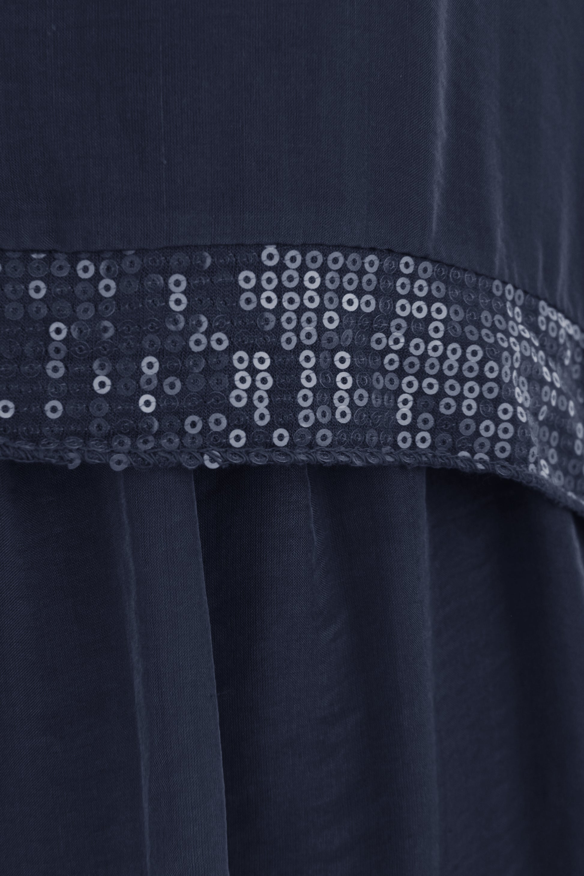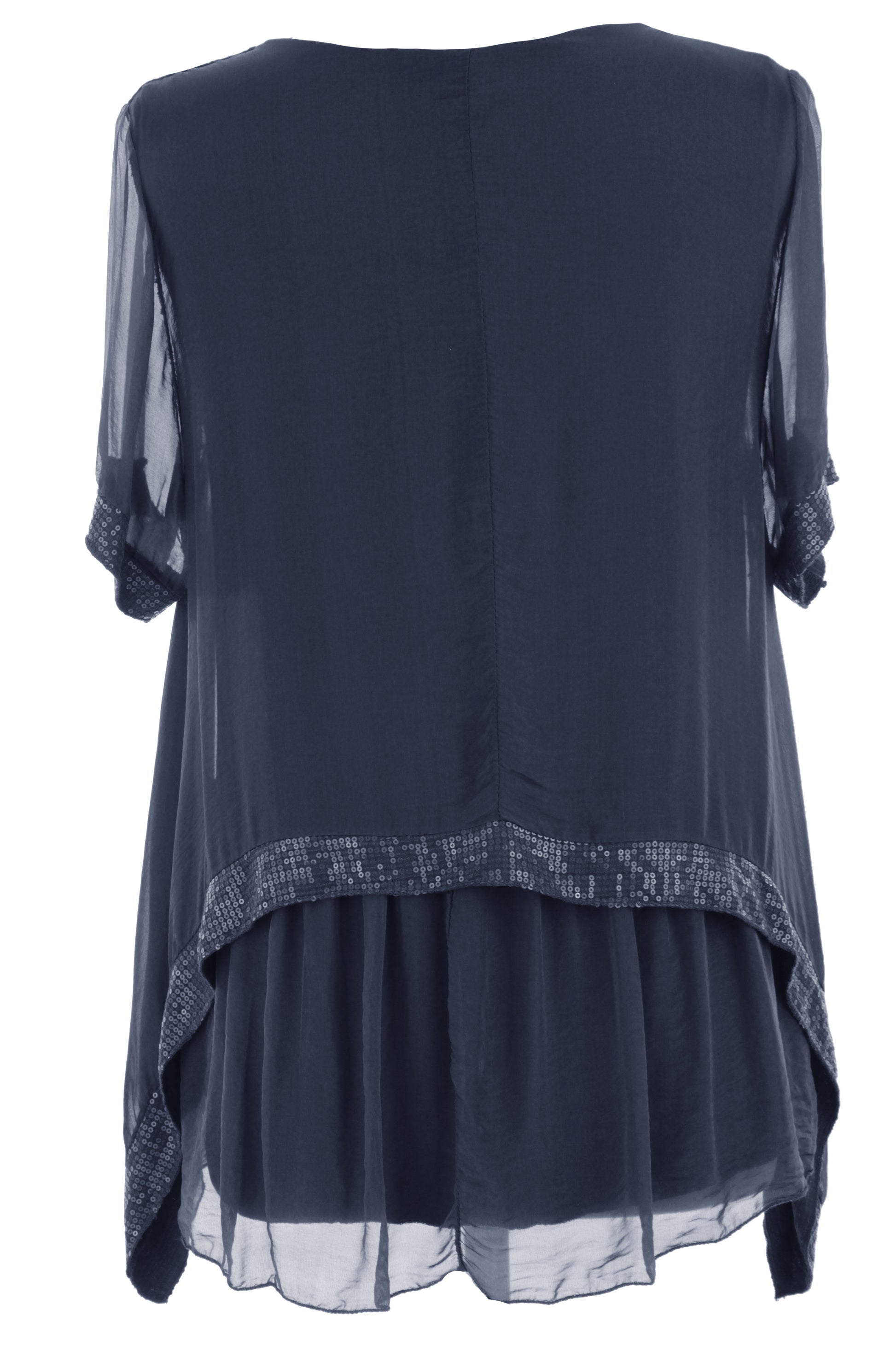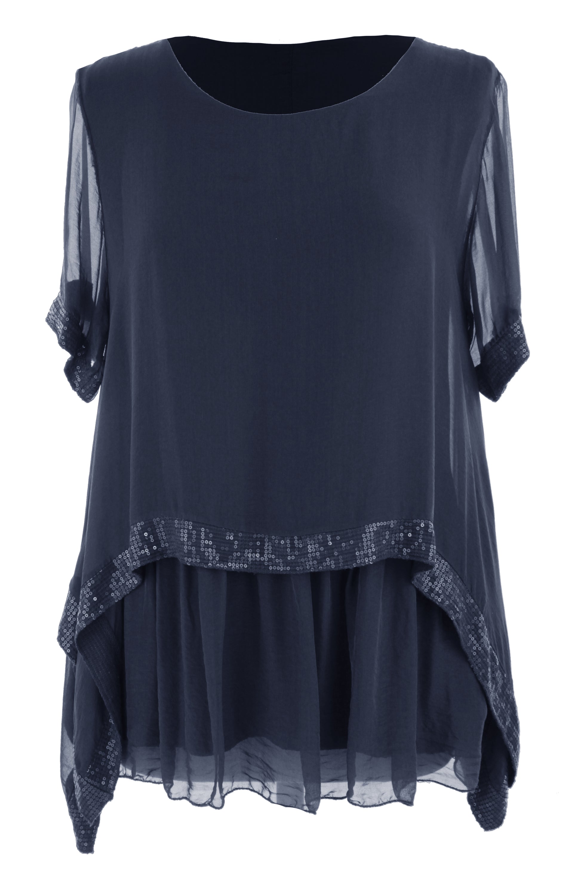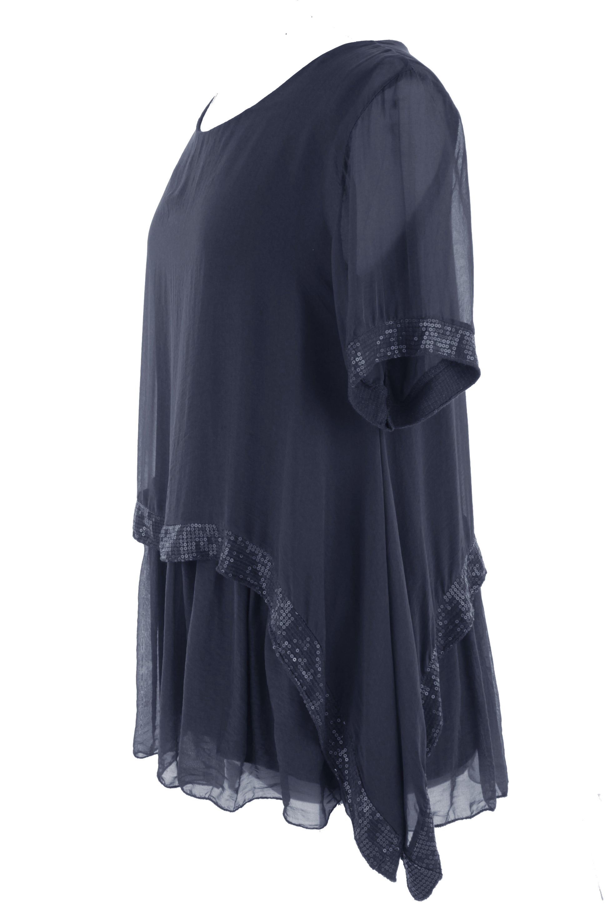 This versatile silk blend top features an elegant sequin trim that adds a touch of sparkle to the layered hem and sleeve details.