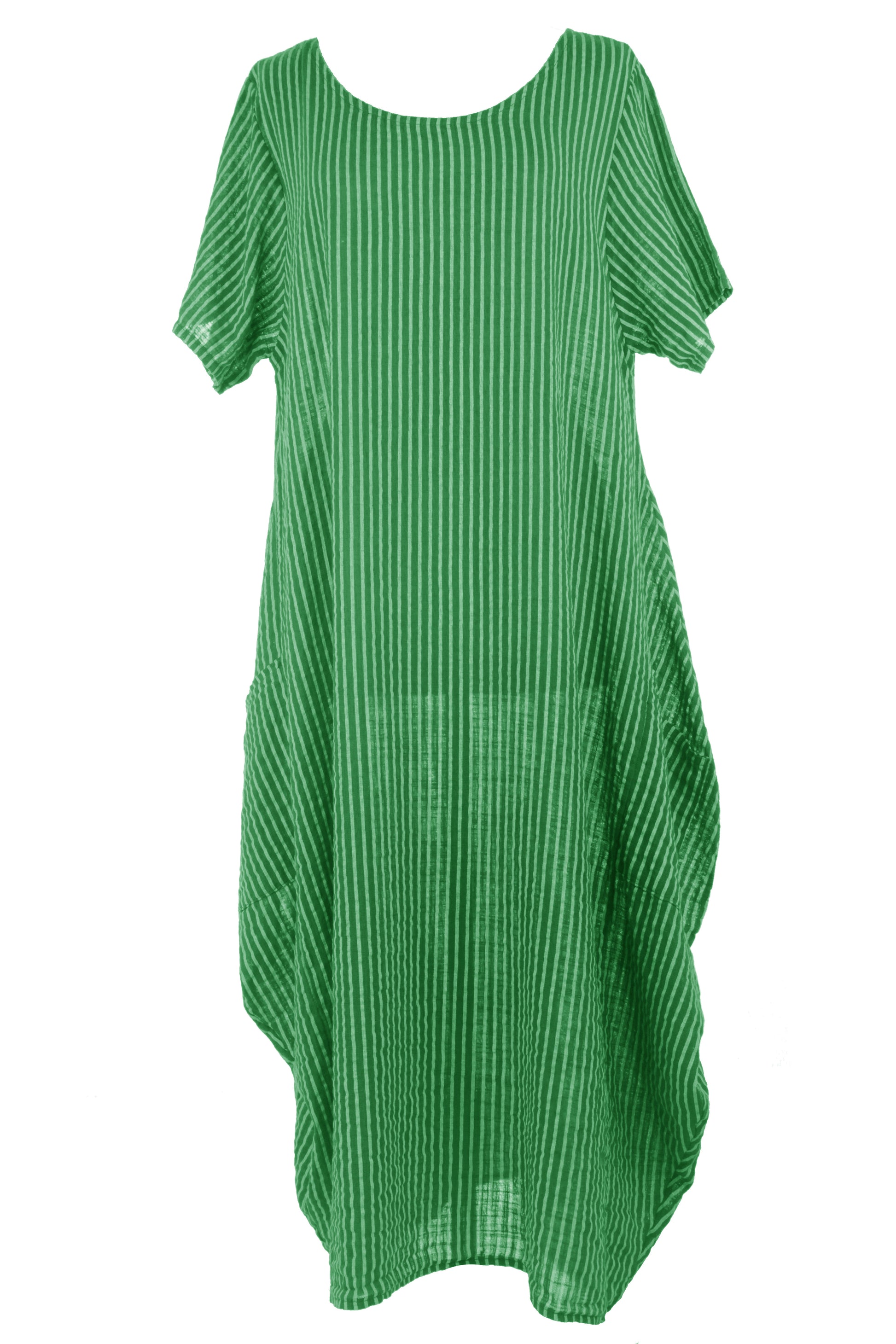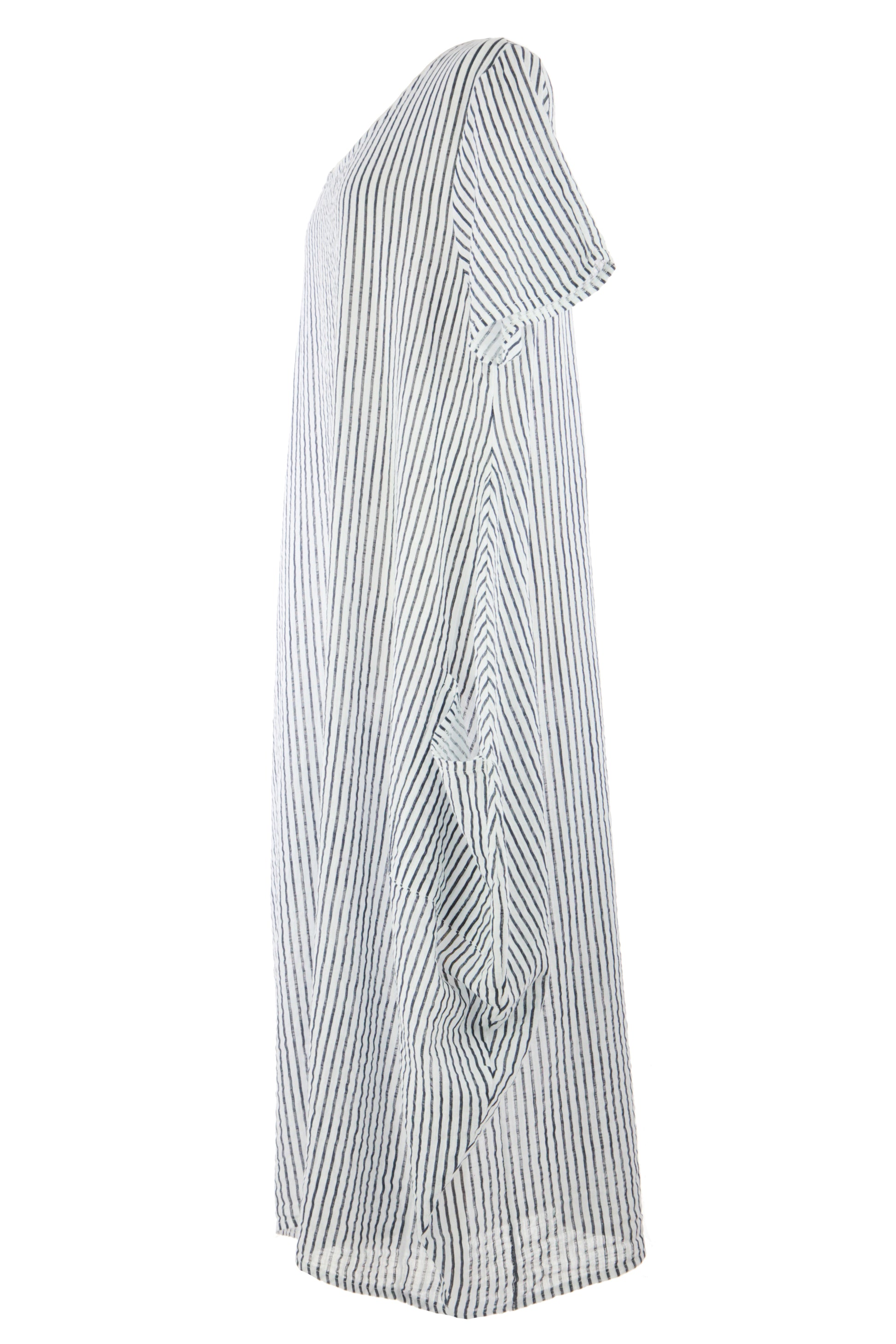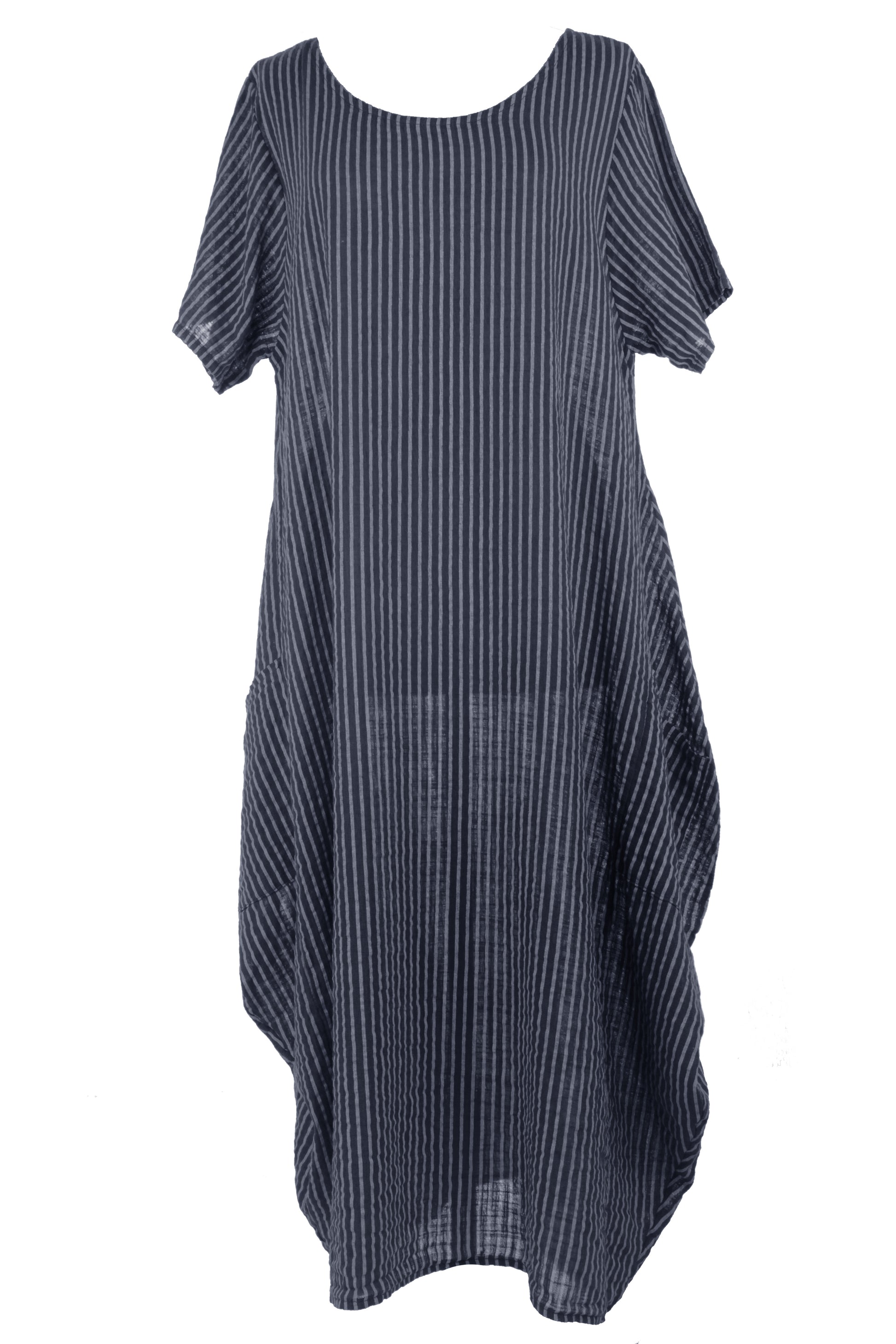 The distinctive vertical stripe pattern elongates the silhouette, while the tulip-style hem adds an artistic flourish.
