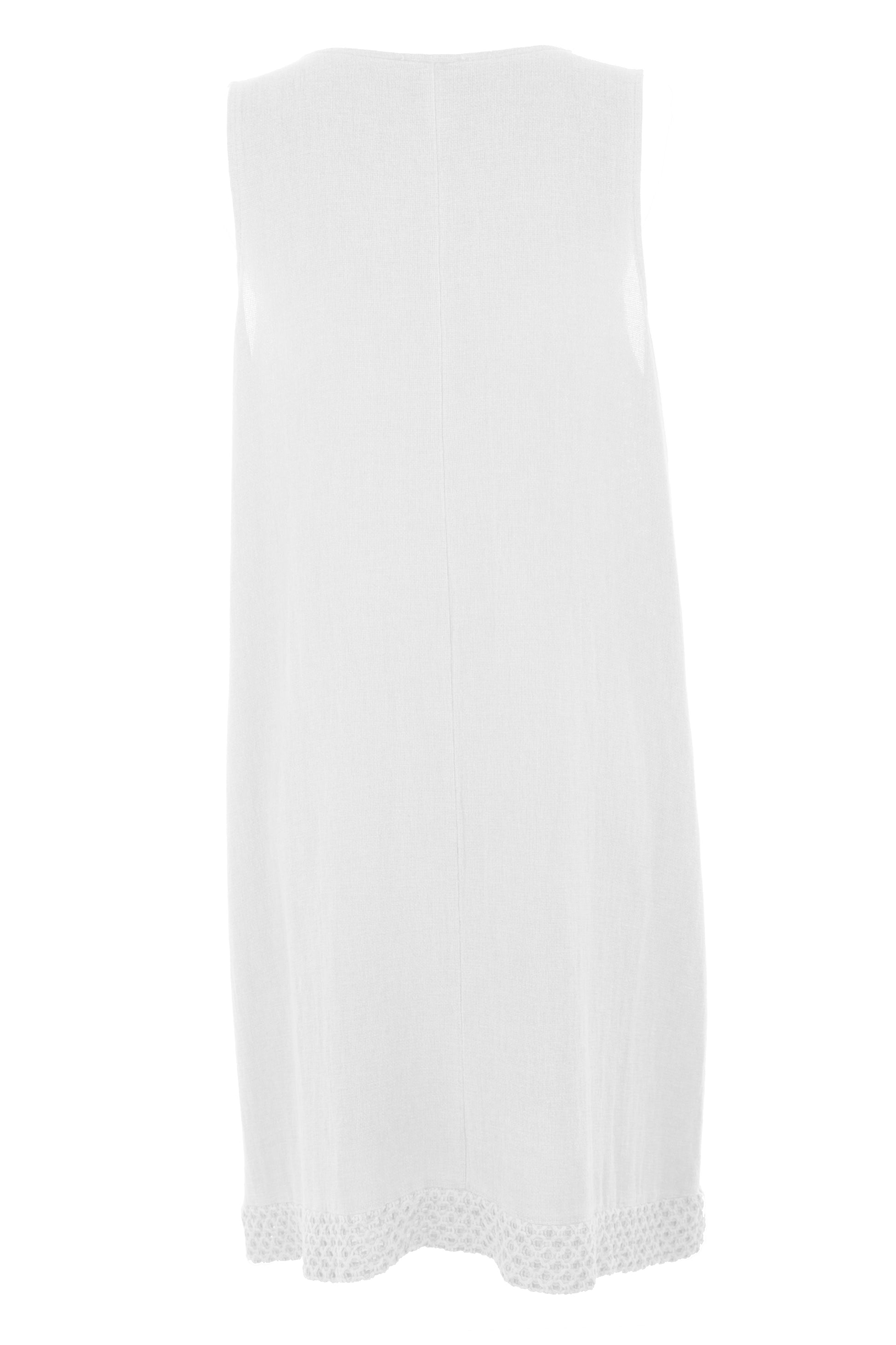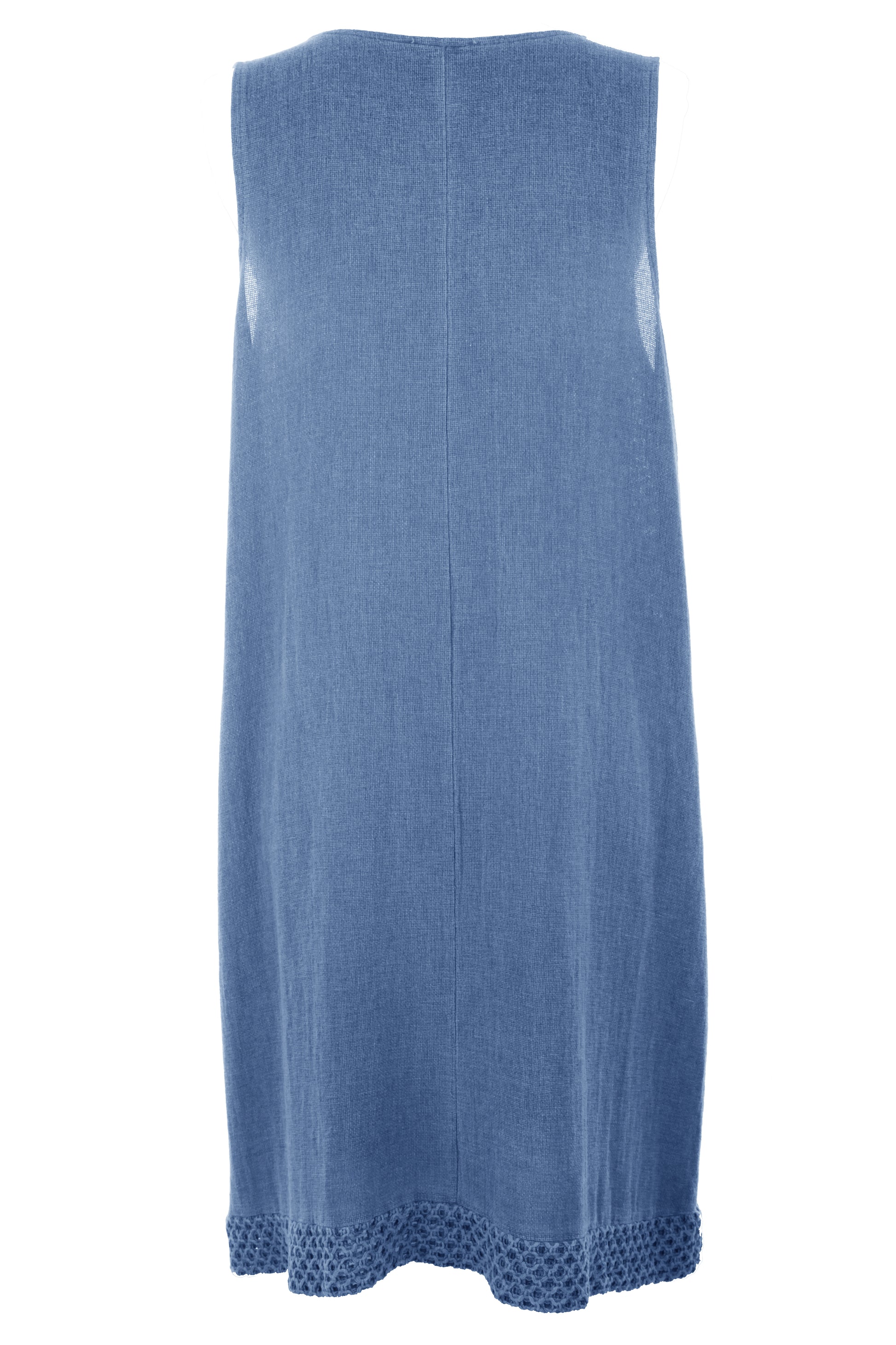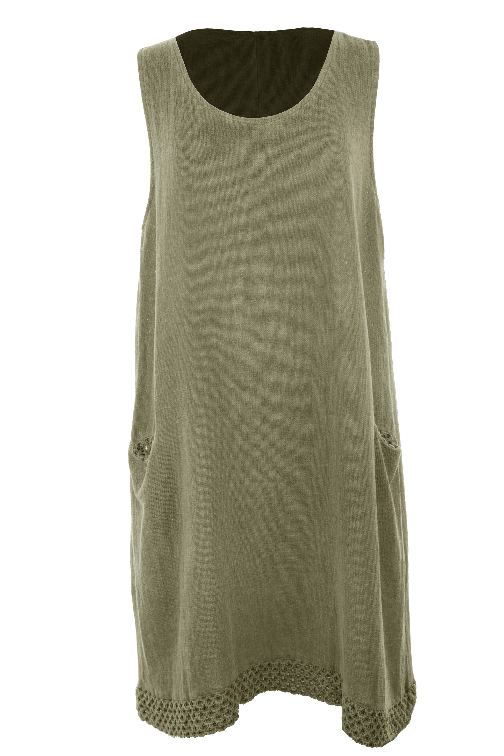 This sleeveless dress features crochet trim along the hemline and pocket openings adds a charming, artisan finishing touch to the dress.