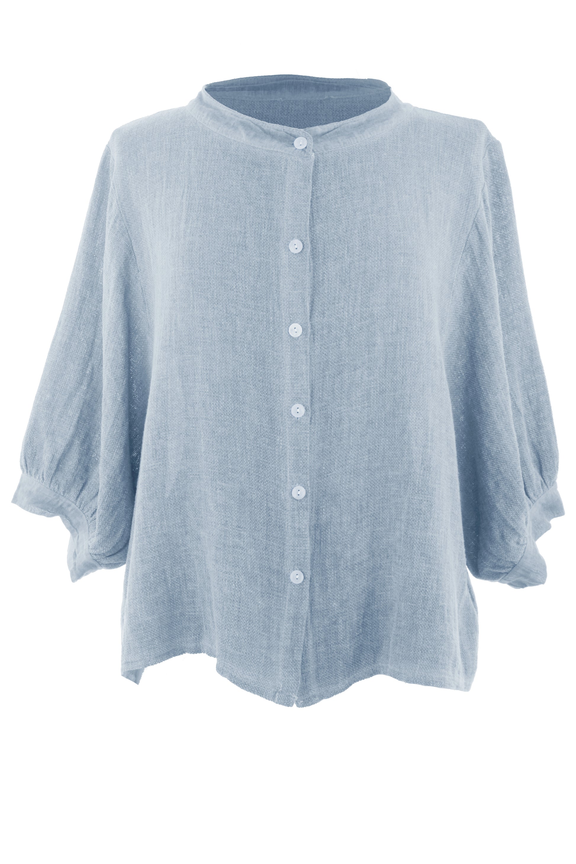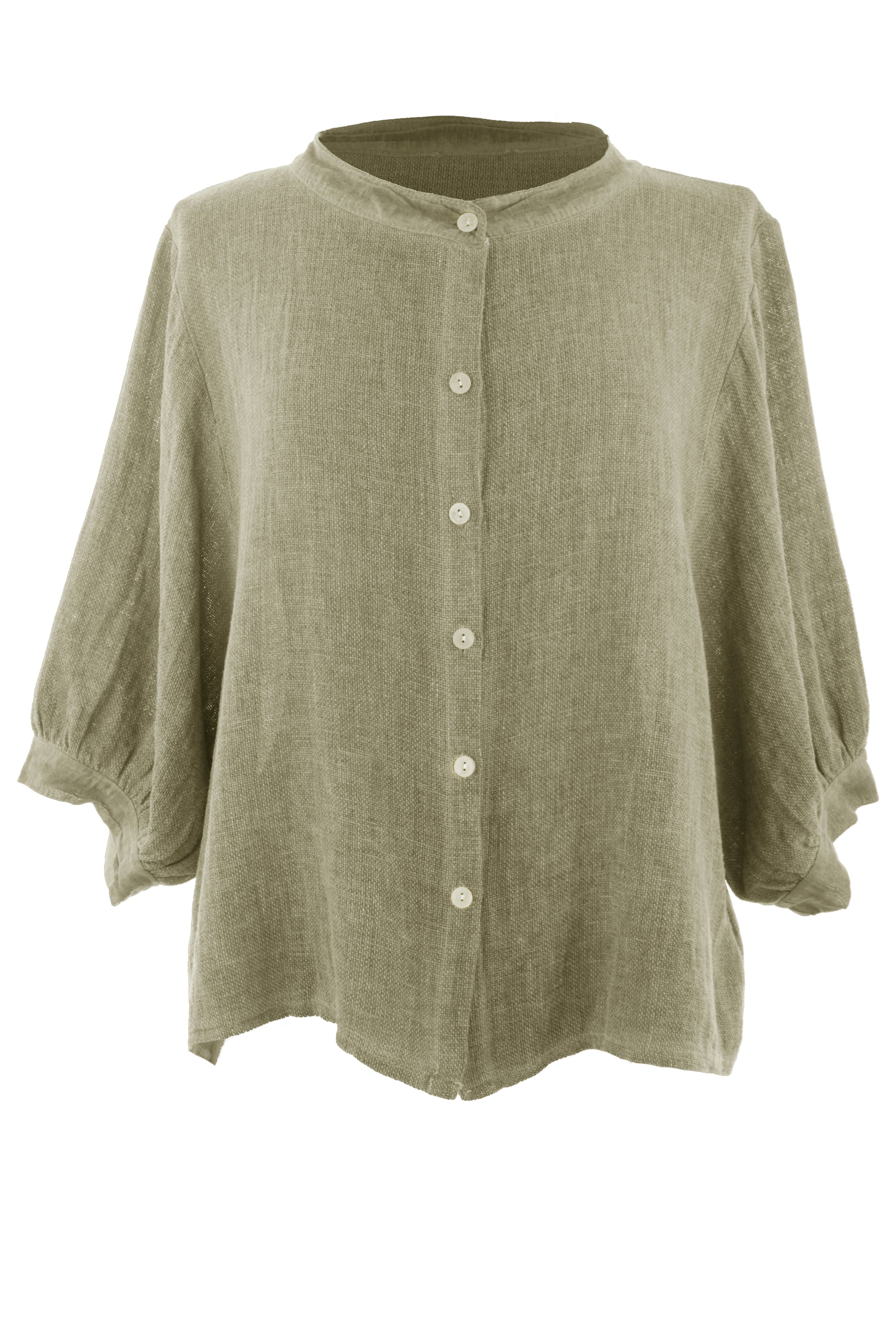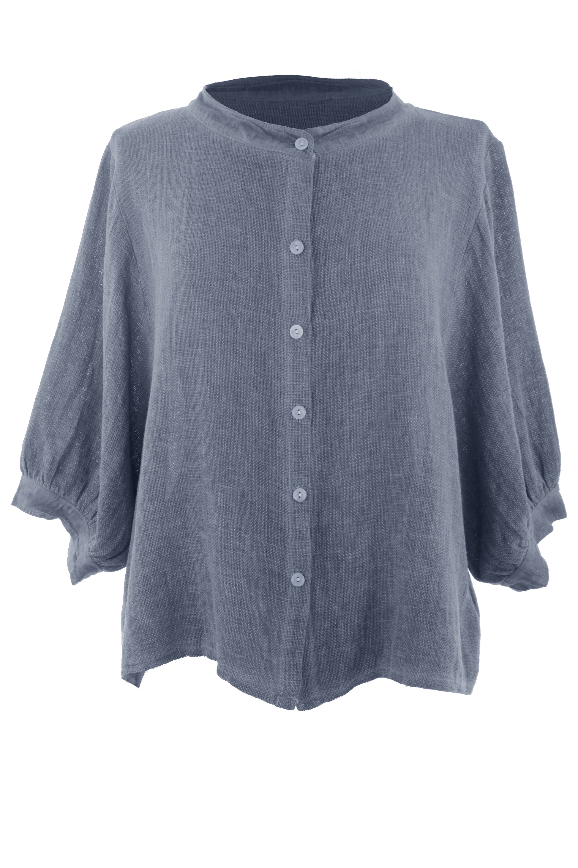 The relaxed Lagenlook design features a sophisticated mandarin collar neck and a full button-front closure for easy wearing.