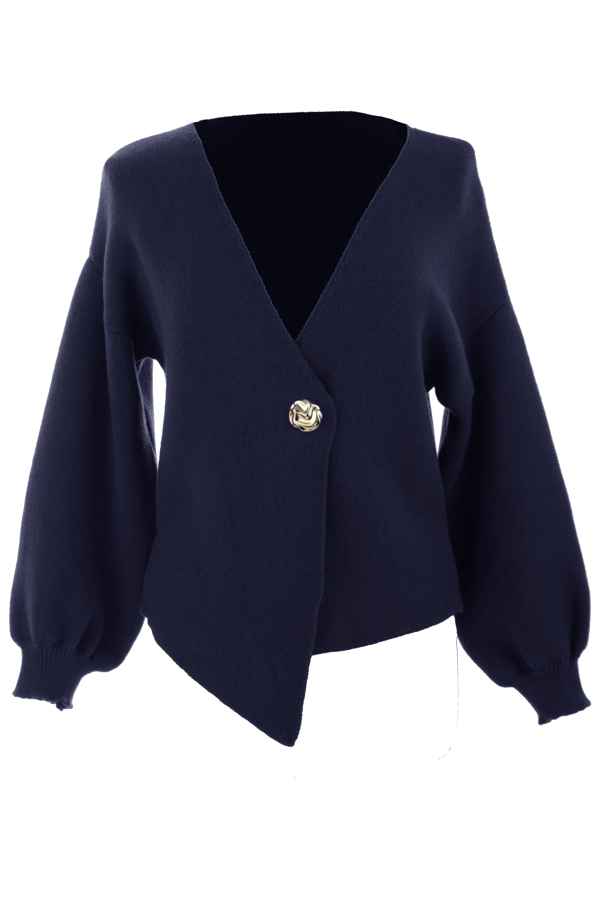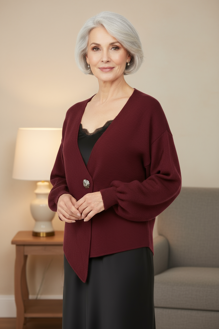 The single decorative button closure adds a touch of refinement, while the generous cut ensures a comfortable, flattering fit for various body types.