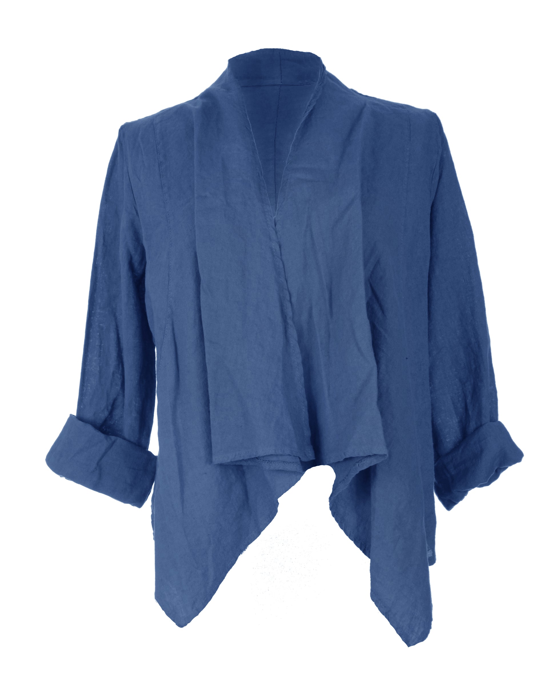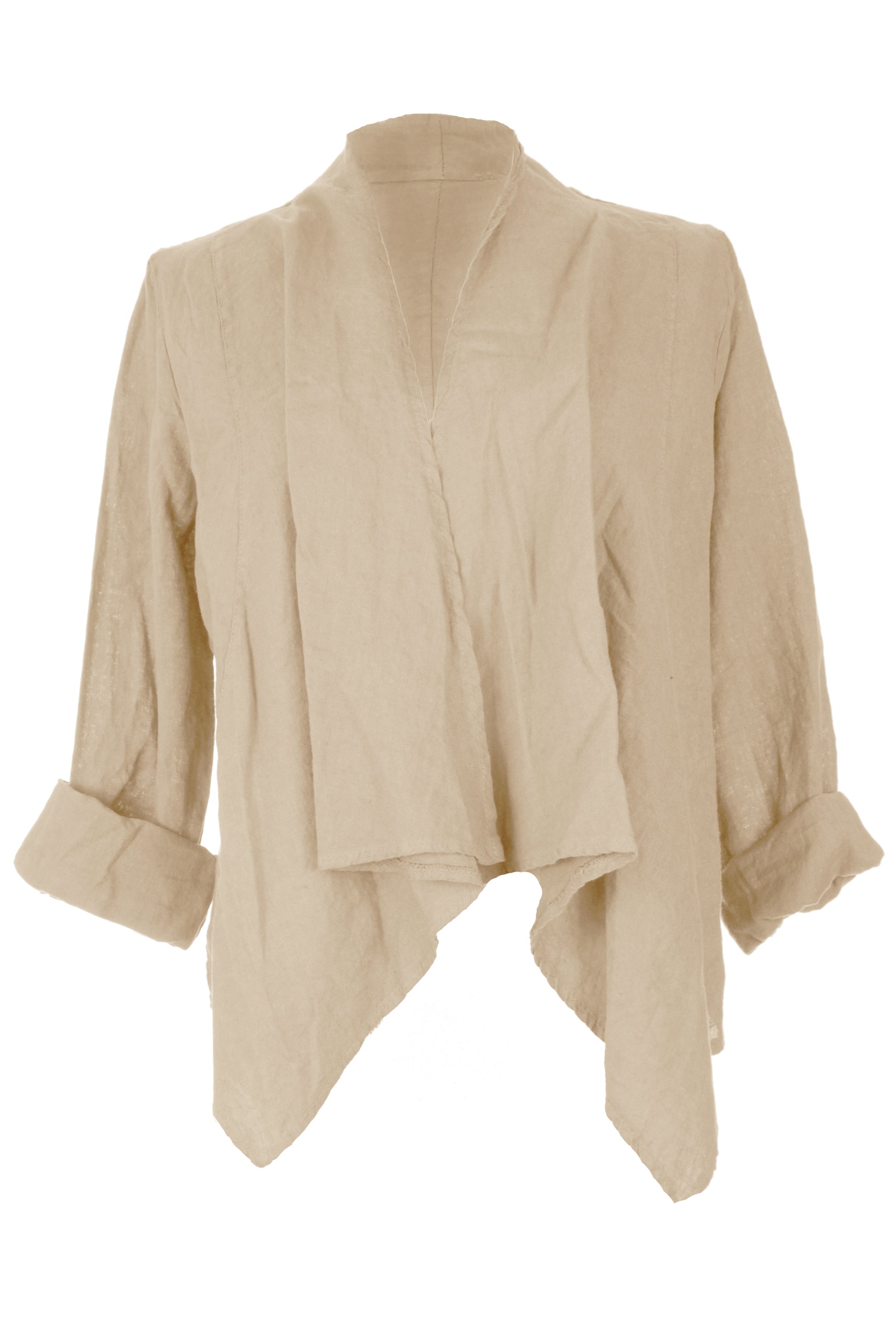 Elevate your wardrobe with this sophisticated Italian-style linen jacket, designed with a distinctive waterfall front that creates an elegant, flowing silhouette.