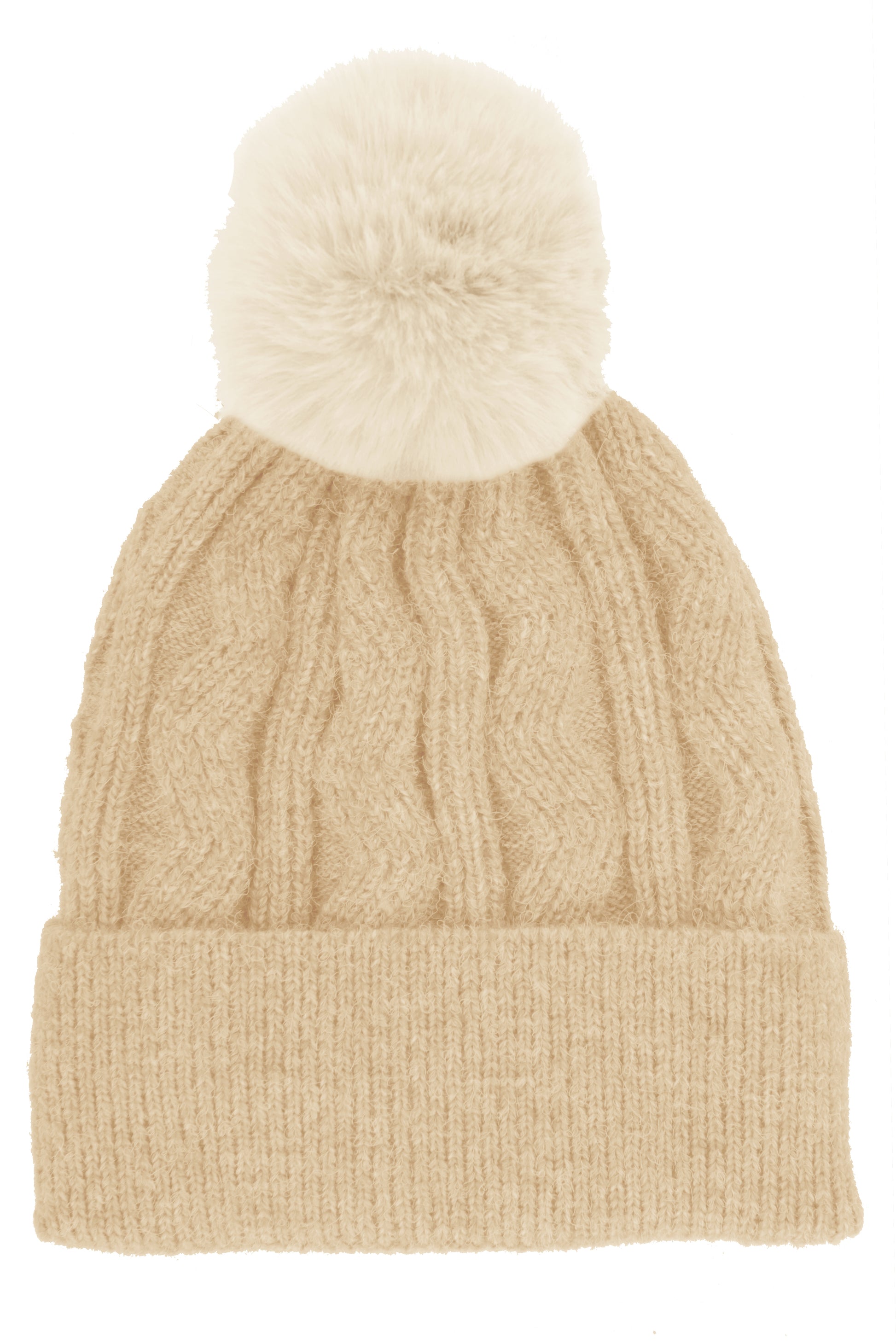 The plush faux fur bobble adds a playful yet chic accent, while the fleece lining ensures supreme insulation against the chill.